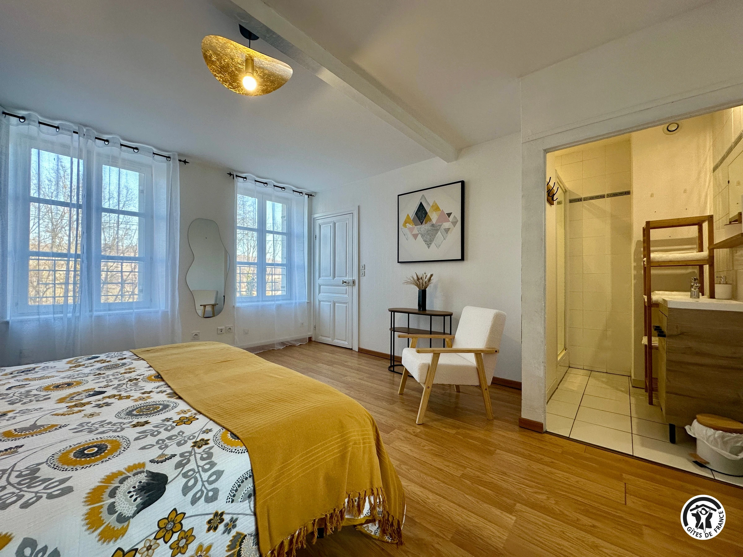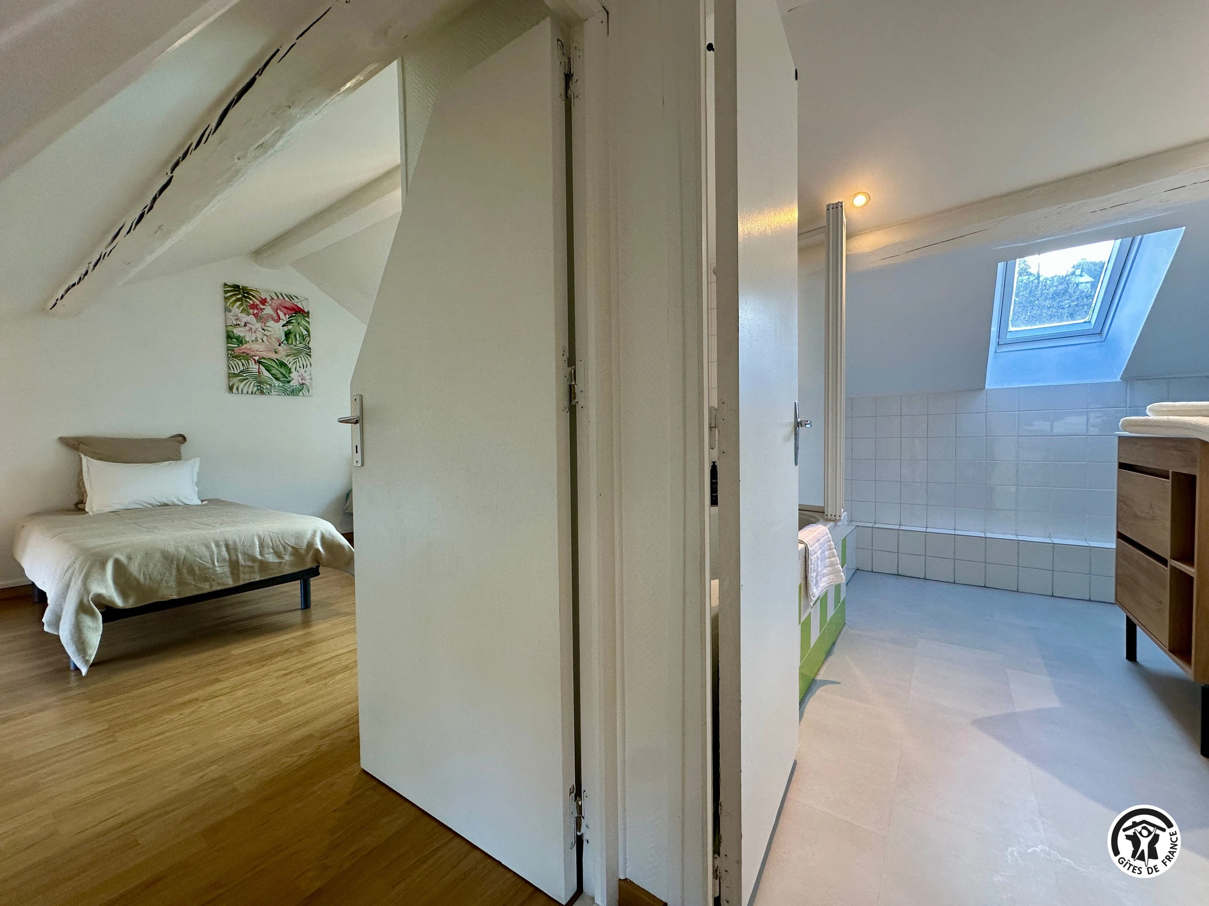 Just 12 minutes from Dijon, in the Ouche Valley, this holiday cottage is located on the first floor of a house with several apartments, very close to the motorway exit in Velars-sur-Ouche. Access to this 6-person cottage is via a private staircase. The ground floor comprises a large, fully equipped kitchen (oven, dishwasher, microwave, and washing machine) opening onto a comfortable living room with a flat-screen TV and Wi-Fi. There is also a separate toilet and a bedroom with a 160 x 190 cm bed and an en-suite shower room.