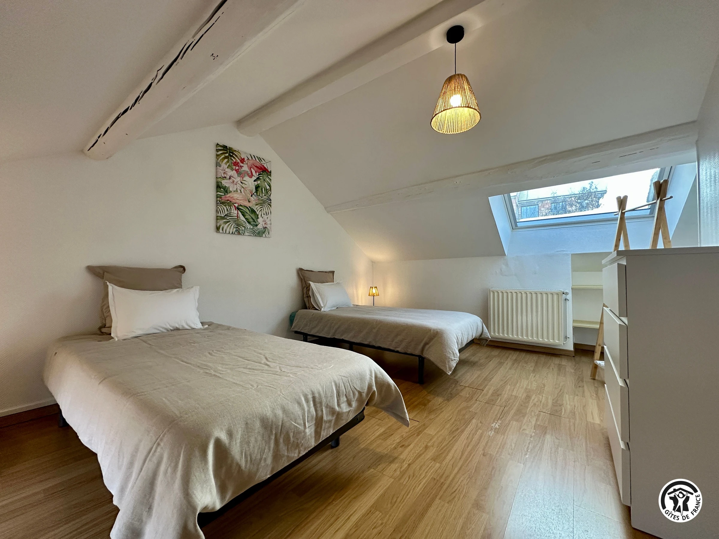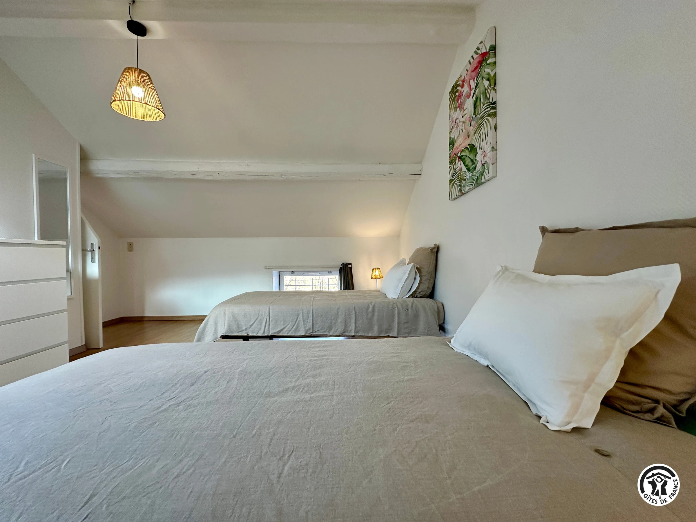 Upstairs, you will find a bedroom with a 160 x 190 cm bed and a bedroom with two 90 x 190 cm beds that can be joined together. A bathroom with a toilet is located on the landing.