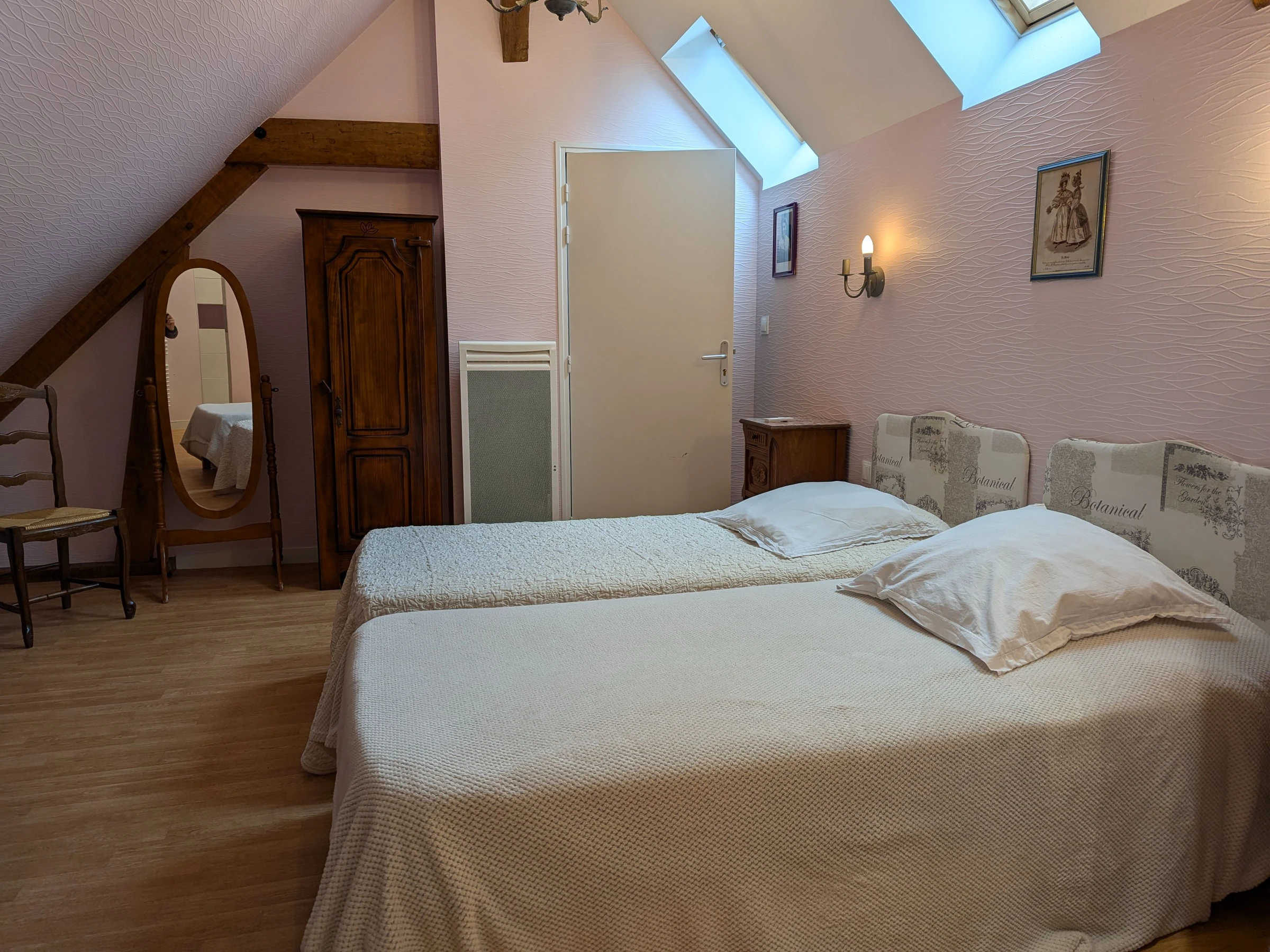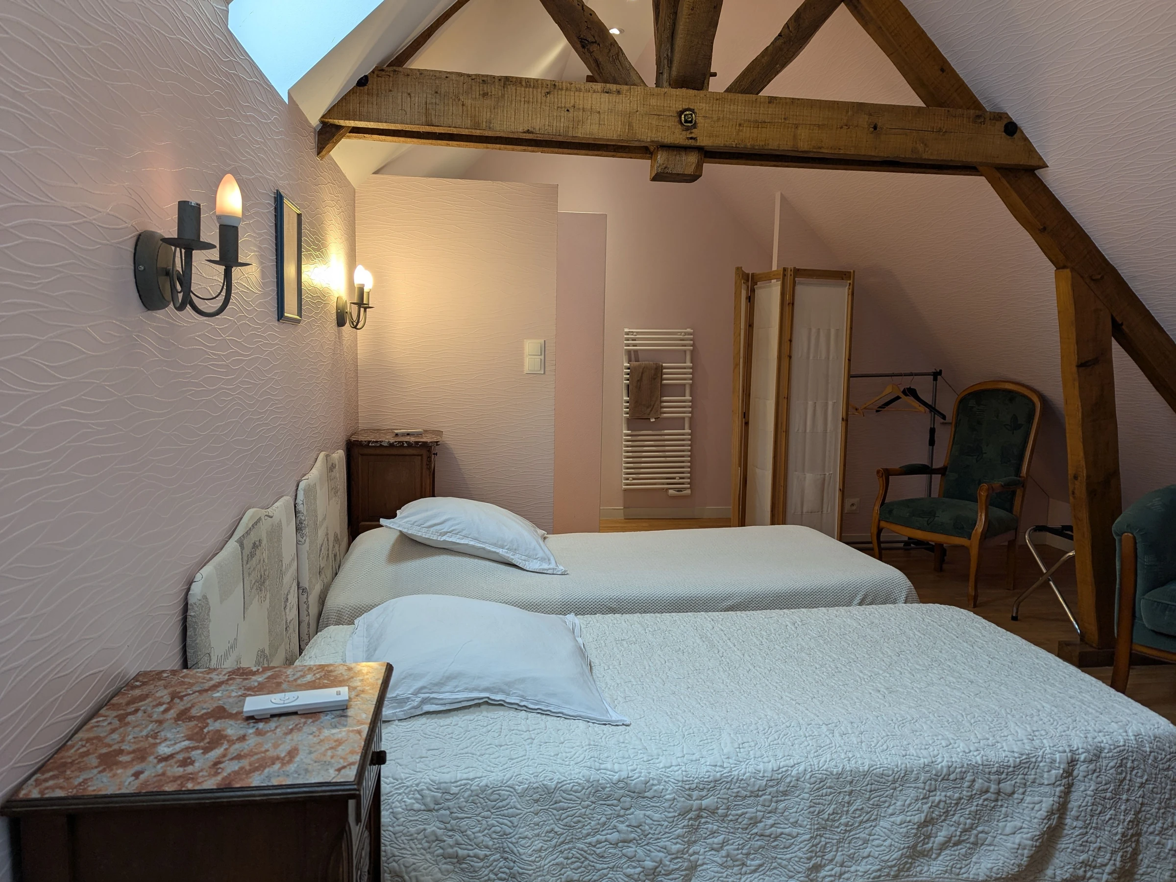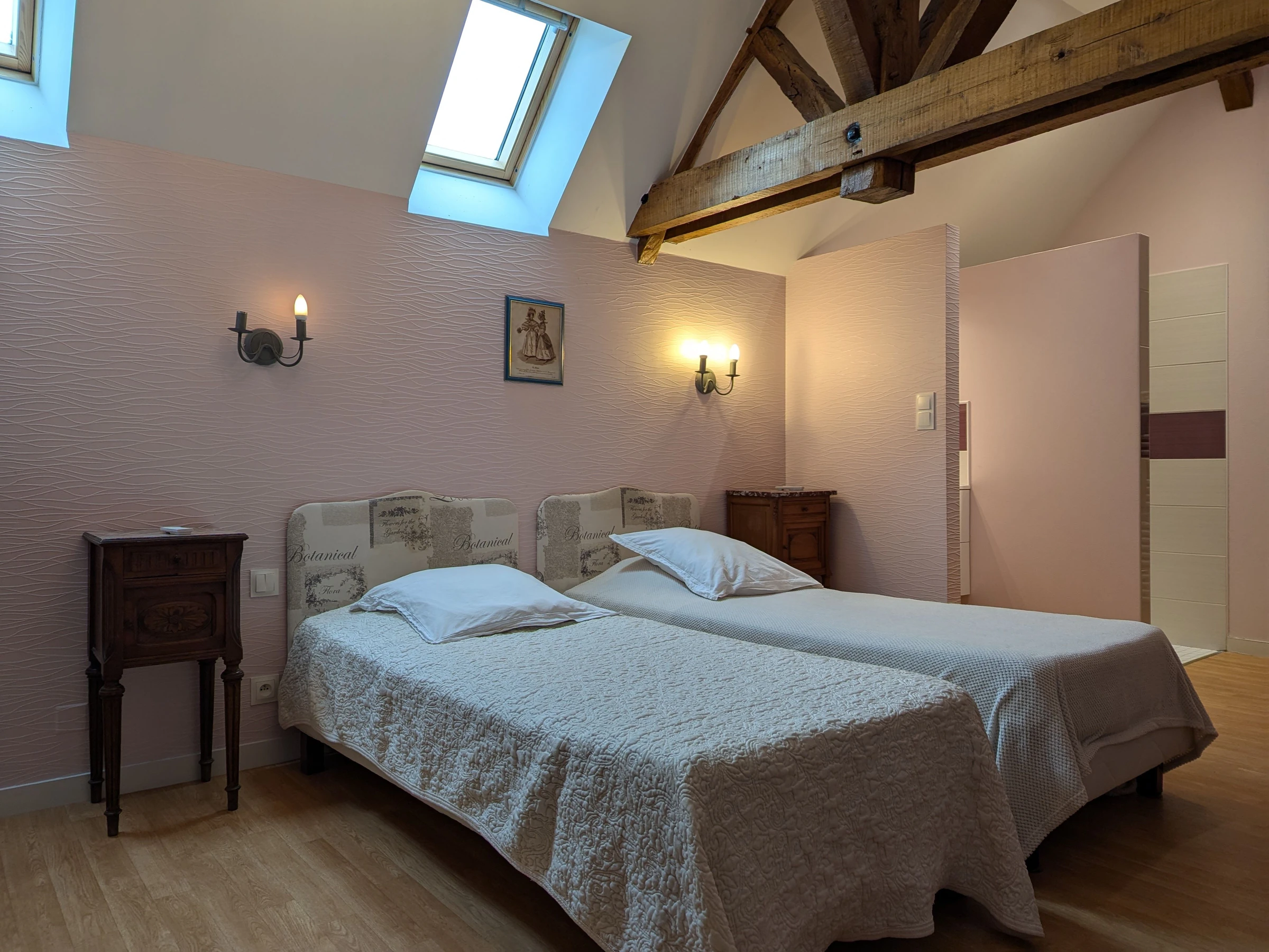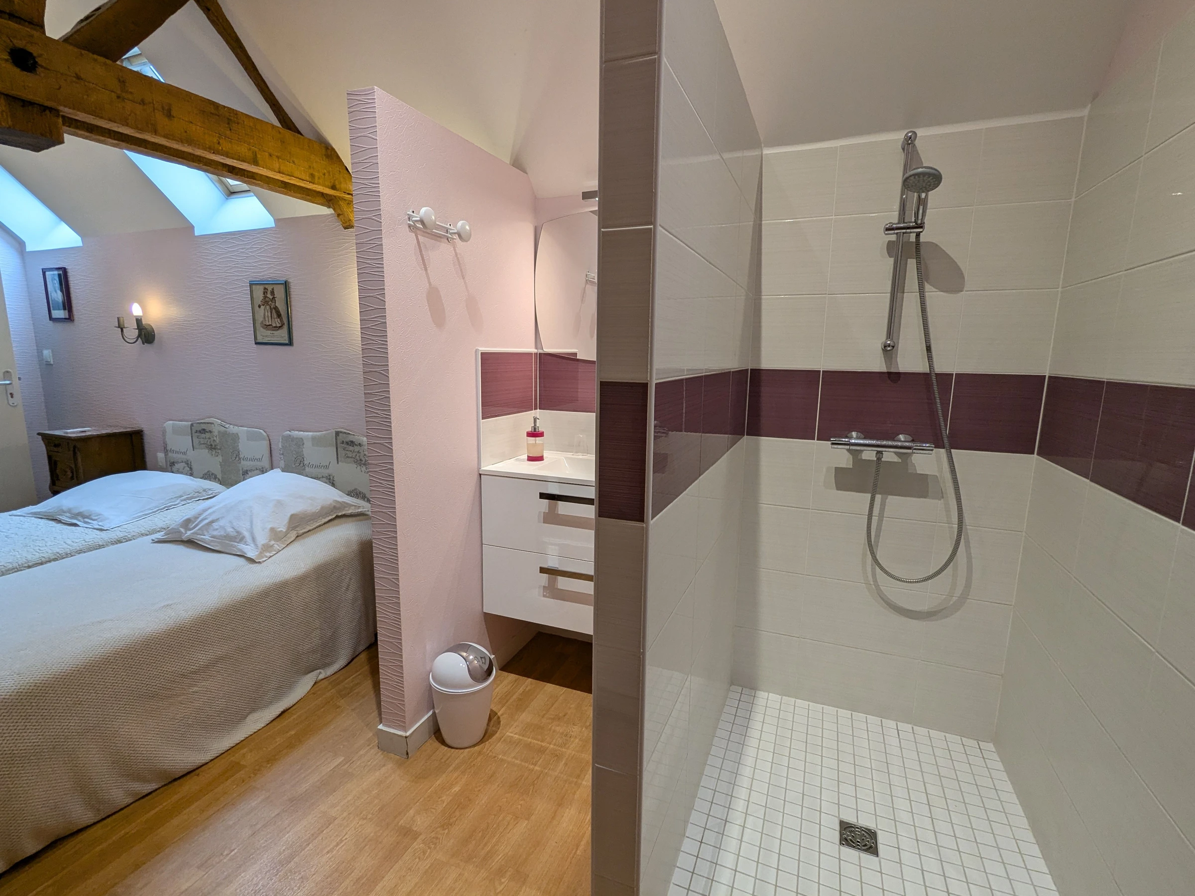 Upstairs: two attic bedrooms. Bedroom 2 with two 90x190 cm beds and its open bathroom (shower, sink, toilet. A screen is available). Bedroom 3 has its en-suite bathroom separated by a curtain. The single beds can be pushed together to make a double bed.
