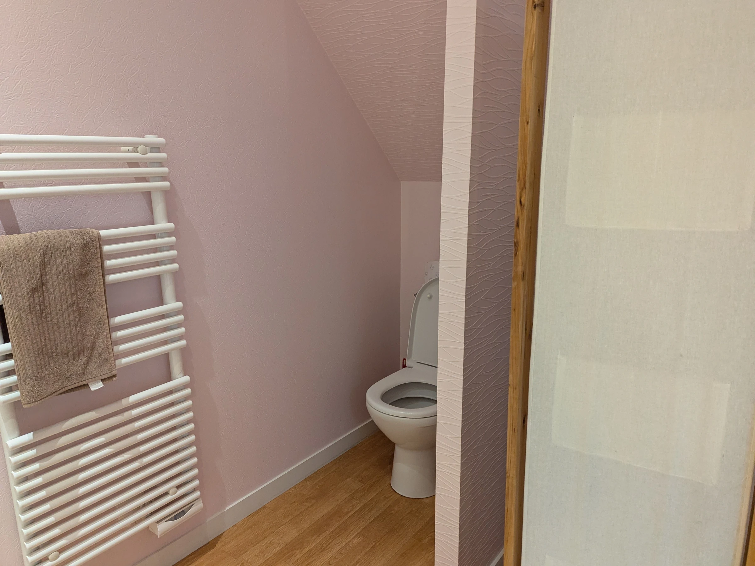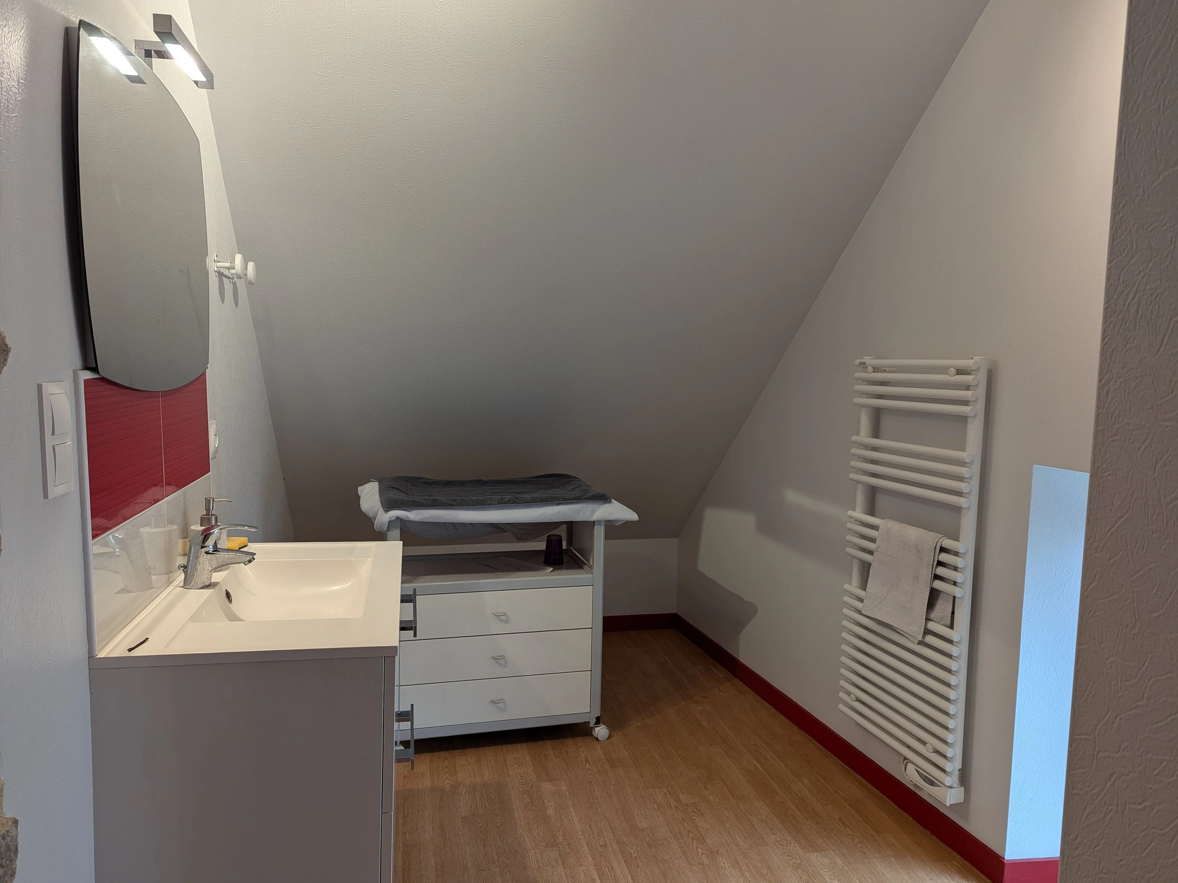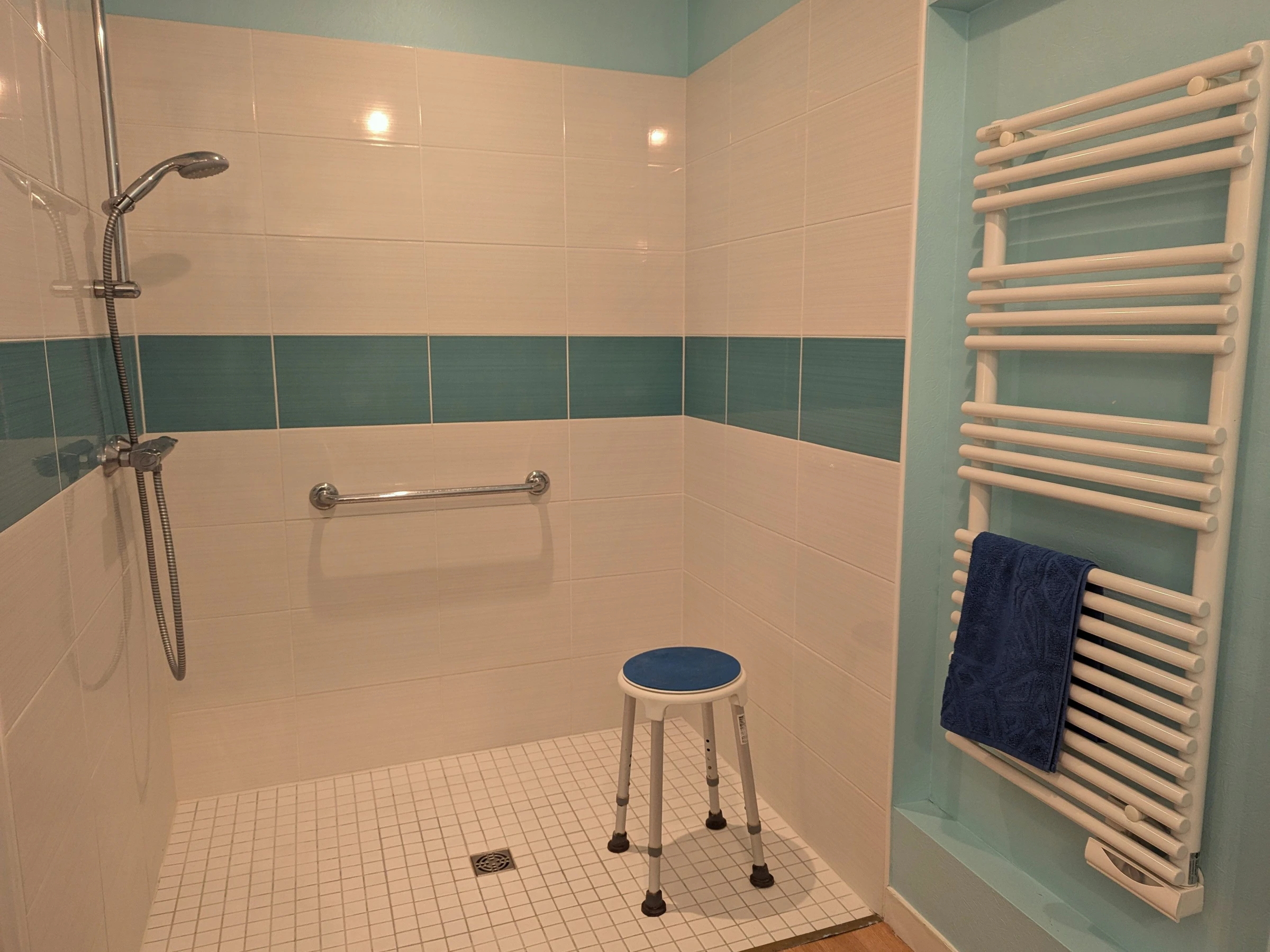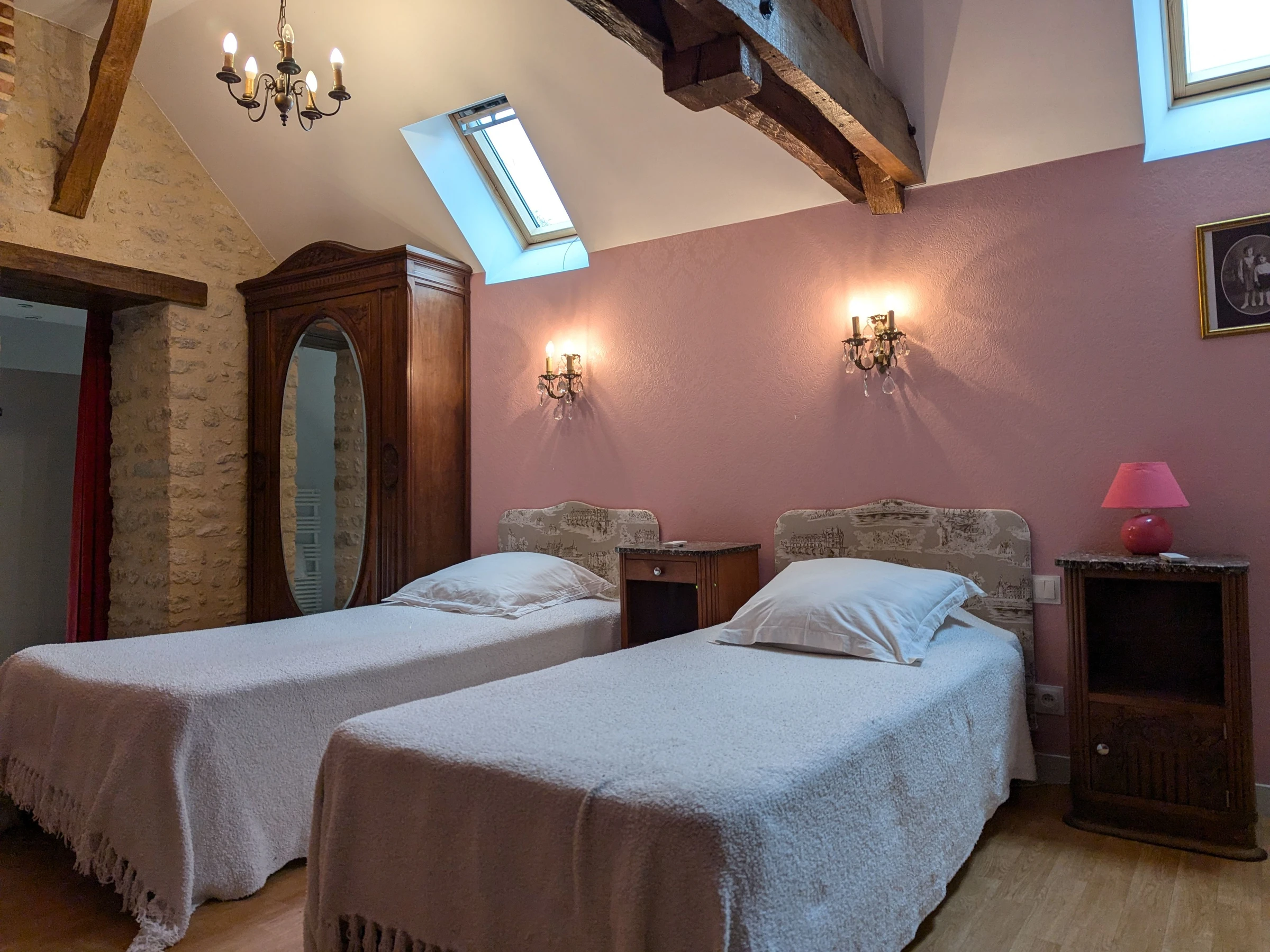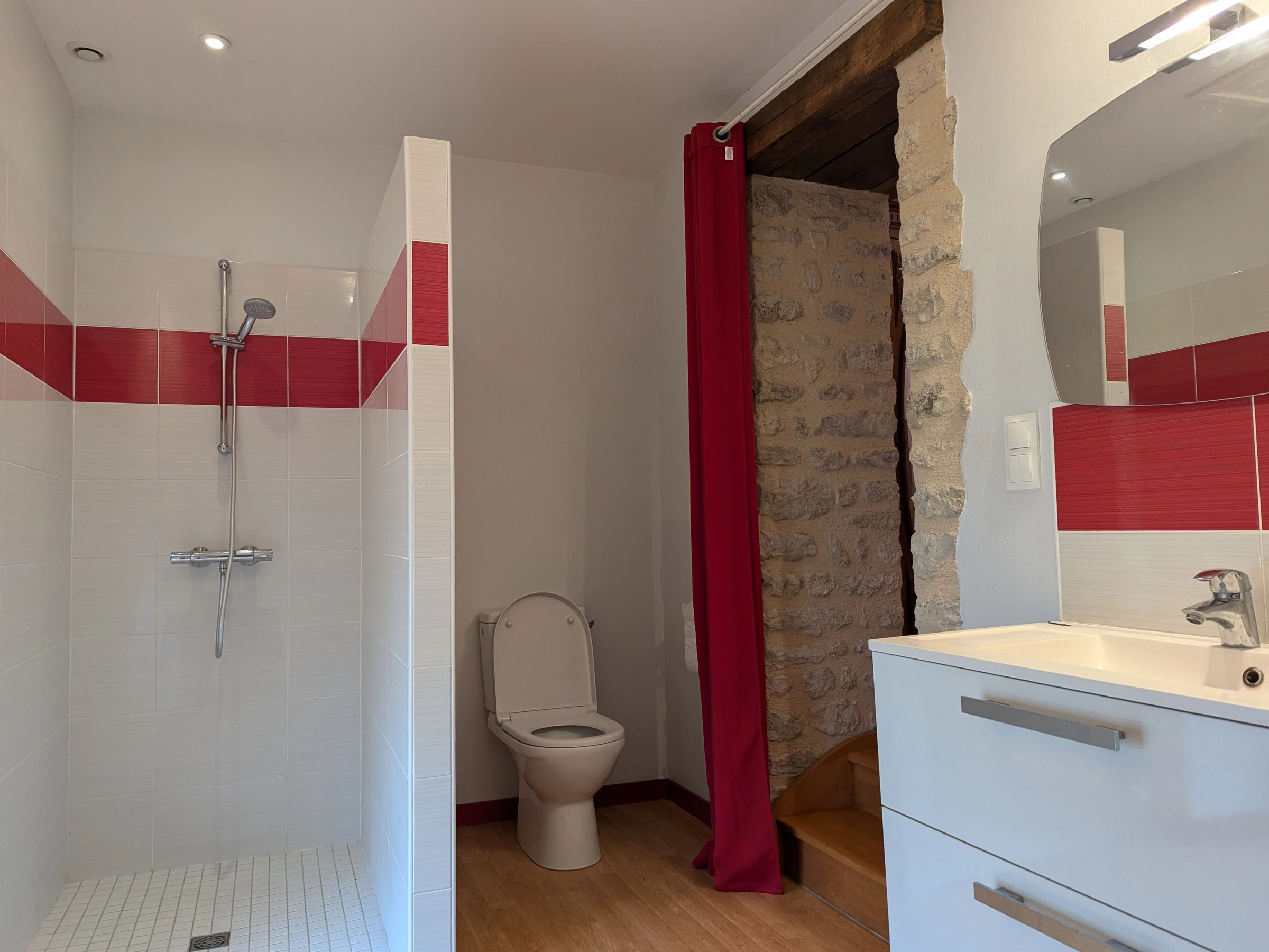 Upstairs: two attic bedrooms. Bedroom 2 with two 90x190 cm beds and its open bathroom (shower, sink, toilet. A screen is available). Bedroom 3 has its en-suite bathroom separated by a curtain. The single beds can be pushed together to make a double bed.