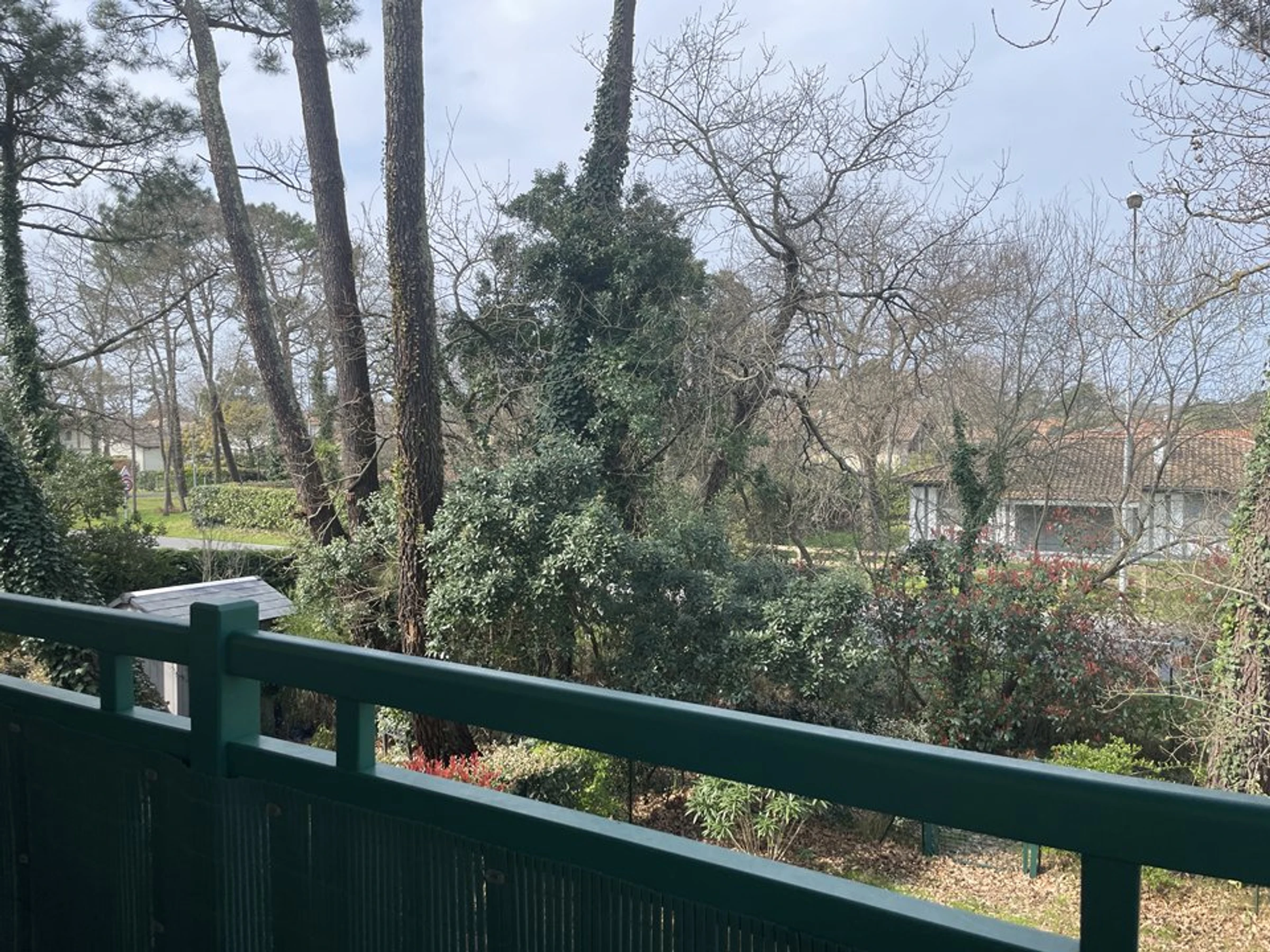 Covered balcony of 11m² with garden furniture, sunshade and deckchairs, facing the street.