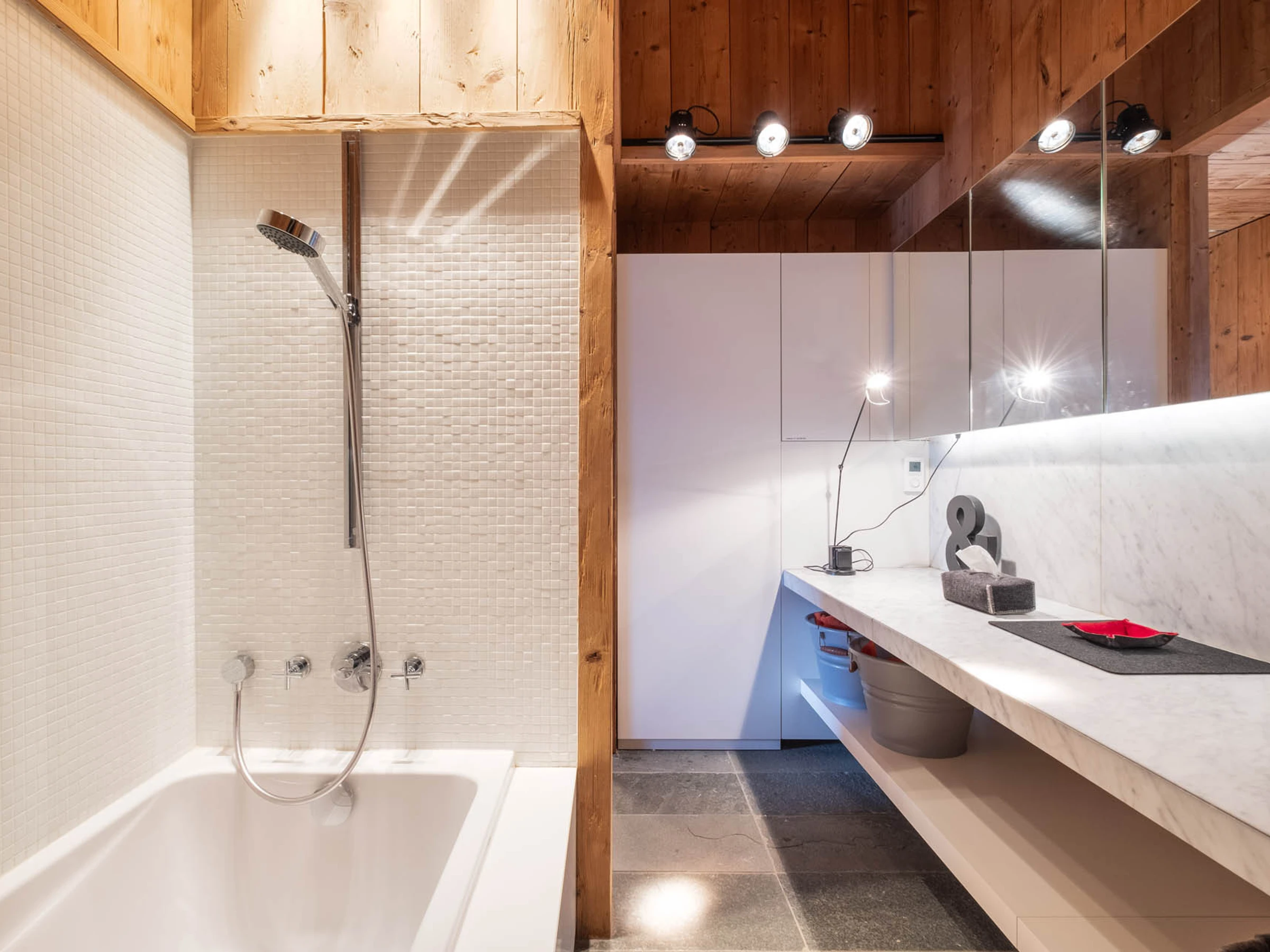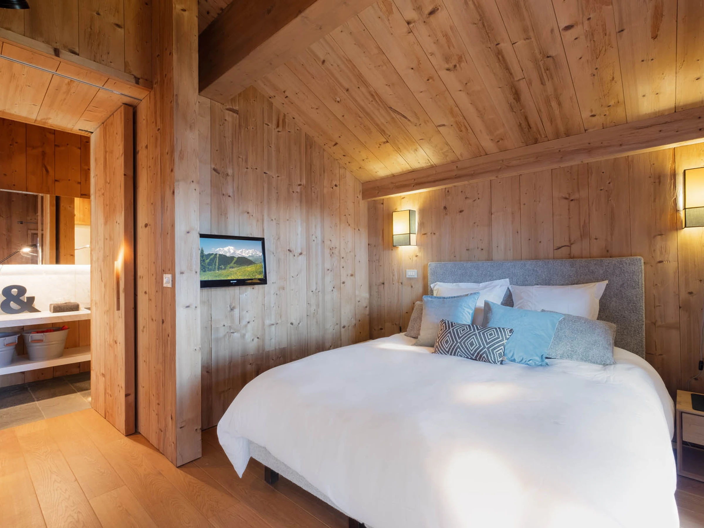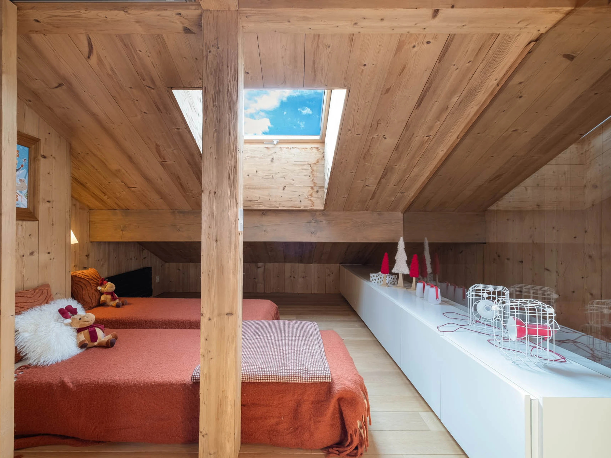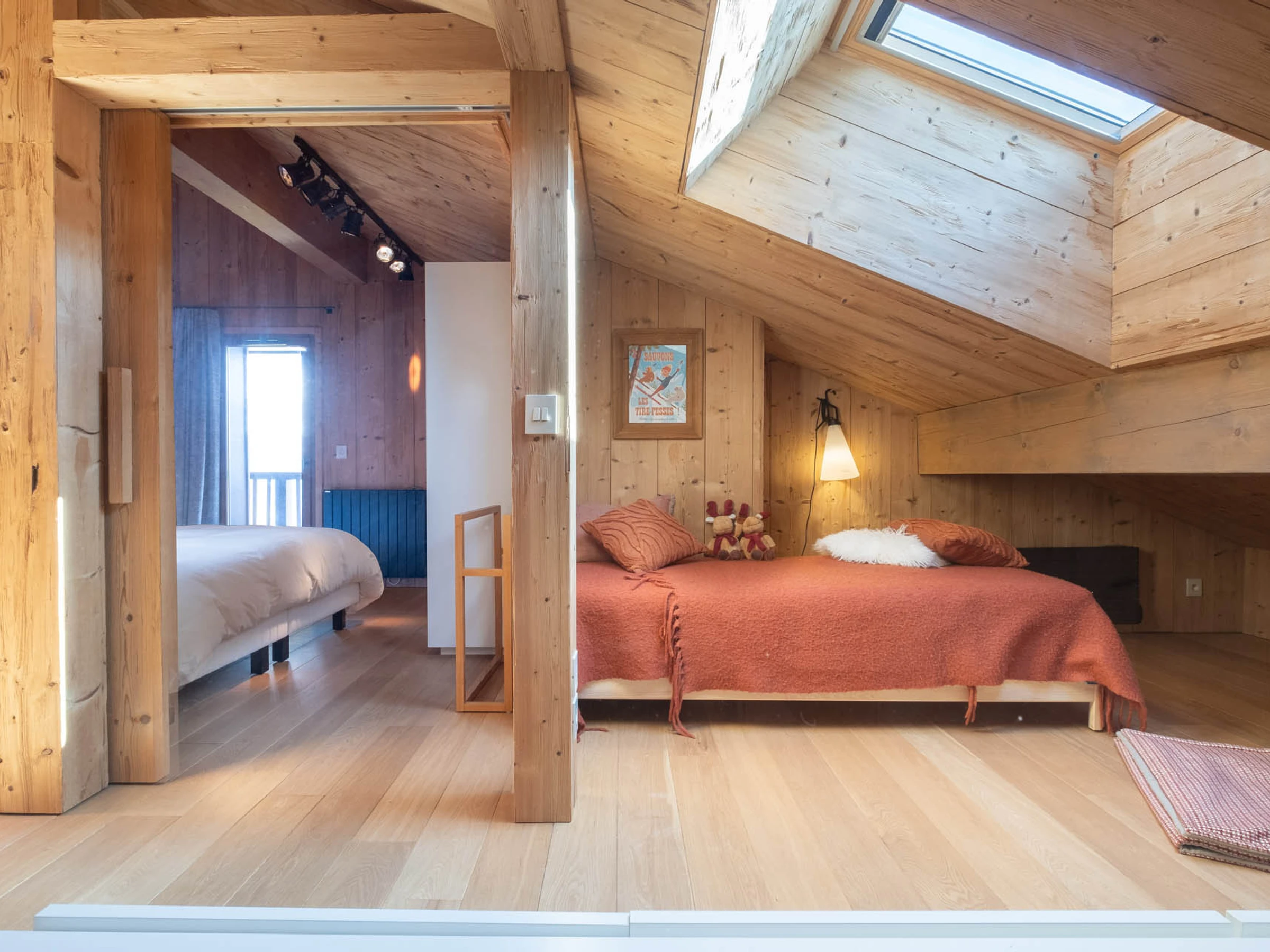 This top-floor duplex, with elevator, offers a large, bright living room with open kitchen and panoramic views of the Beaufortain valley and Mont-Blanc. The living area combines comfort and conviviality, perfect for spending time with family and friends. You'll be able to enjoy a ski-in ski-out residence thanks to access to the blue “Rosière” slope as well as access to the residence's swimming pool in chalet H.