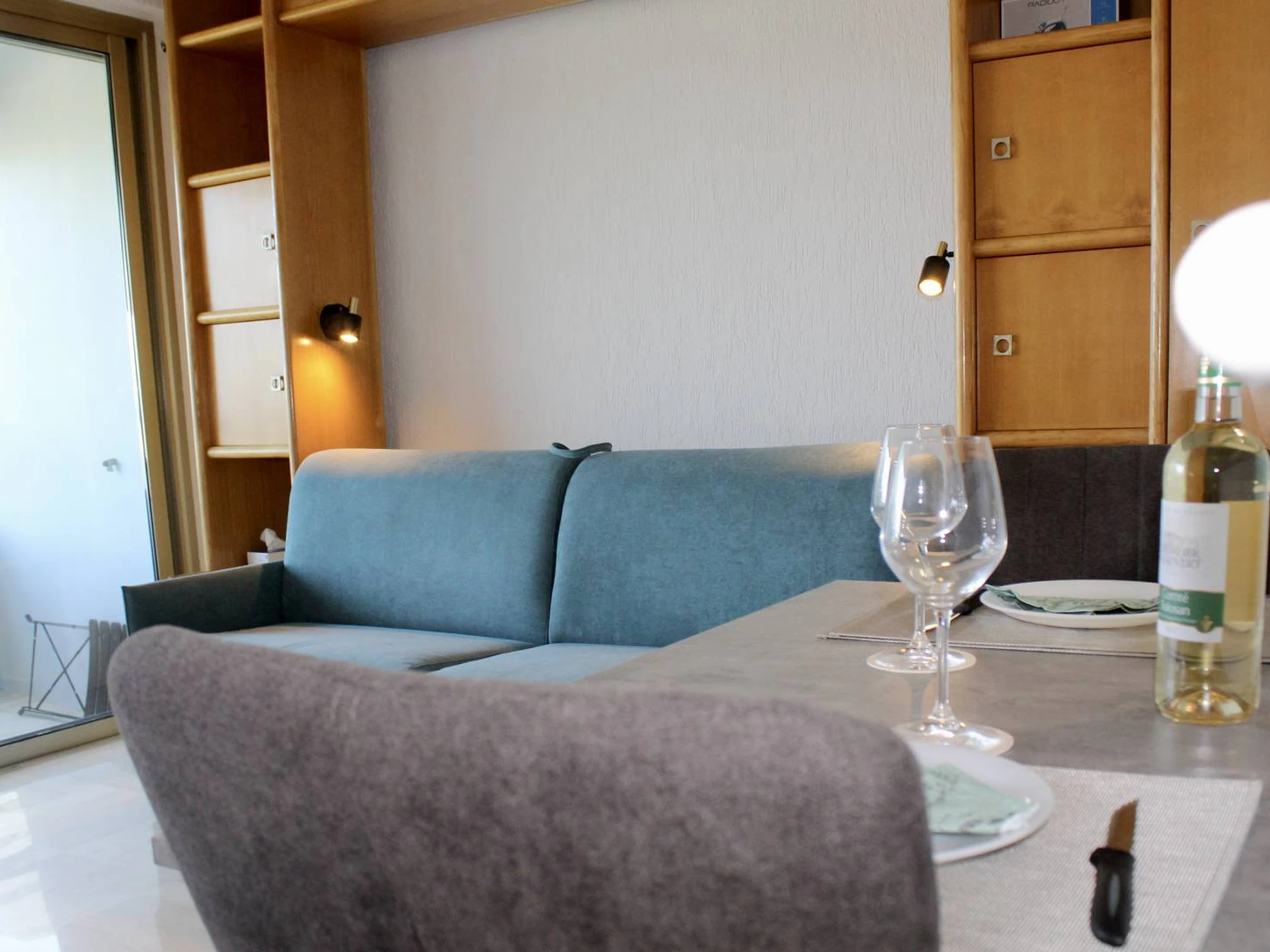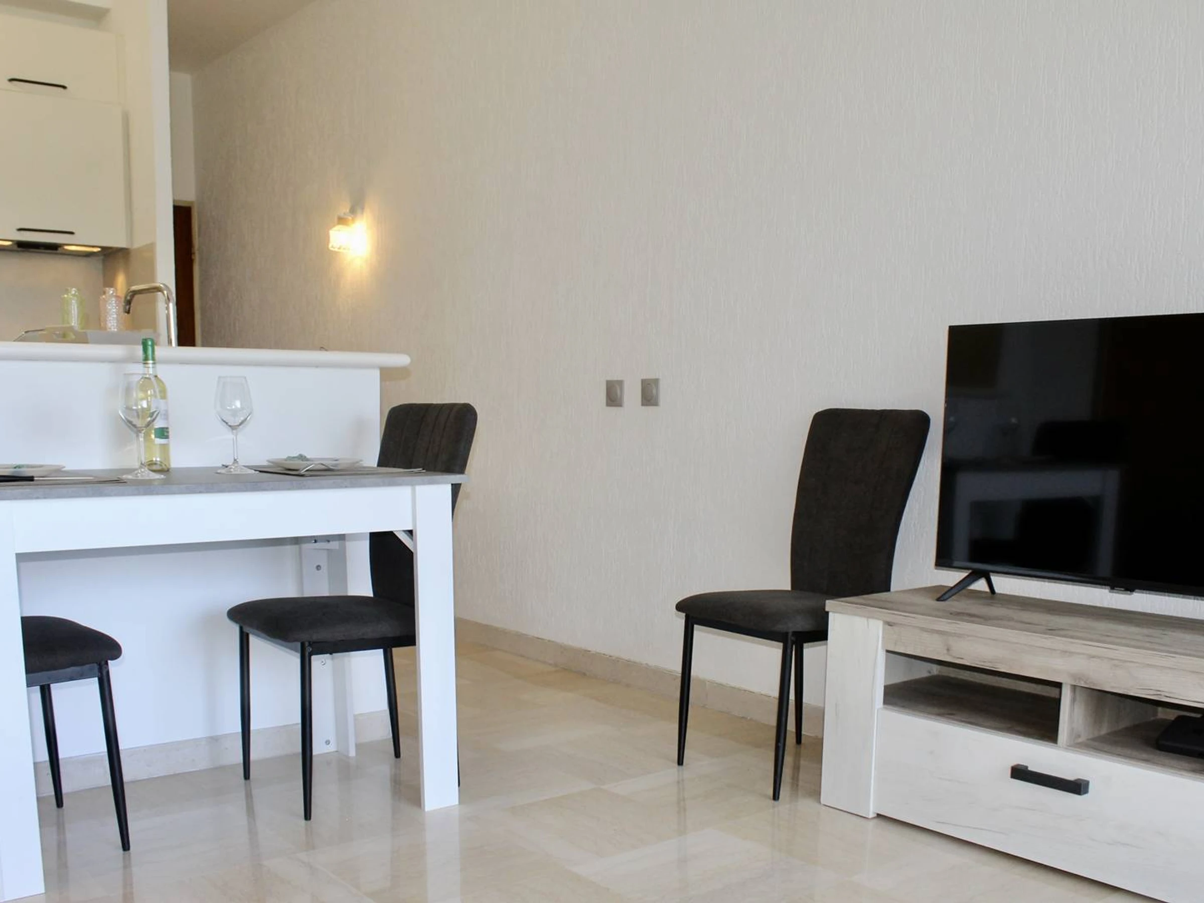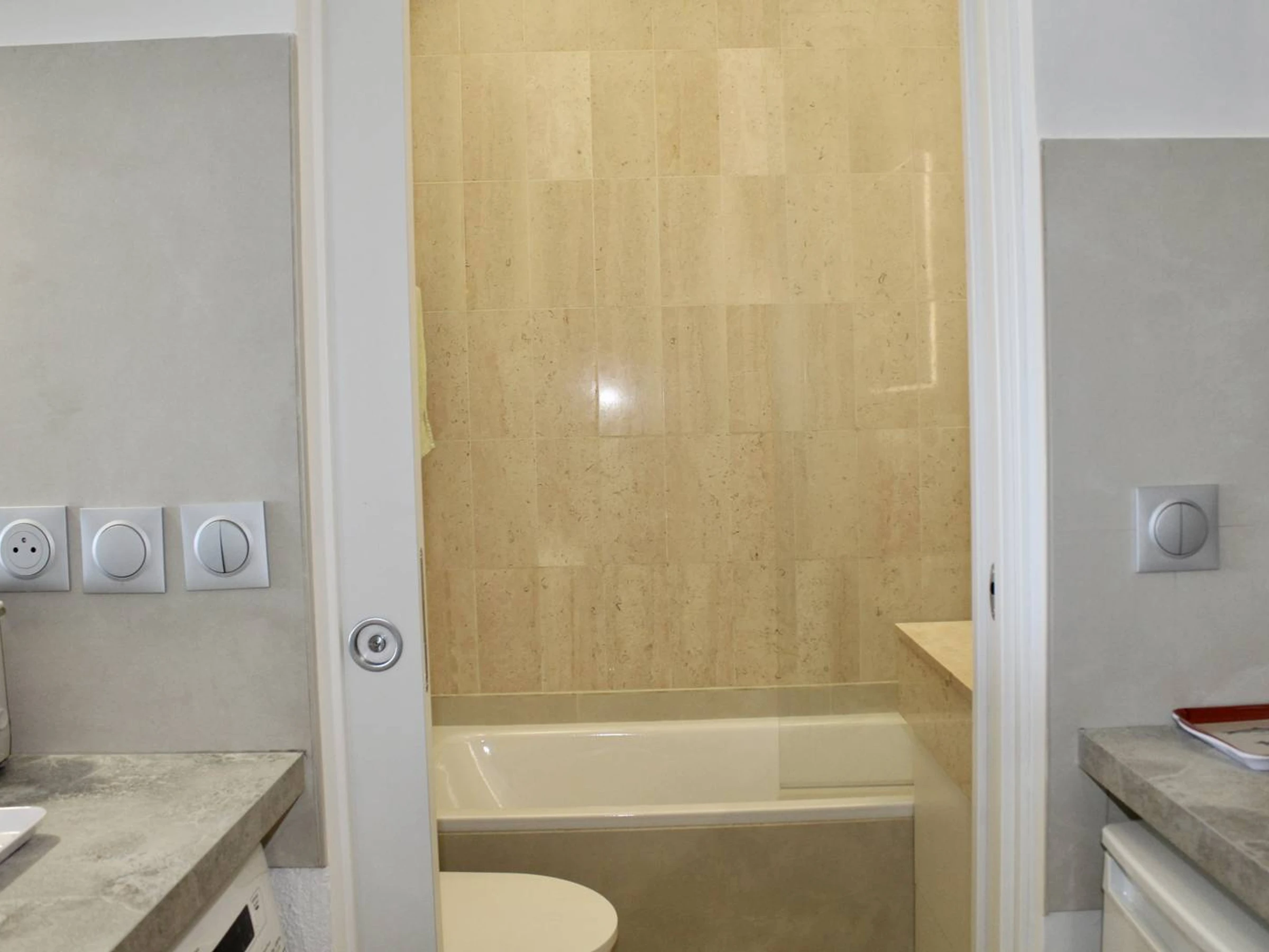 Located in the Le Baronnet residence 5 minutes from the sea, this pretty modern apartment, completely renovated on the 1st floor with elevator, is composed at the entrance of a sleeping area with bunk beds (80 cm), a fitted kitchen (oven, washing machine, 2-burner hob) with its bar open to the living room. A sofa bed of 140 cm giving access to the furnished terrace with garden furniture with a garden and sea view. A bathroom with toilet. Household linen is not provided.