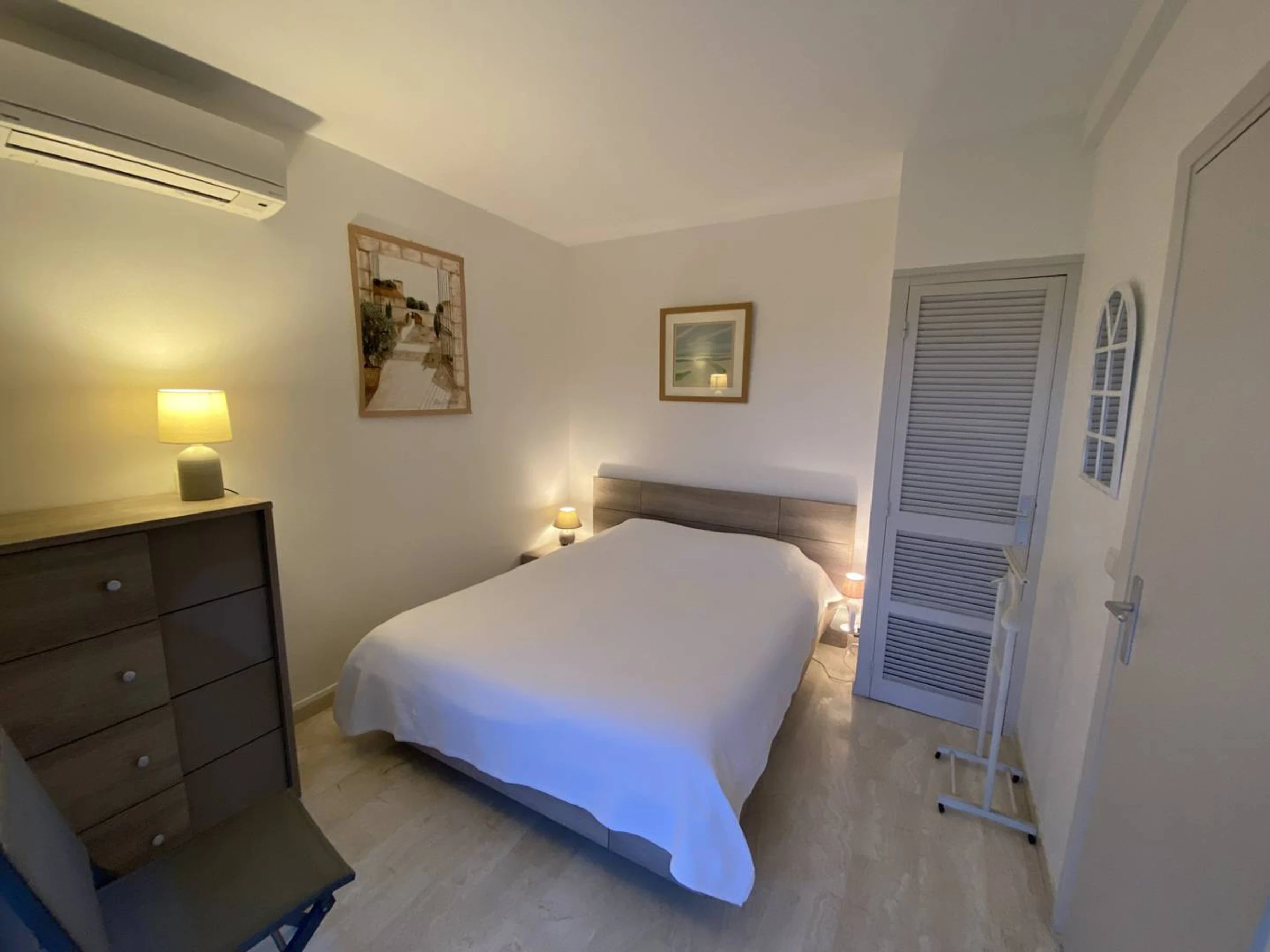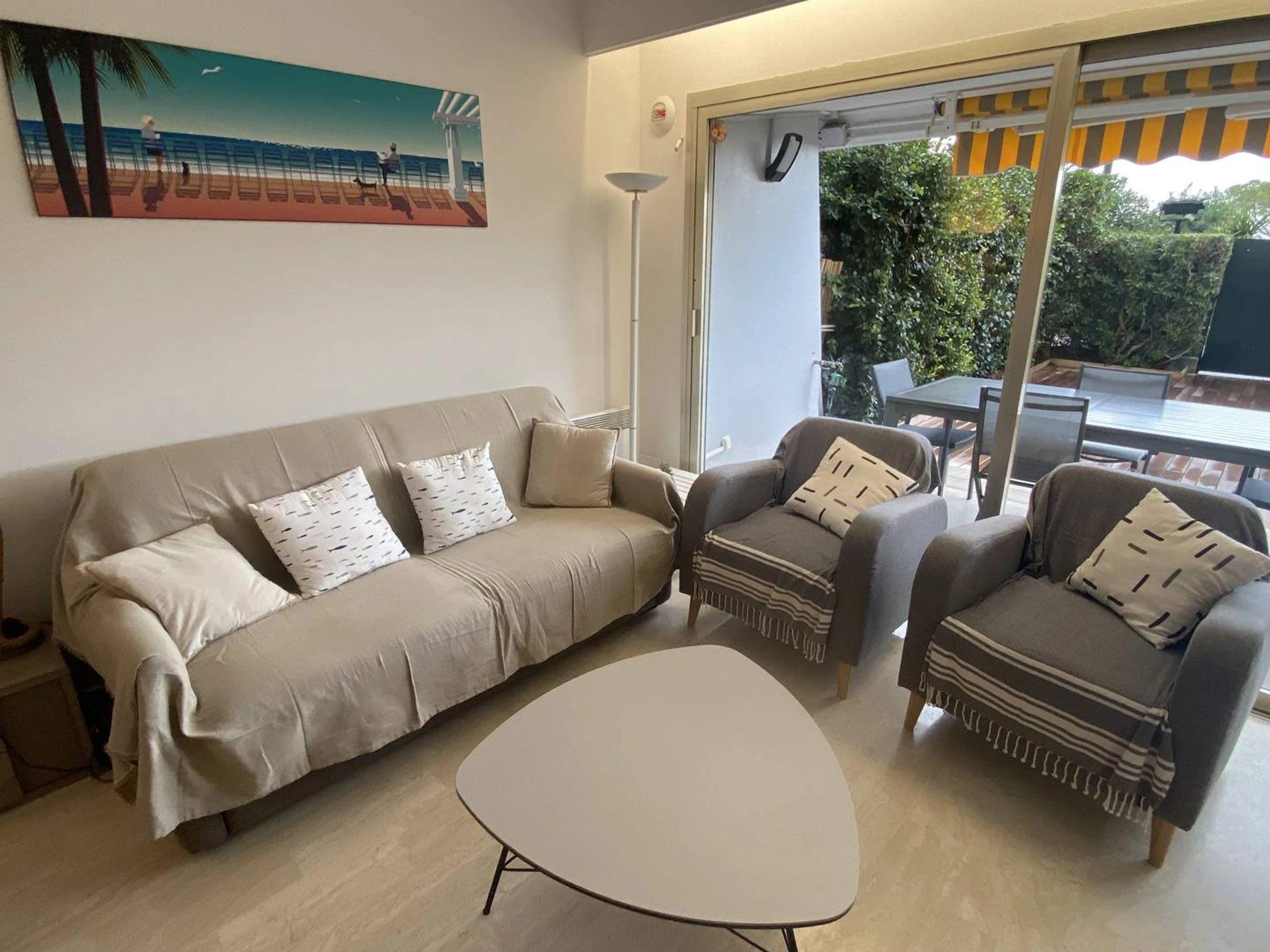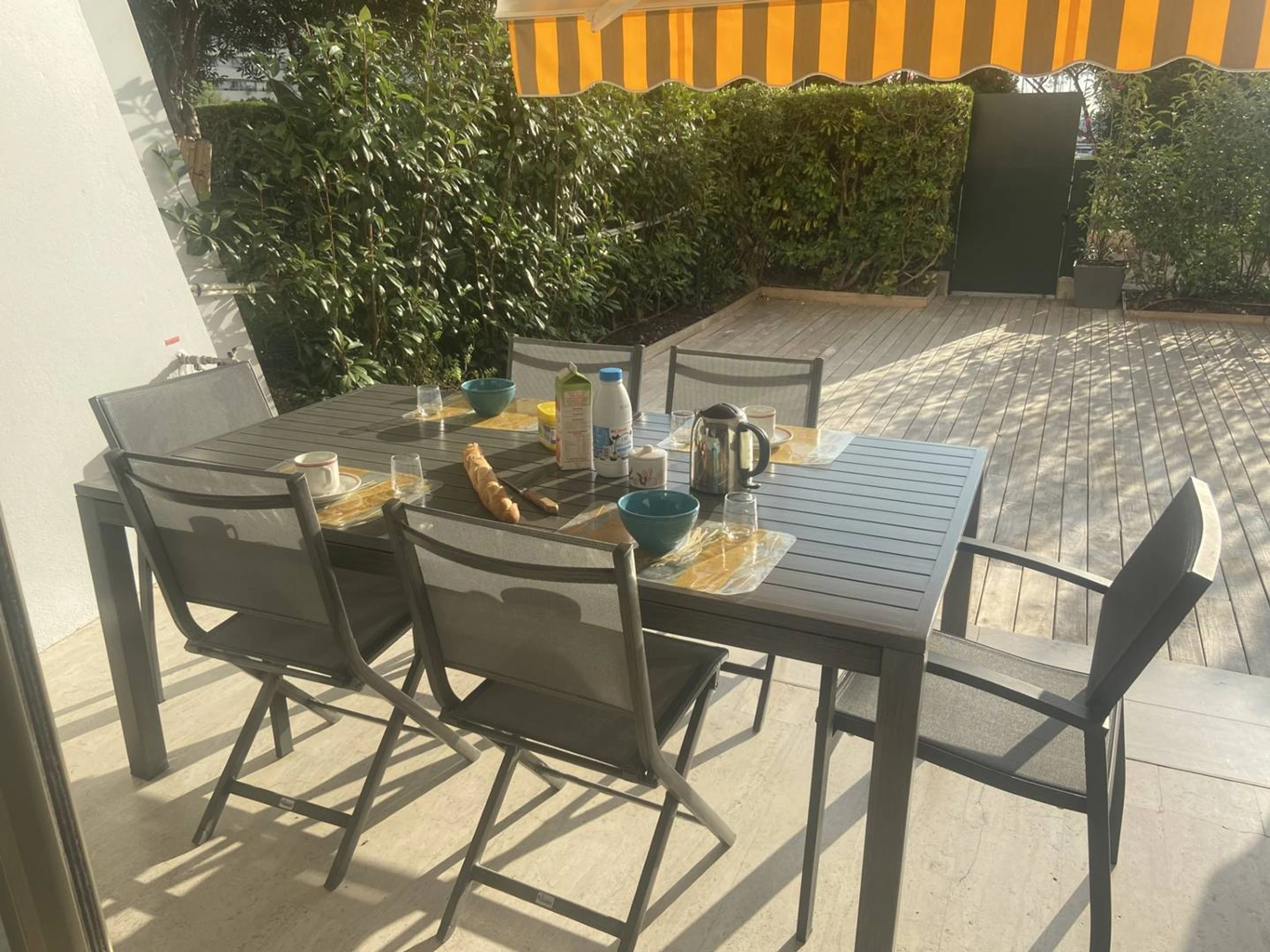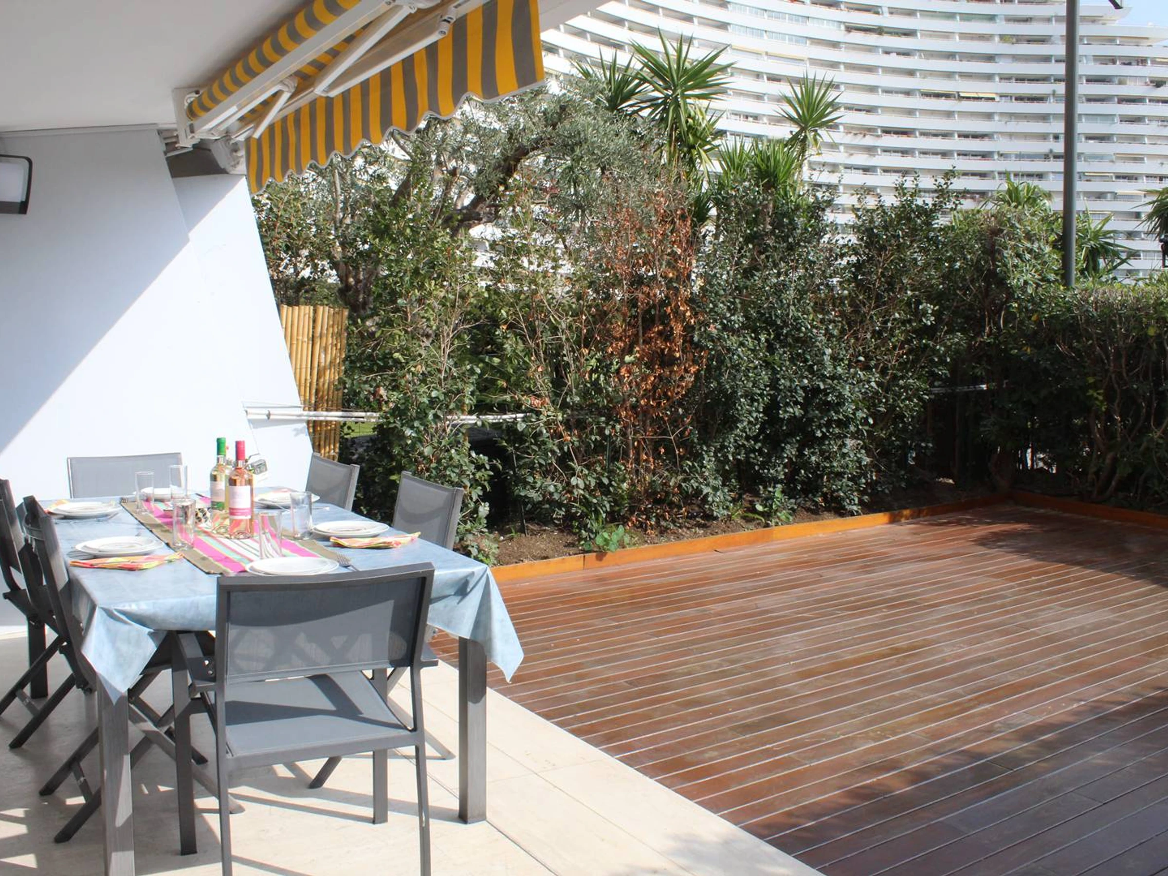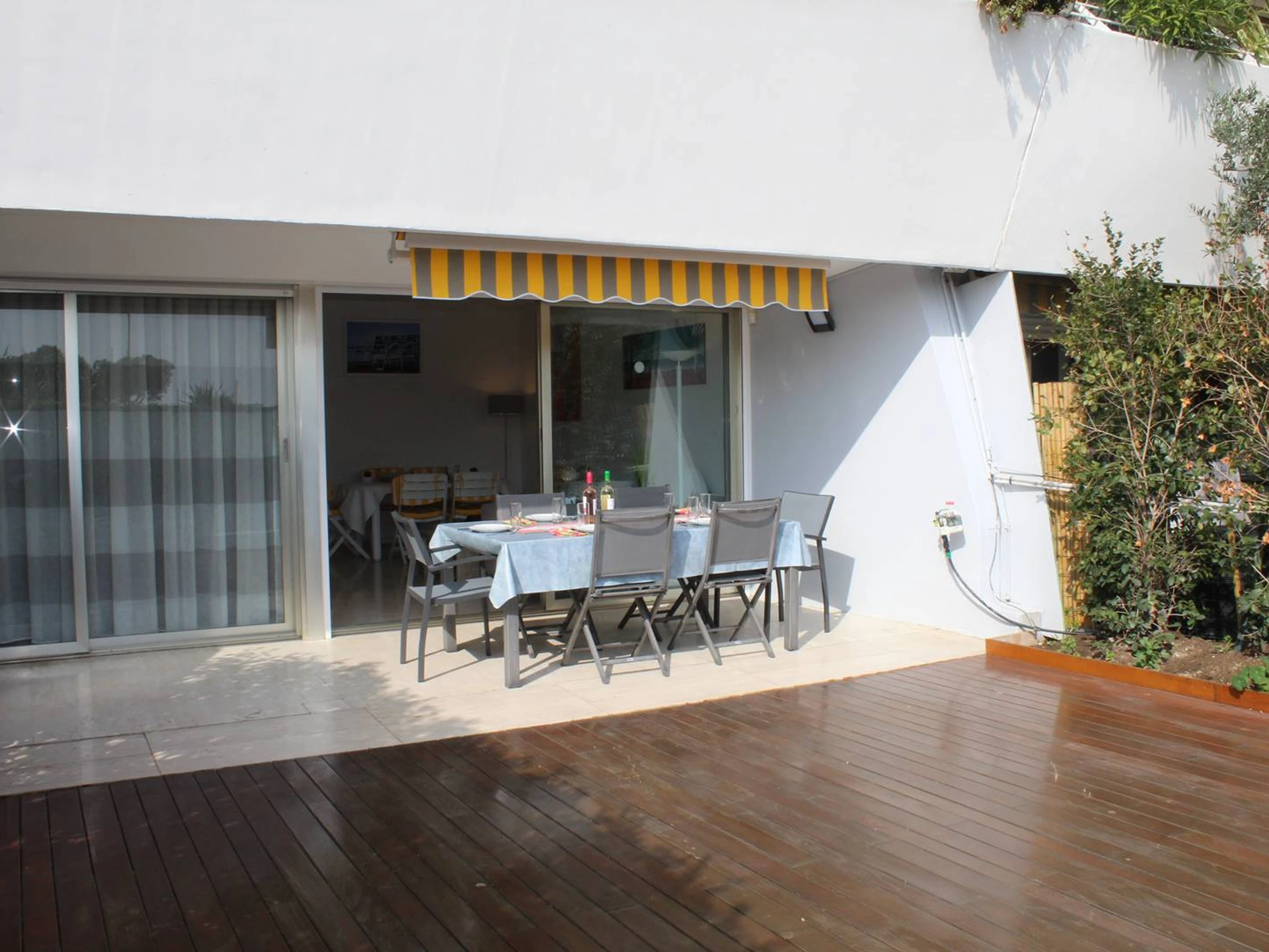 The apartment which is crossing from east to west consists of an entrance hall, a living room with sofa, television and Wi-Fi, facing a terrace of 18 m² and a garden of 30 m² entirely covered in teak. A pretty modern kitchen fully equipped. (oven, washing machine, dishwasher). Night side, the first bedroom with a double bed (140 x 180 cm) faces the garden. The second bedroom on the corridor side you will find two single beds (90x180 cm). A bathroom and separate toilet. This apartment is fully air-conditioned. The warm decoration offers a calm atmosphere.