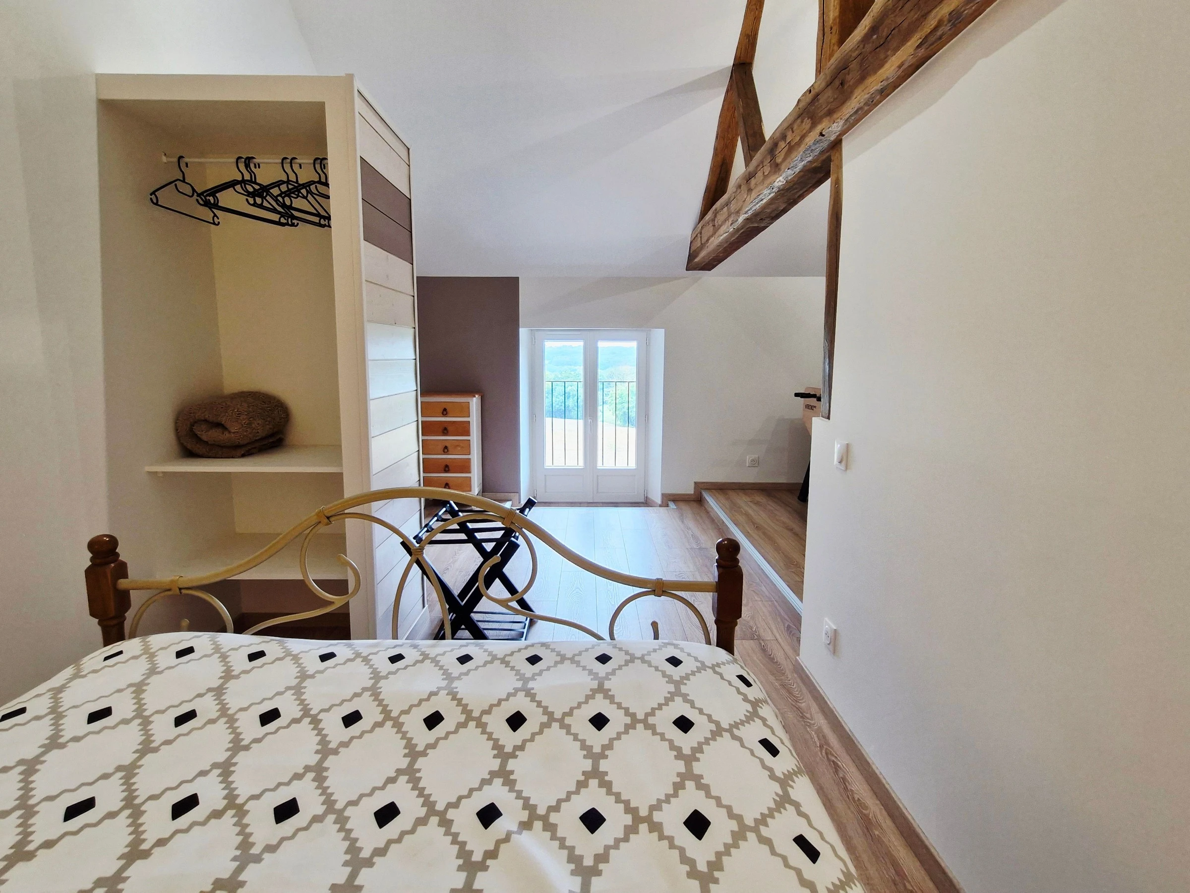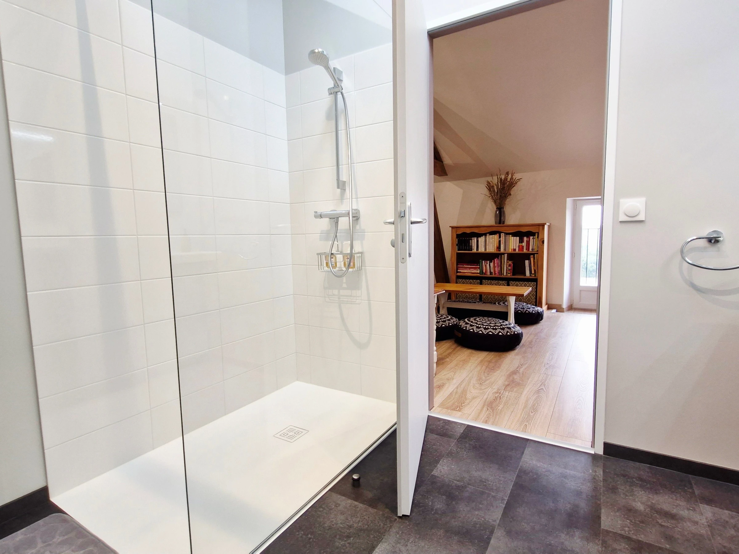 Upstairs, there is a second bedroom with a 140 x 190 cm bed and a bathroom with a walk-in shower and toilet.