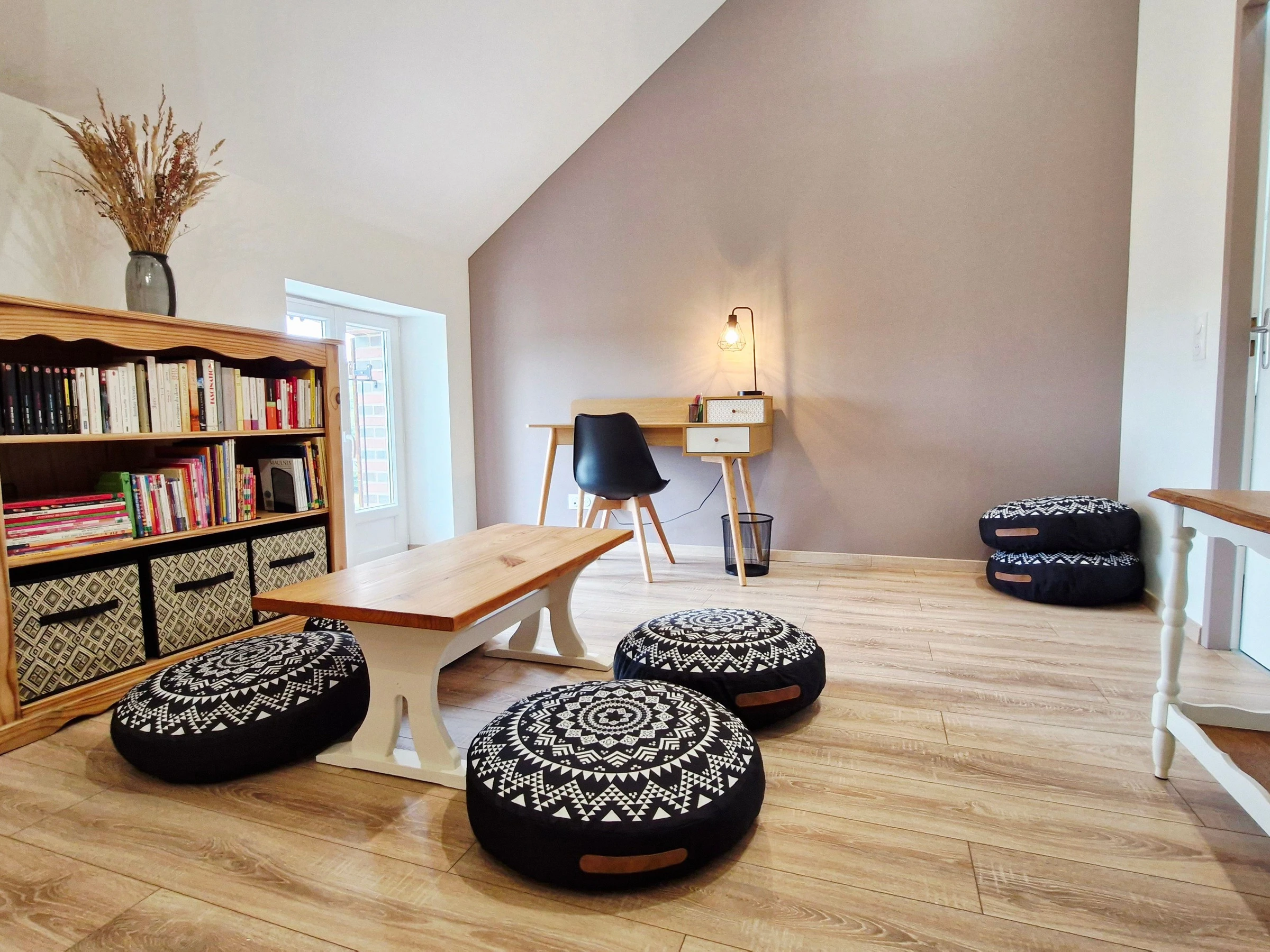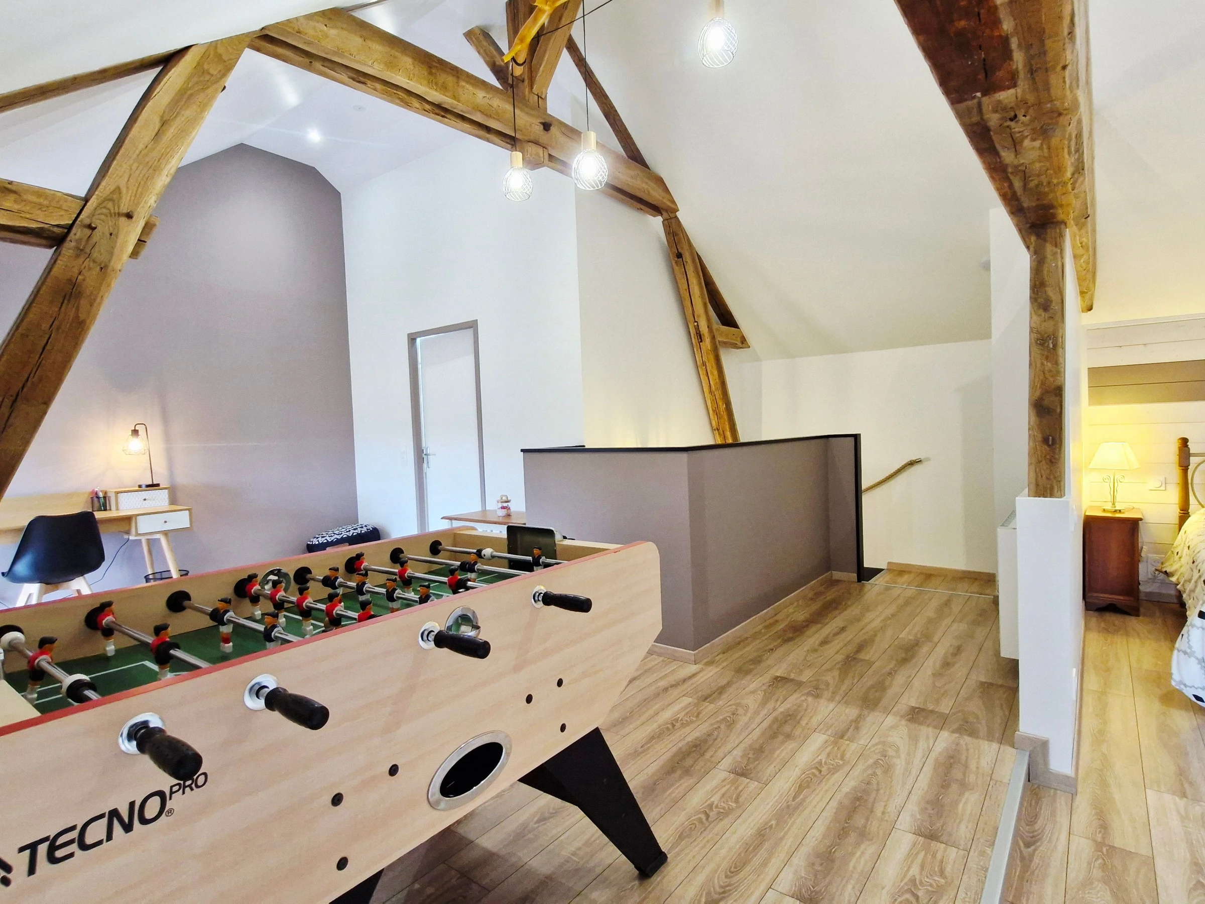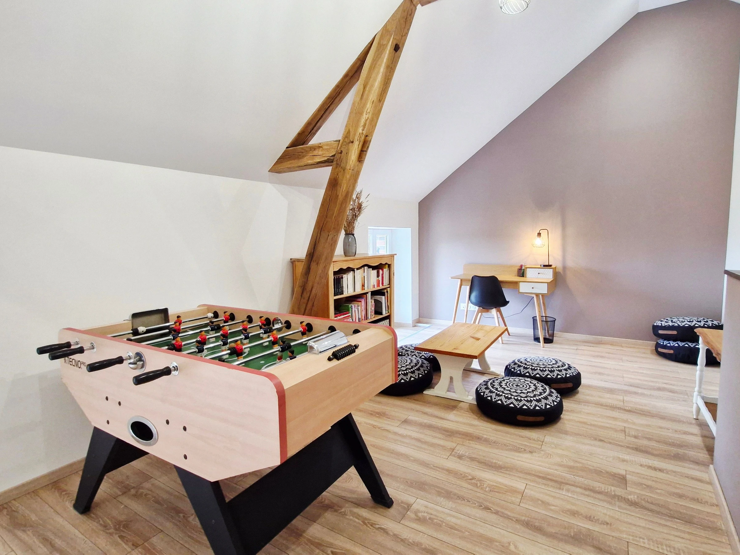 You'll also find a relaxation room with a library and foosball table, as well as a home office area, perfect for working from home (free Wi-Fi access - fiber optic). From the outside, you can access the garage and laundry room.
