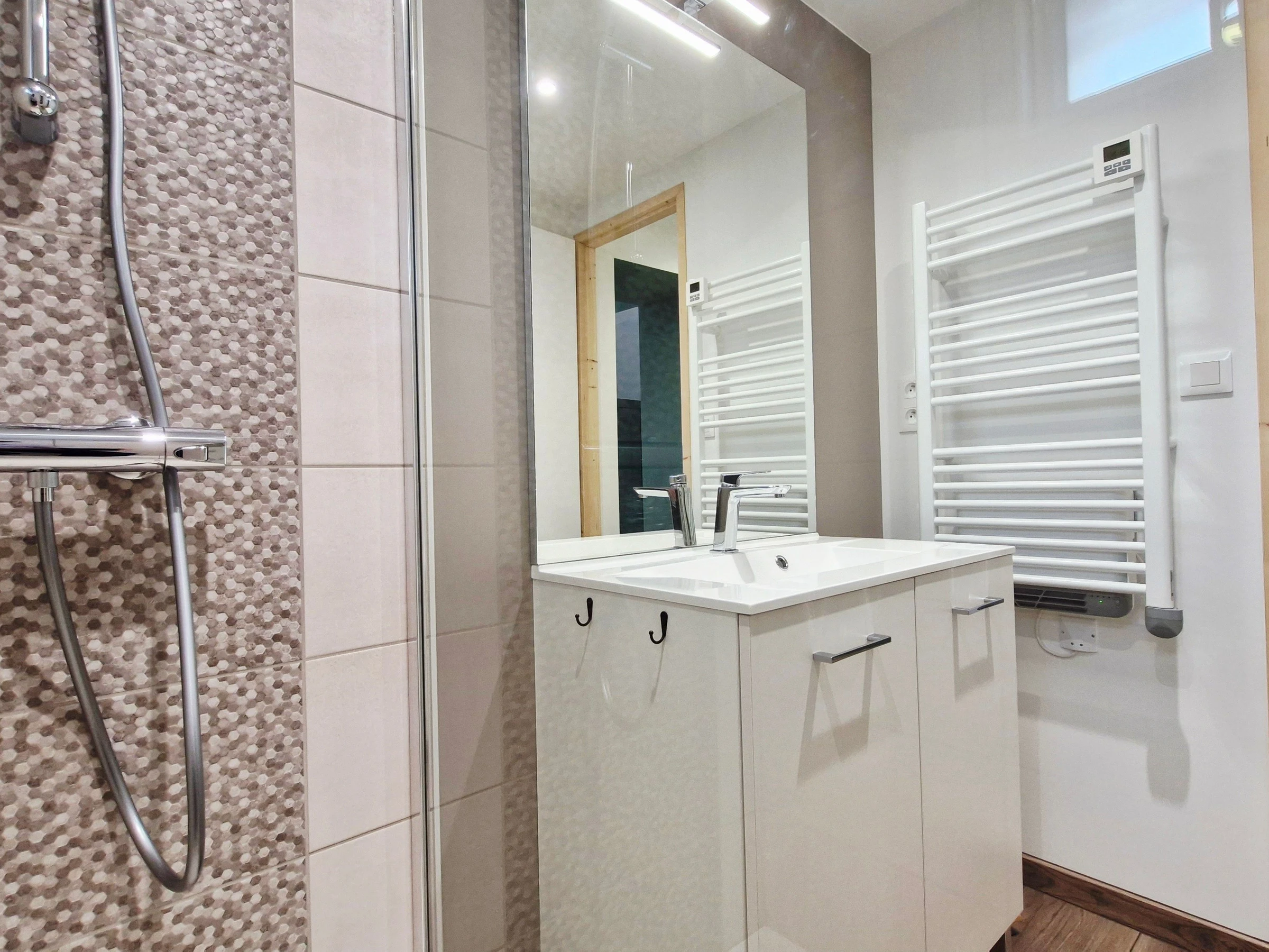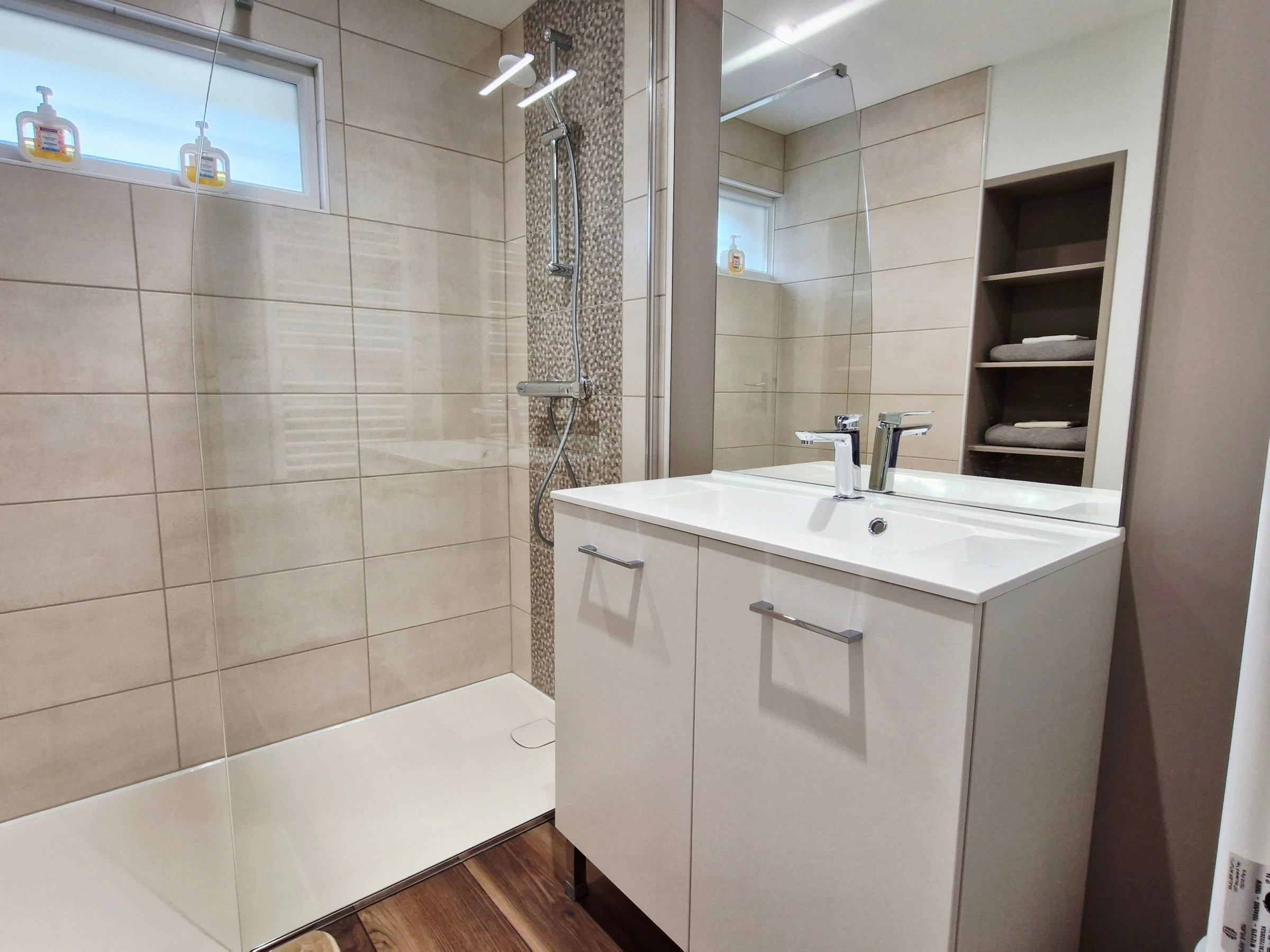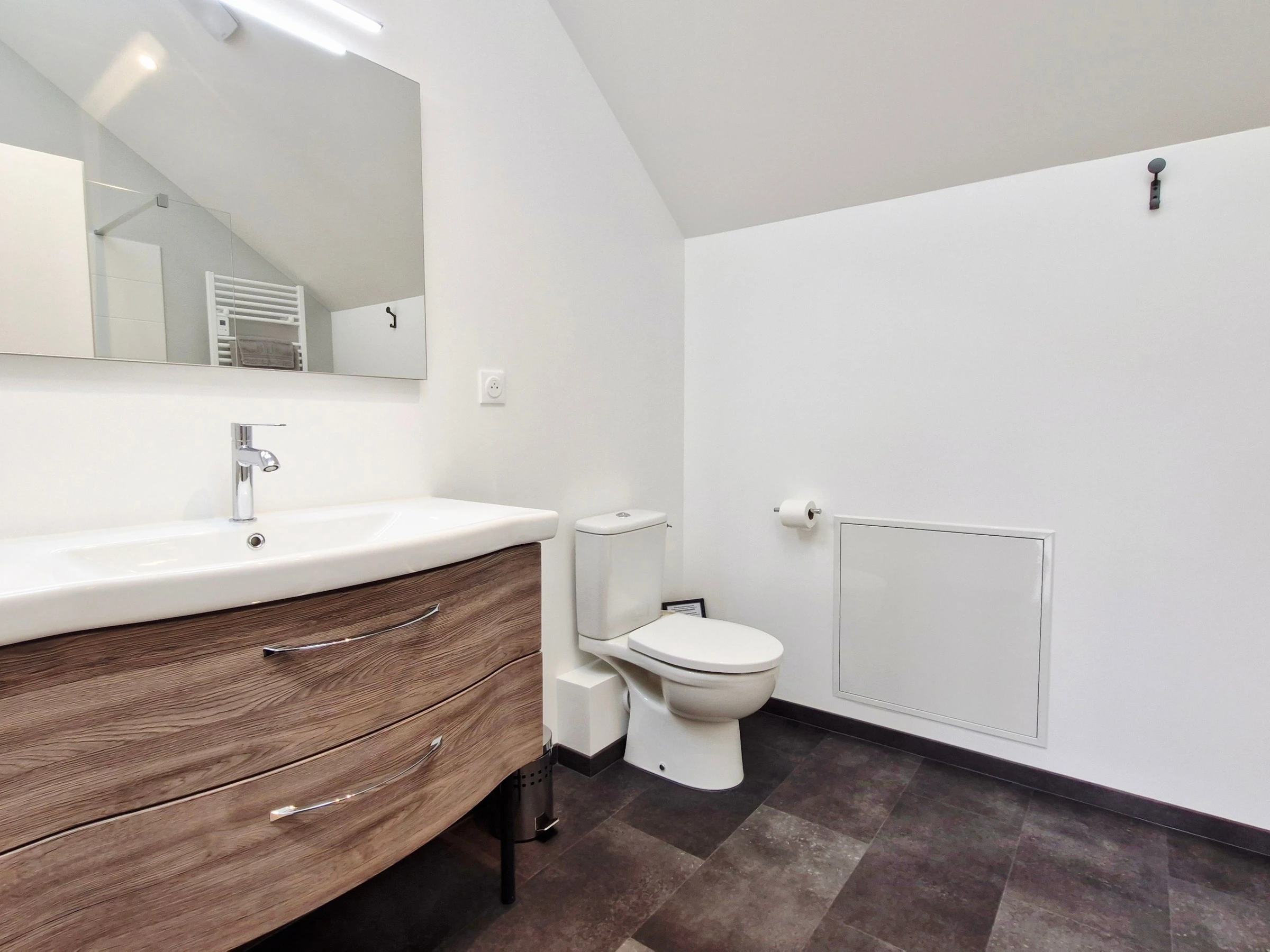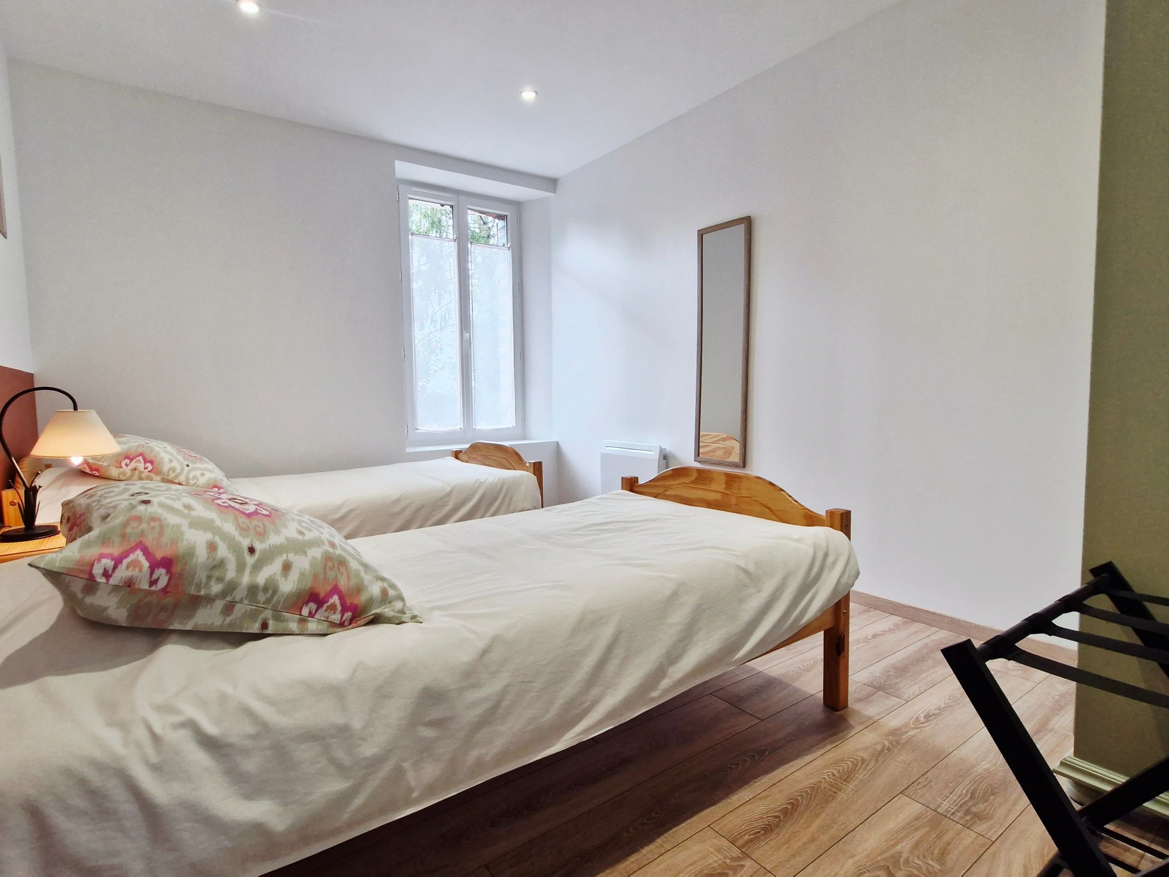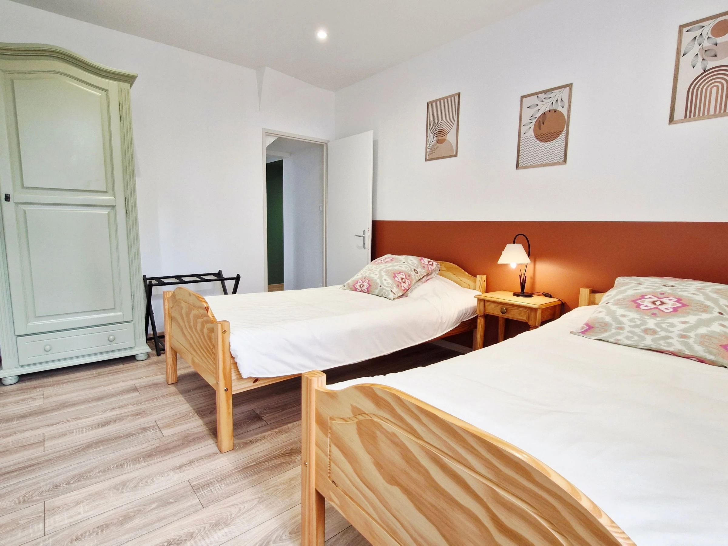 On this level, you'll find a first bedroom with two 90 x 190 cm beds, a bathroom with a walk-in shower, and a separate toilet.