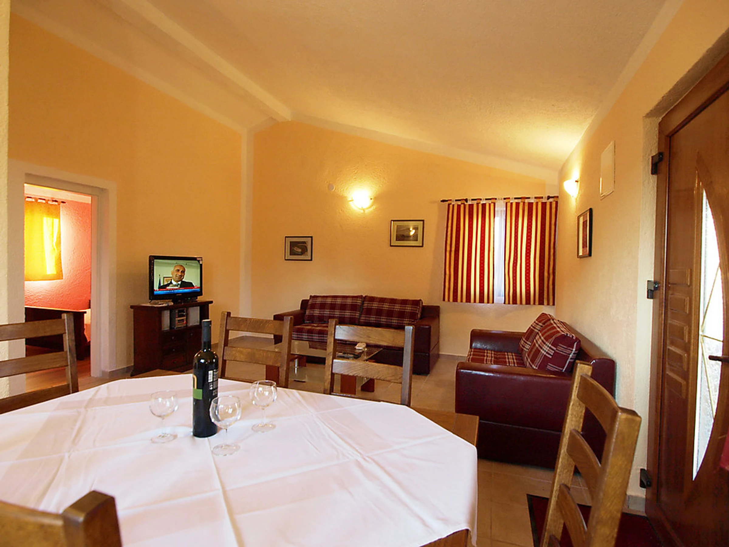 3-room apartment 58 m2, on the ground floor. Living/dining room with satellite TV (flat screen), radio and air conditioning. 1 room with 1 double bed (160 cm, length 200 cm). 1 room with 2 beds (90 cm, length 200 cm). Open kitchen (4 hot plates, freezer). Shower/WC. Air-conditioning (extra). Terrace 12 m2, roofed. Terrace furniture. View of the swimming pool. Facilities: Internet (WiFi, free). Included: Weekly laundry (bed linen and towels), Final cleaning, Local tax, Extra bed, Wireless internet access (WIFI) Available on site with supplement: Air-conditioning 0.5EUR per hour