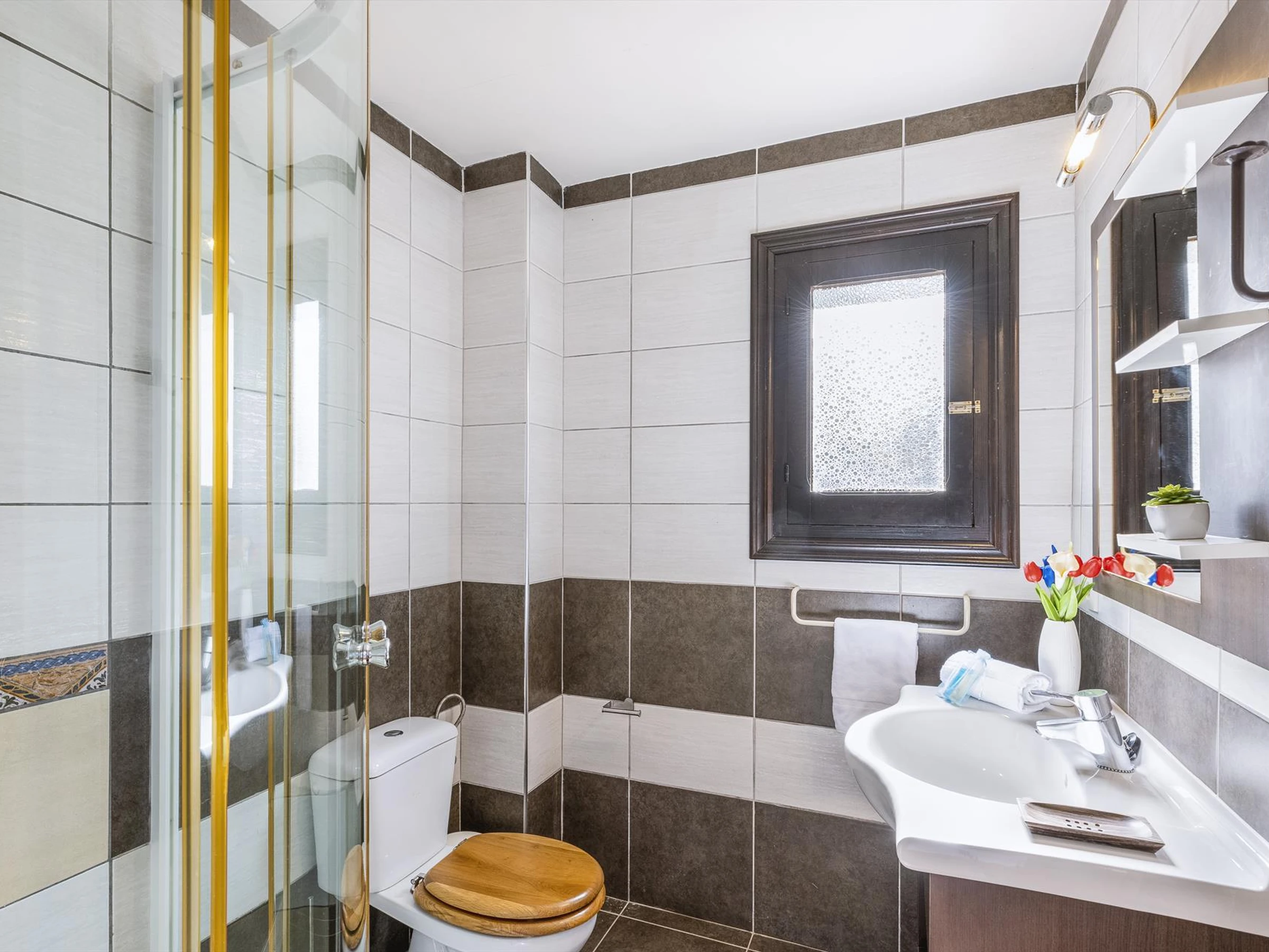 * bathroom with single washbasin, shower and toilet