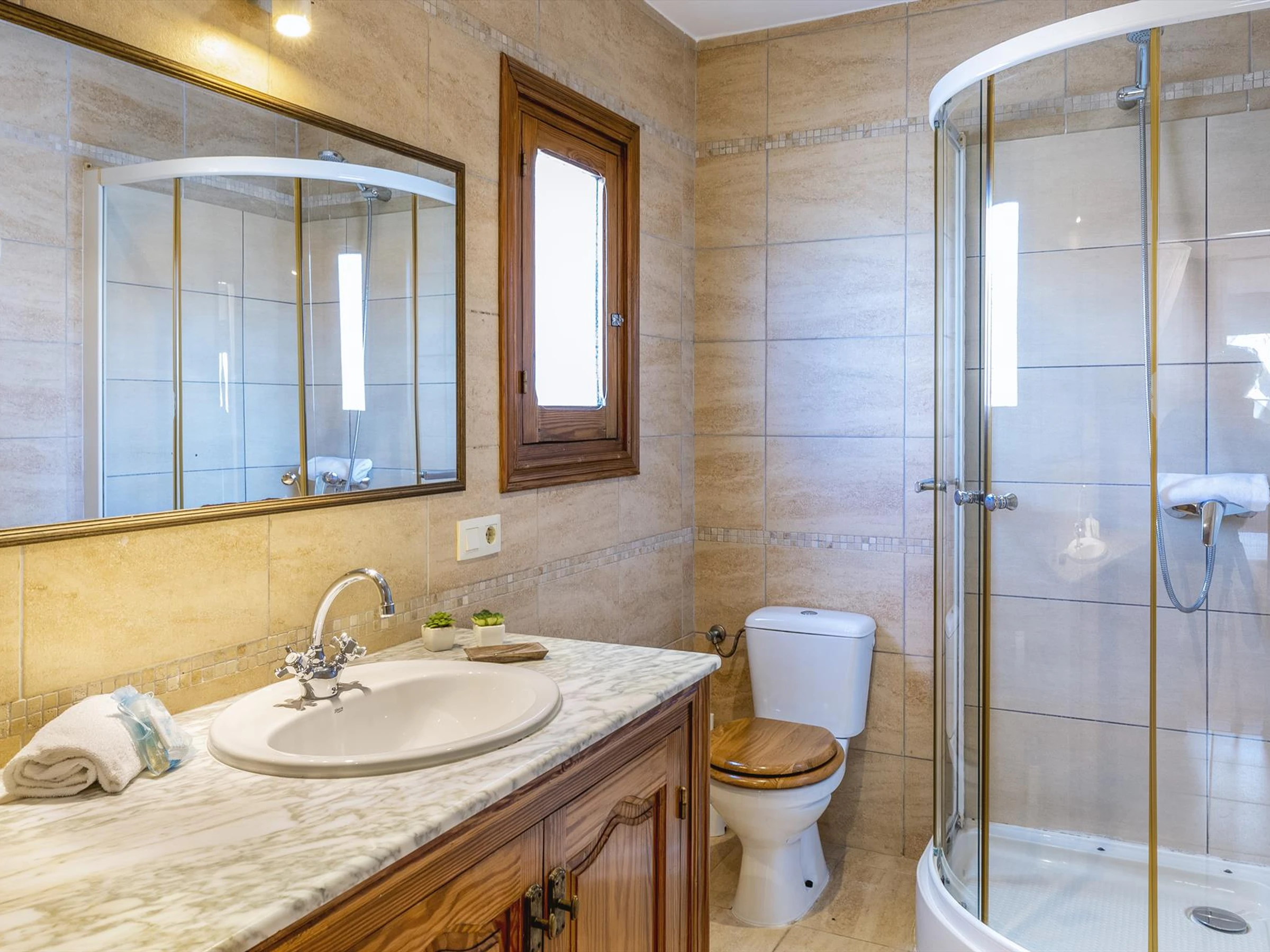 * en-suite bathroom with double washbasin, shower and toilet