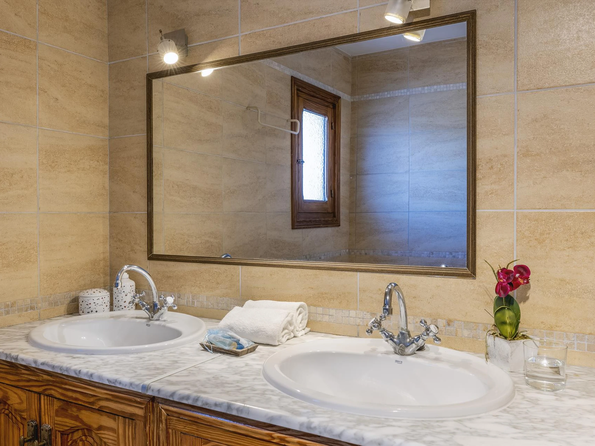 * bathroom with double washbasin, shower and toiletInterior of the left wing