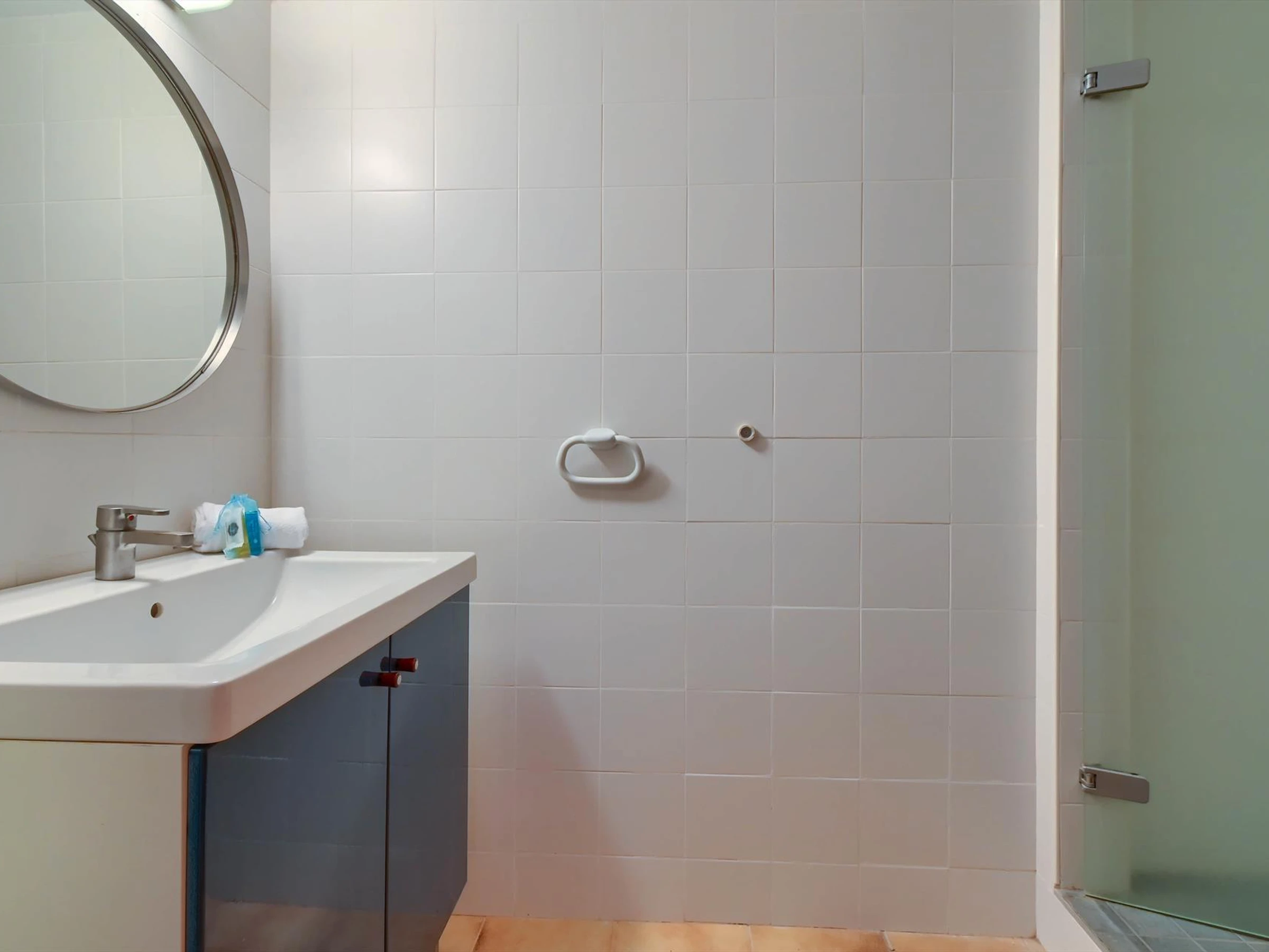 * bathroom with single washbasin, shower and toiletExterior of the house