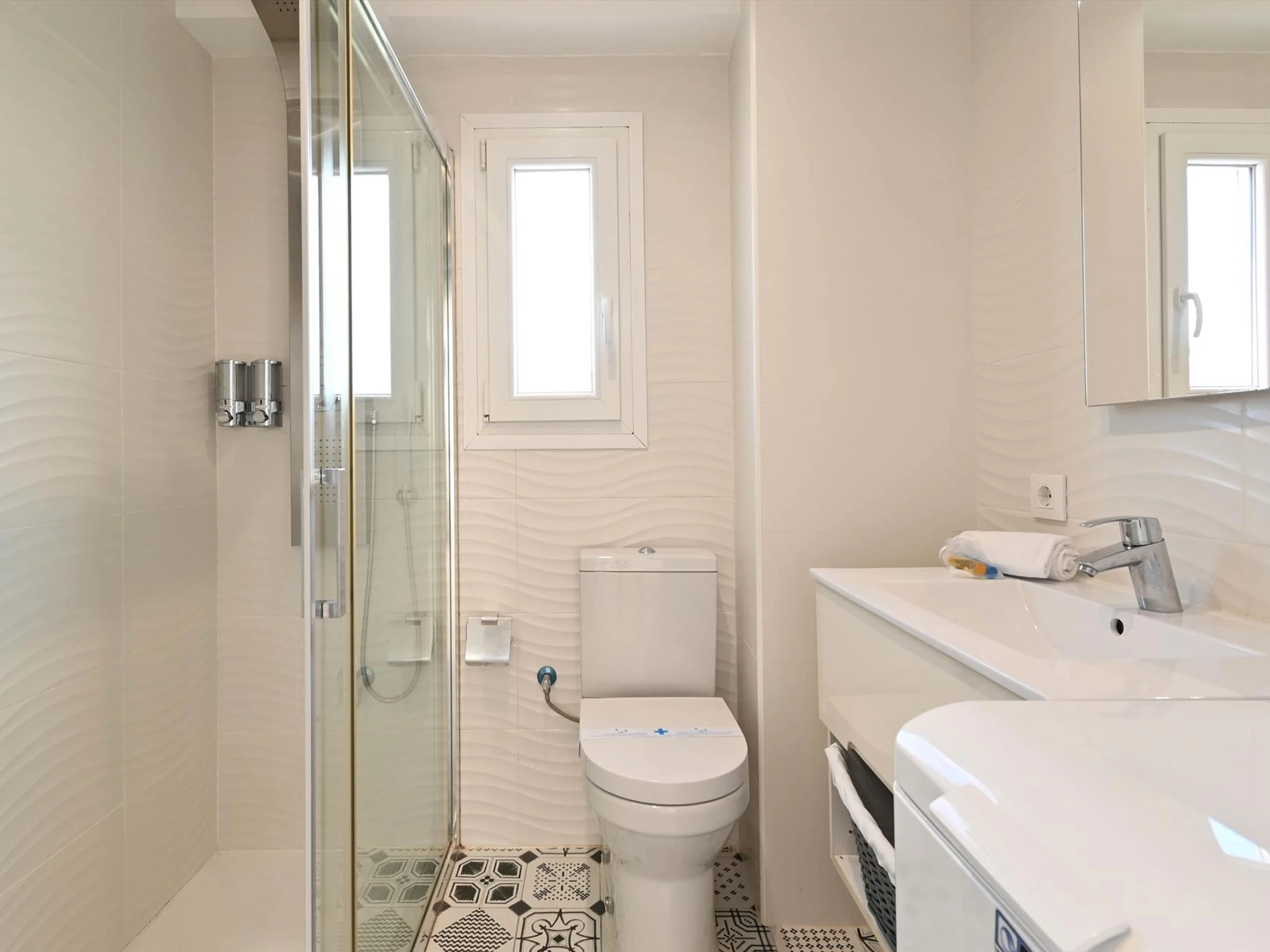 * bathroom with single washbasin, shower and toilet Exterior of the apartment