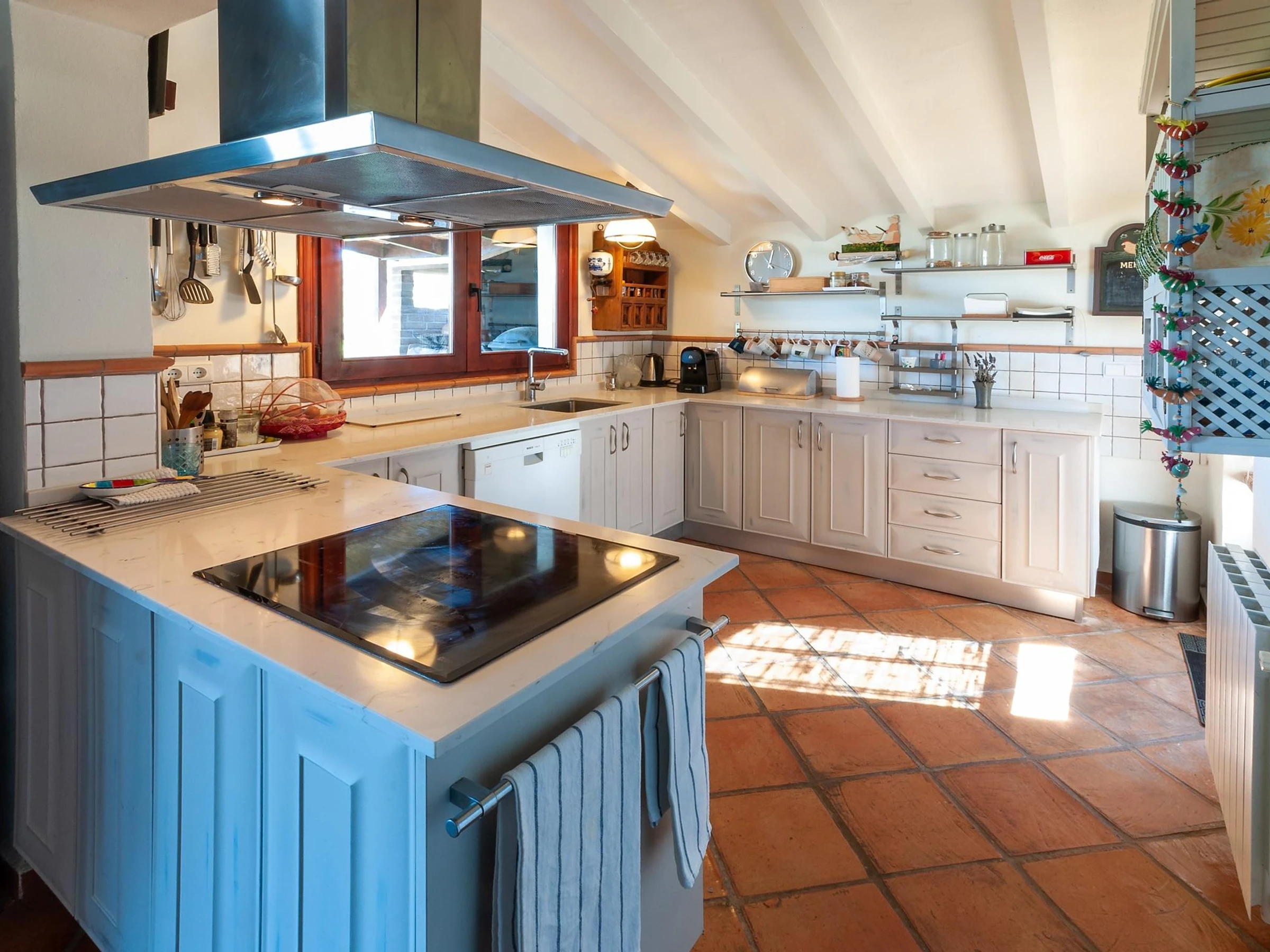 The cozy living- and dining room counts with 2 sofas, TV, a fire place, a dining table and great views. The spatious independent kitchen works with a hob and is fully equipped with all necessary utensils to prepare a nice meal during your stay. Also, you will find a washing machine and an iron and ironing board.