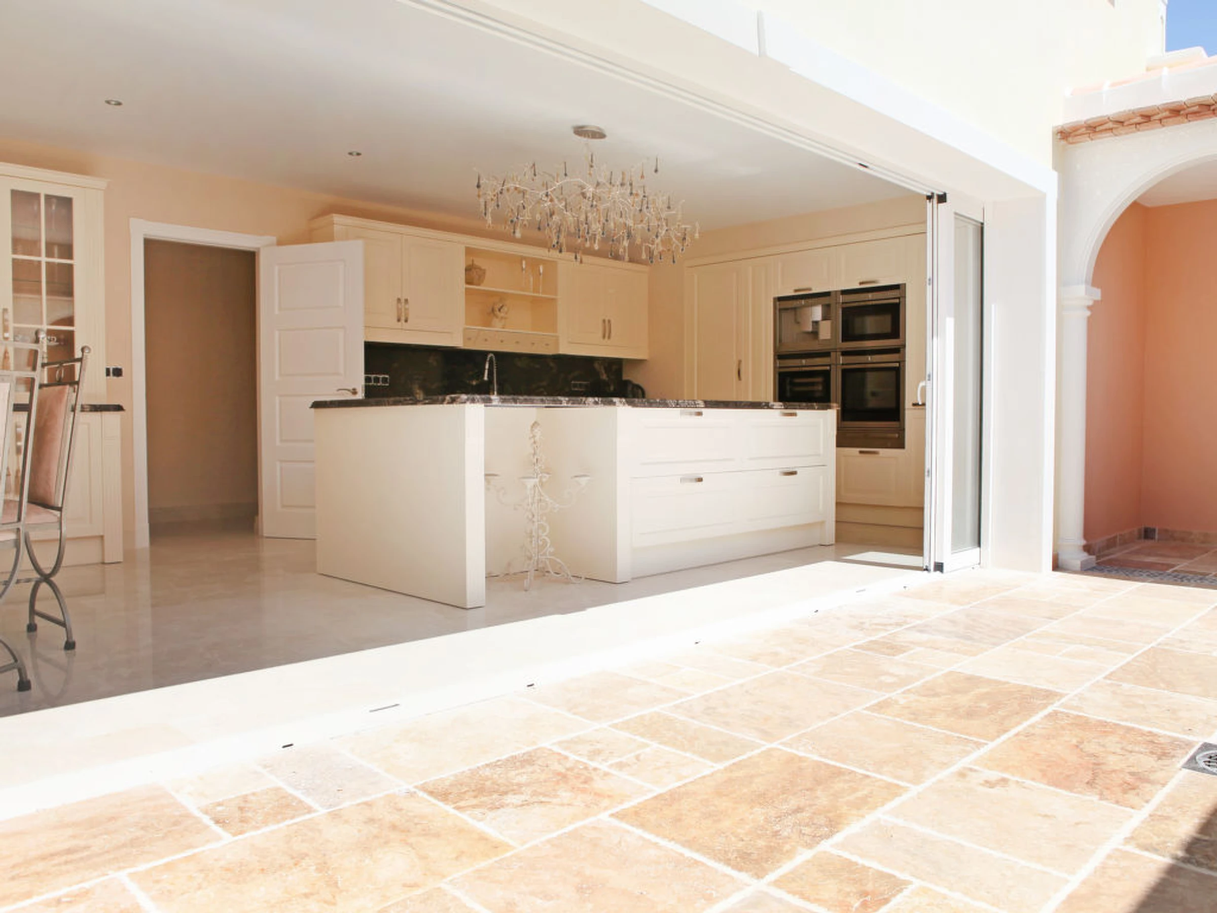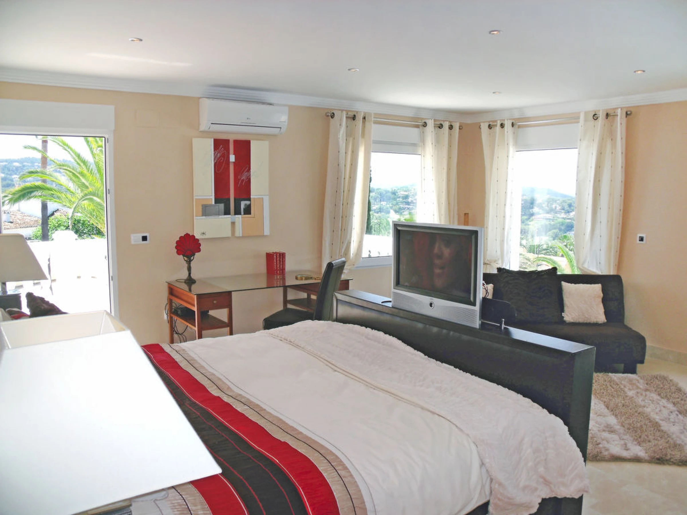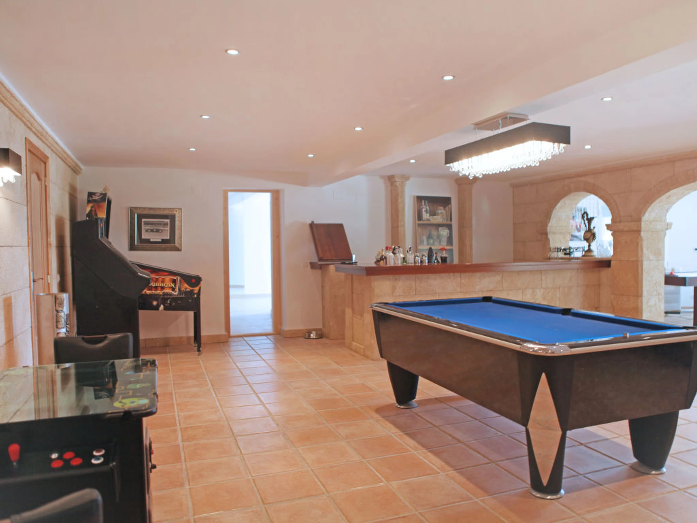 11-room villa 900 m2. Fully renovated in 2011, very luxurious and tasteful furnishings: large living room. Exit to the terrace. Dining room with hi-fi system. Exit to the terrace. Living room with satellite TV (flat screen). Exit to the garden. Exit to the terrace. Large kitchen (oven, dishwasher, X ceramic glass hob hotplates, microwave, freezer, electric coffee machine, steamer). Sep. WC. Floor heating. On the lower ground floor: 1 room with 1 french bed, shower/WC and flat screen. Exit to the garden. Upper floor: 1 room with 1 french bed (200 cm, length 200 cm), shower/WC, double hand-basin and flat screen. 1 room with 1 french bed, bath/shower/WC and flat screen. Exit to the terrace. 1 room with 1 french bed, shower/WC, whirlpool and flat screen. 1 room with 1 french bed (200 cm, length 200 cm), shower/WC, double hand-basin, whirlpool and flat screen. Exit to the terrace. Terrace furniture, deck chairs. Marvellous panoramic view of the countryside and the ocean. Facilities: washing machine, dryer, safe. Internet (WiFi, free). Reserved parking (fenced 10 cars). Please note: non-smoking house. From the hall there is another flight of stairs leading down to a further reception hall designed as an outdoor courtyard with a centre piece fountain. From here you will find the Bodega and the Laundry room, there is also a door that leads through to the bar/games room an impressive 80 square meters filled with activities. From here leads a door, to an inner lobby with a popcorn maker through to the 10 seated cinema, fitted out with luxurious electric seats all fully reclining and some with massage facilities and drinks holder for hot or cold drinks. From the Bar, another door leads to the fully equipped gymnasium and Spa, with Sauna and steam shower. AT-436501-A