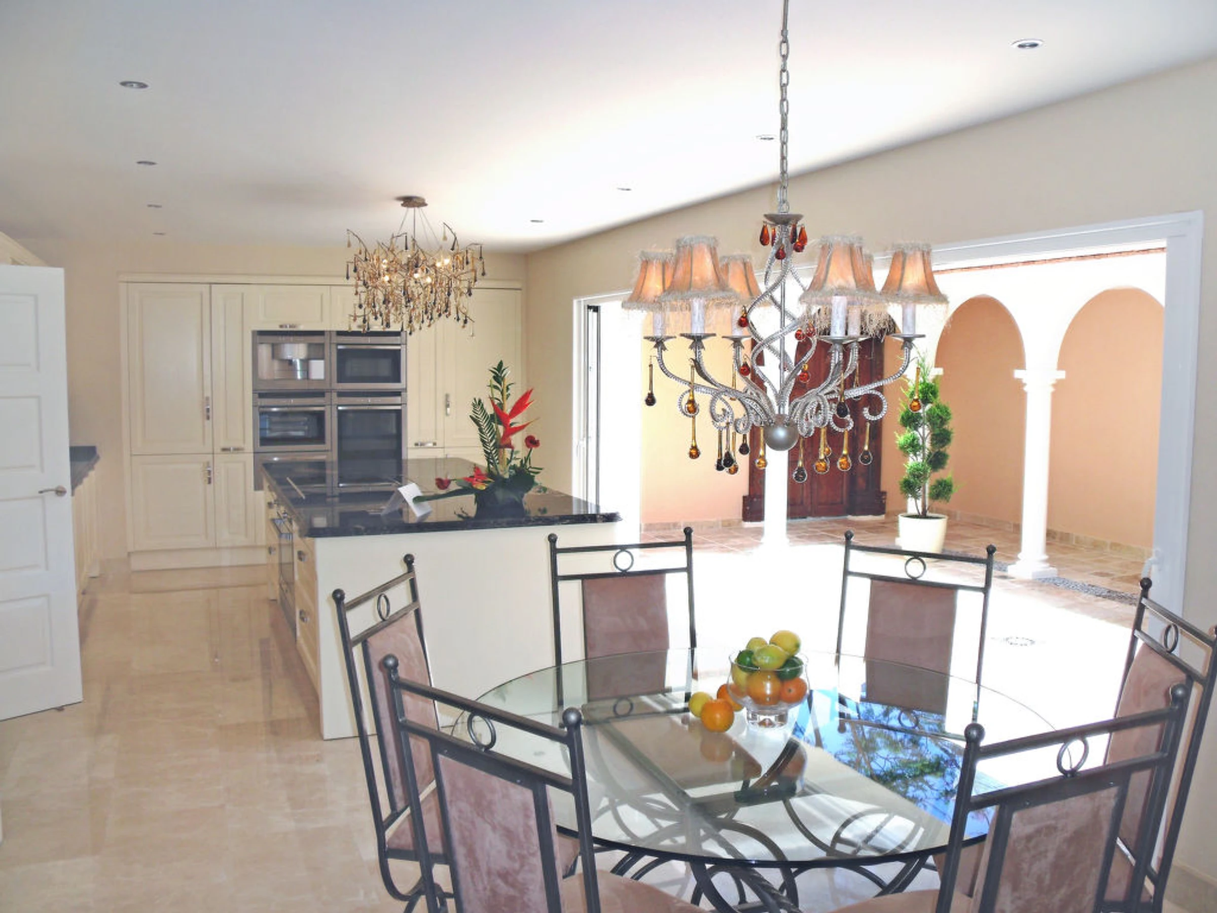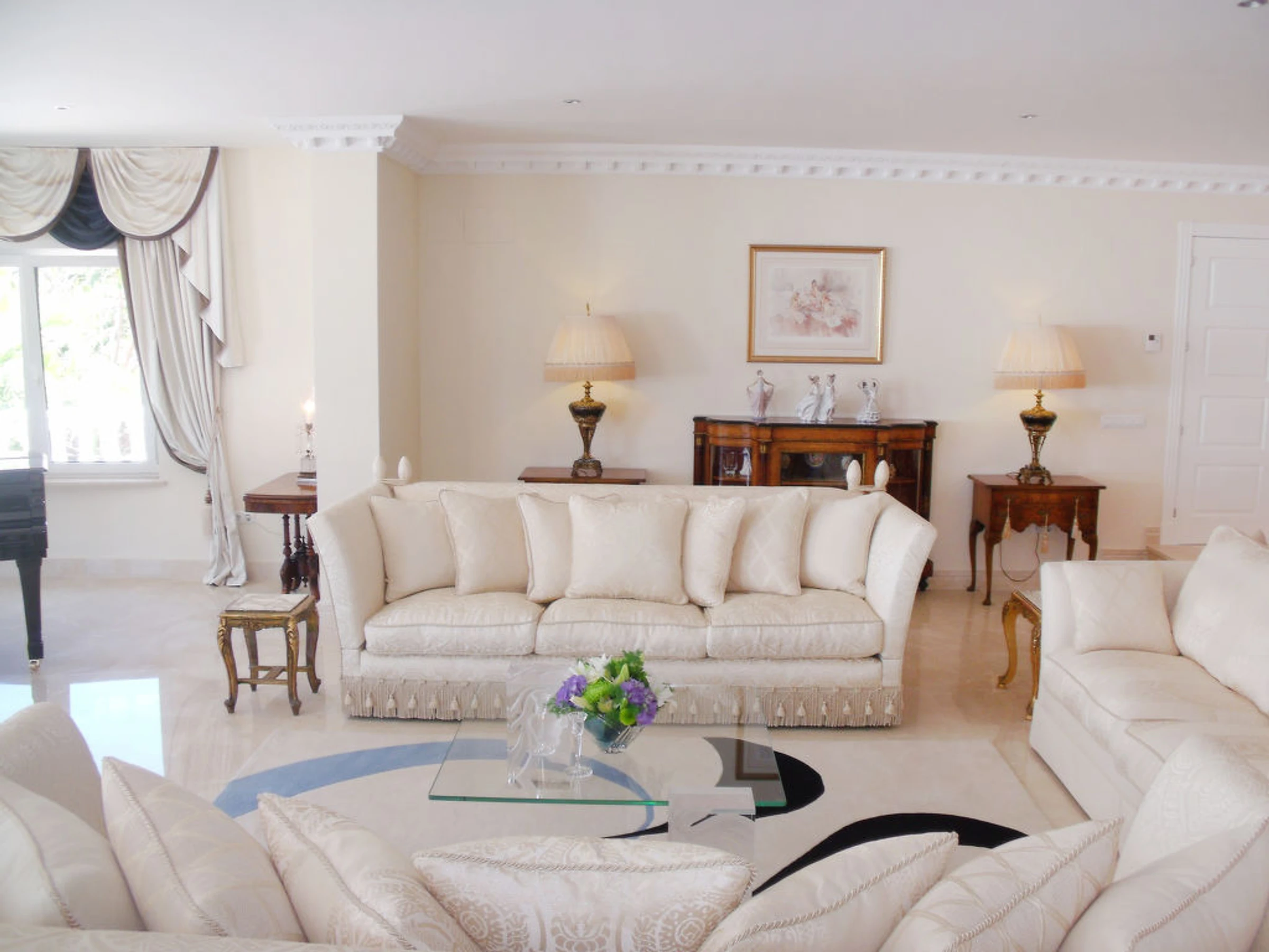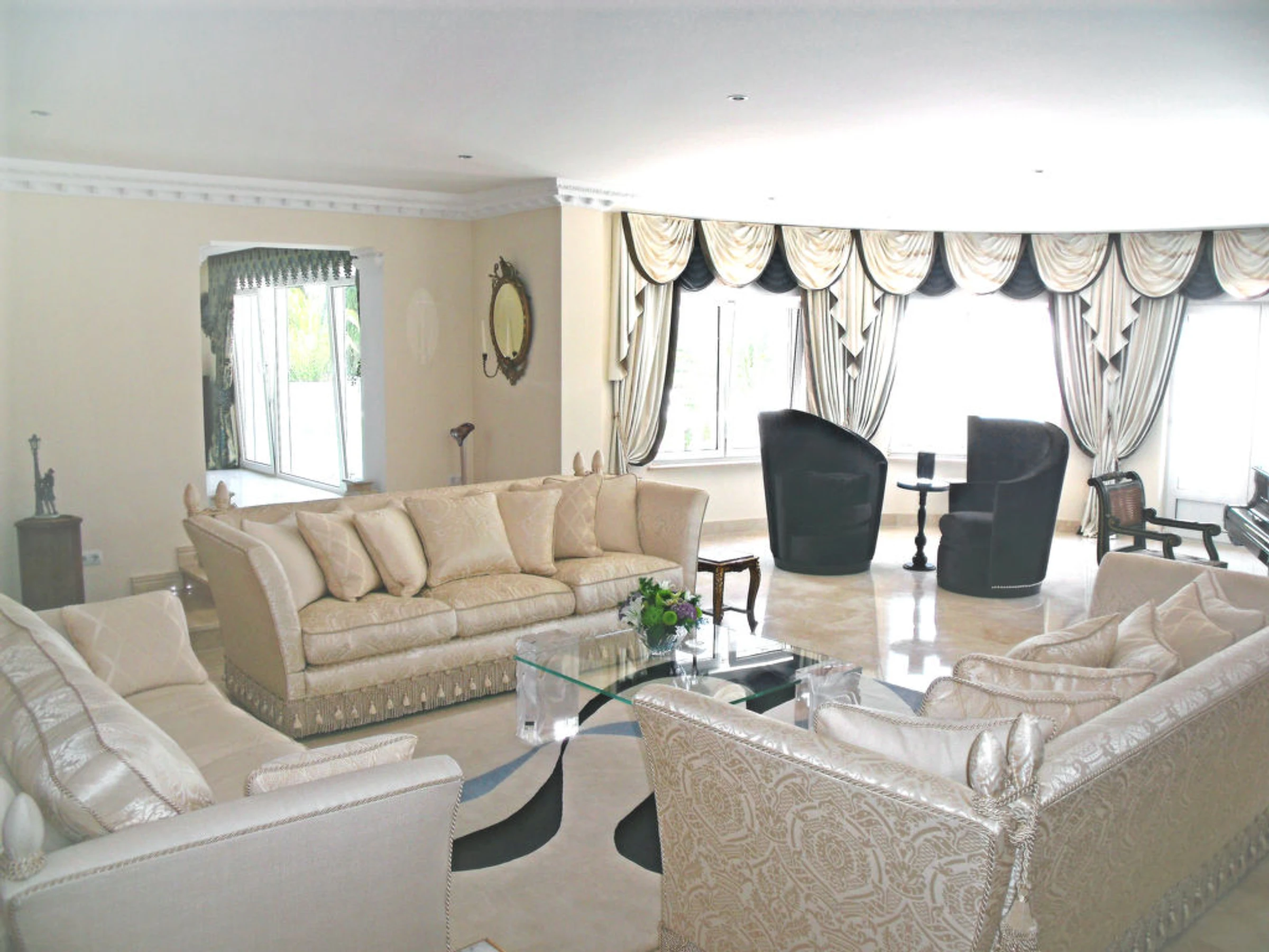 Very luxurious villa "Palacio la Paz", 3 storeys, renovated in 2011. In the district of Cap Marti, in a quiet, sunny, elevated position in the residential district, 2 km from the sea. Private: park 5'000 m2 (fenced), beautiful garden to relax, swimming pool (18 x 10 m,[hidden].) with internal staircase. WC in the pool area. In the house: WiFi, sauna, fitness room (all included), table tennis, billiard table, playroom, air conditioning, burglar alarm system, washing machine, tumble dryer. Supermarket, restaurant 500 m, sandy beach "Arenal" 2 km. Through a jungle walk at the front of the house you will come to a quiet glade where you will find a private and secluded swimming pool 10X5meters, a thatched cabana lies on the water's edge where after a stringent swim you can relax in the peace and shade. There is a small bar at the top of the stairs, an ideal place to share drinks with friends whilst watching the sun set behind the mountains. There are seating/lying areas and a Jacuzzi/Hot Tub set with in a contemporary designed Terrace.