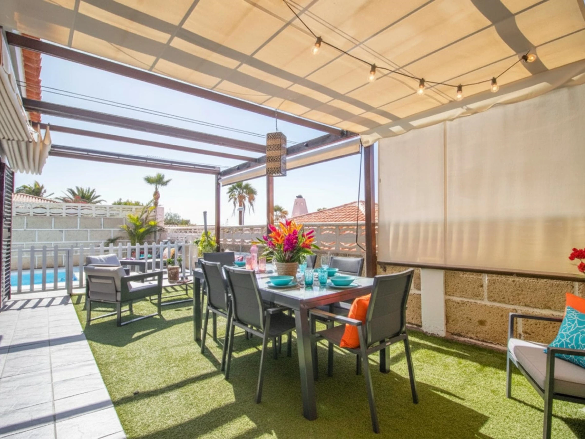 - Espacio exterior cerrado con ventanales ideal para usar como zona de trabajo o ideal para nómadas digitales que quieren combinar el ocio con el trabajo o trabajar pudiendo observar como los niños juegan en la piscina.
