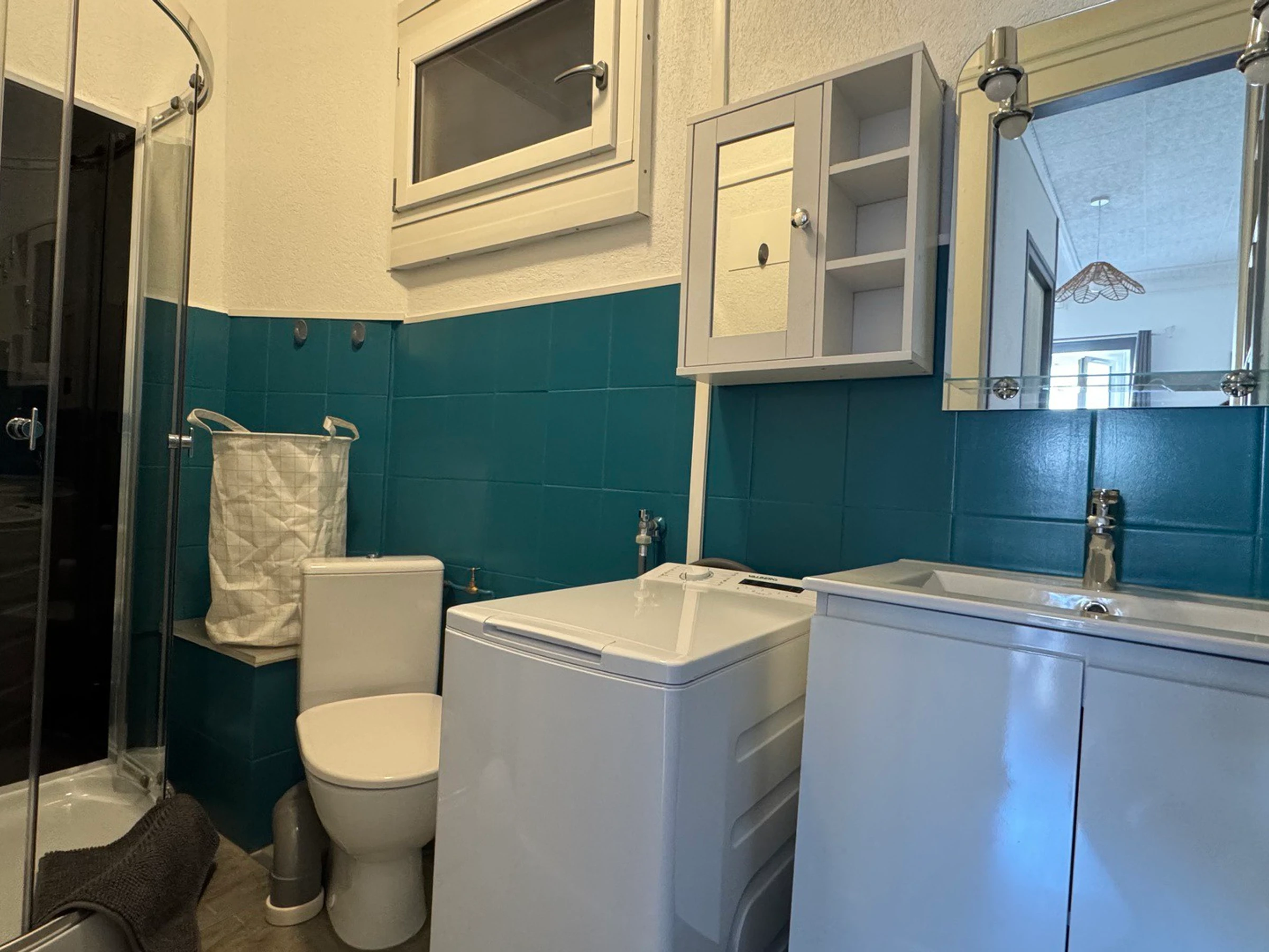 - SALLE D'EAU (carrelage – peinture et faïence) : cabine de douche, lave-linge, vasque avec meuble de rangements, miroir + WC