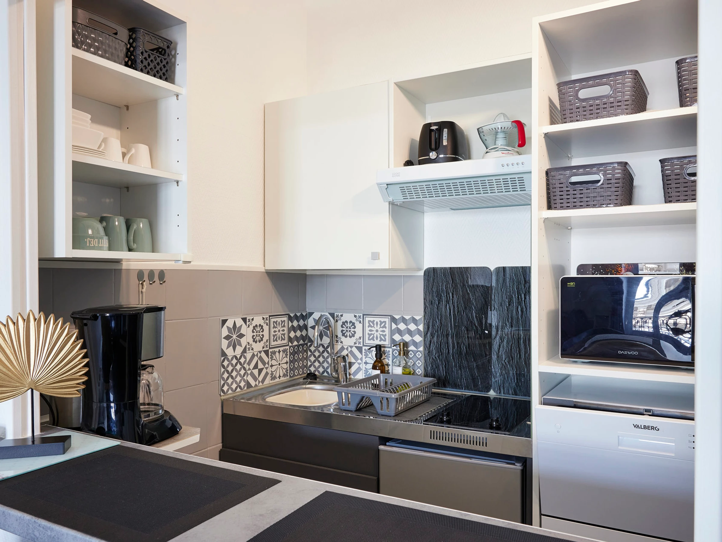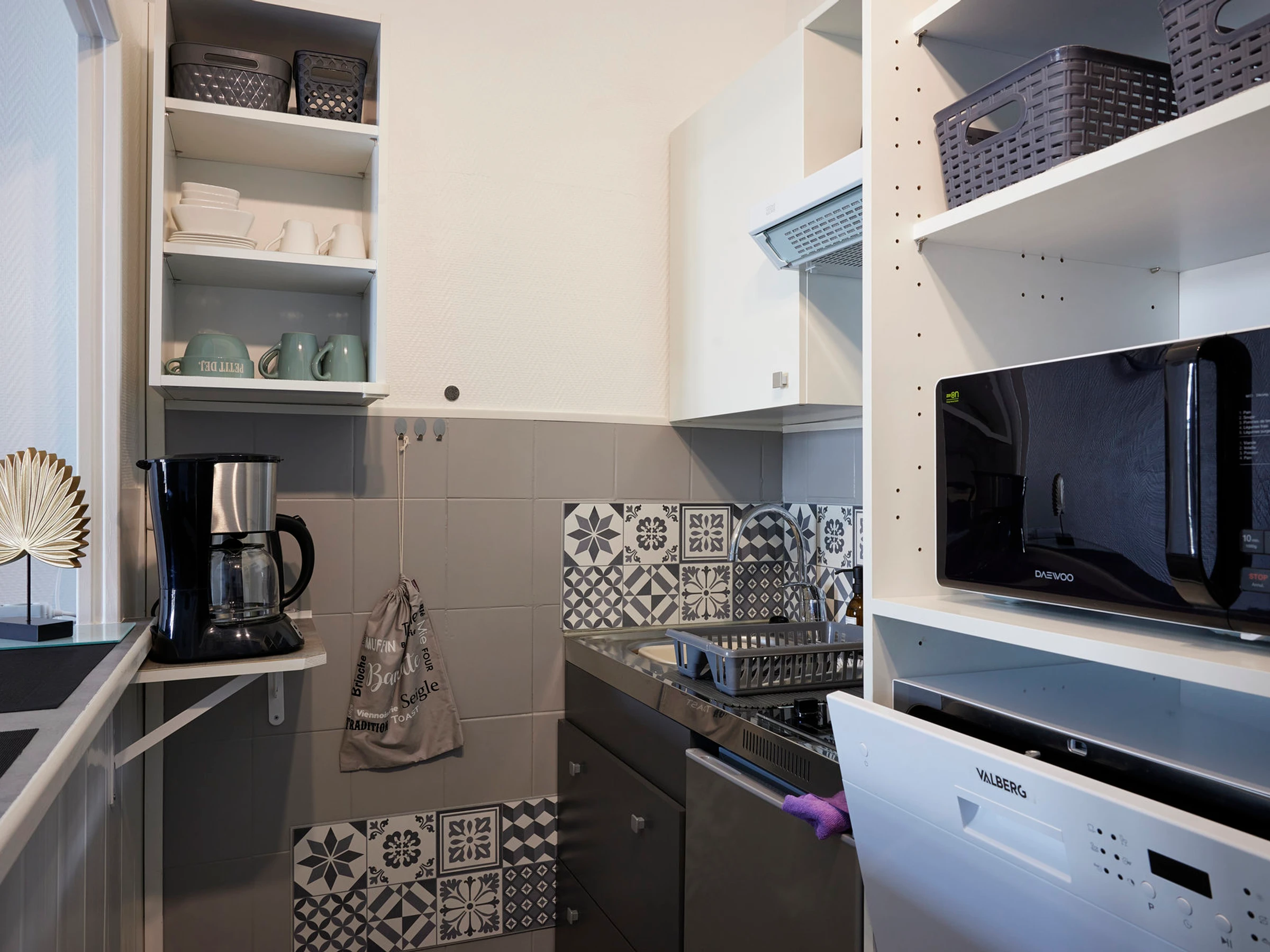 - KITCHENETTE (lino– peinture) : meubles hauts / bas, évier 1 bac avec égouttoir, plaque induction 2 feux, four micro-ondes, hotte, réfrigérateur/freezer, cafetière filtre, bouilloire, grille-pain, espace bar avec 2 chaises hautes, ustensiles. espace repas : 1 table 4 chaises - COIN NUIT (parquet – peinture) :lampe, miroir, 1 lit x (140x200cm), oreillers, couette, plaid,