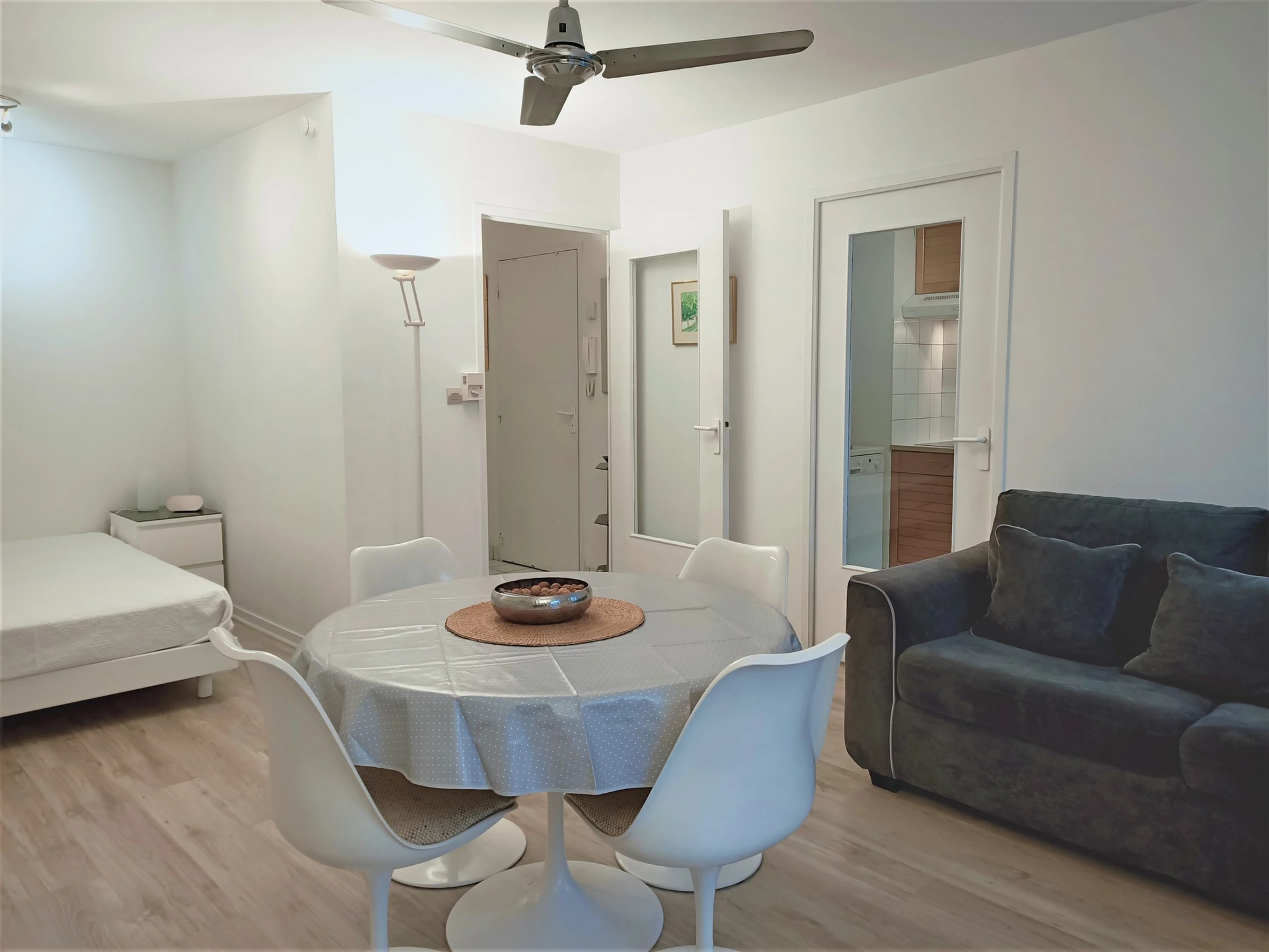 * SALON/SEJOUR : mesa redonda y 4 tumbonas, muebles altos y bajos, televisión, canapé convertible en sofá de 140 cm, ventilador de techo.