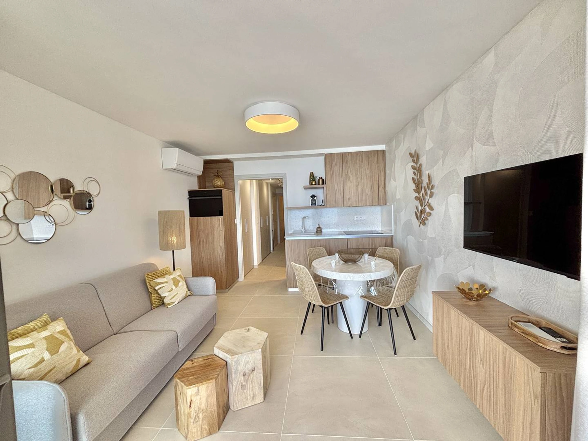 El apartamento cuenta con una cocina totalmente equipada que se abre al salón (con sofá cama), con acceso a una terraza con vistas al mar, un dormitorio con cama de matrimonio y televisión, un cuarto de ducha y un aseo independiente. El apartamento dispone de aire acondicionado.