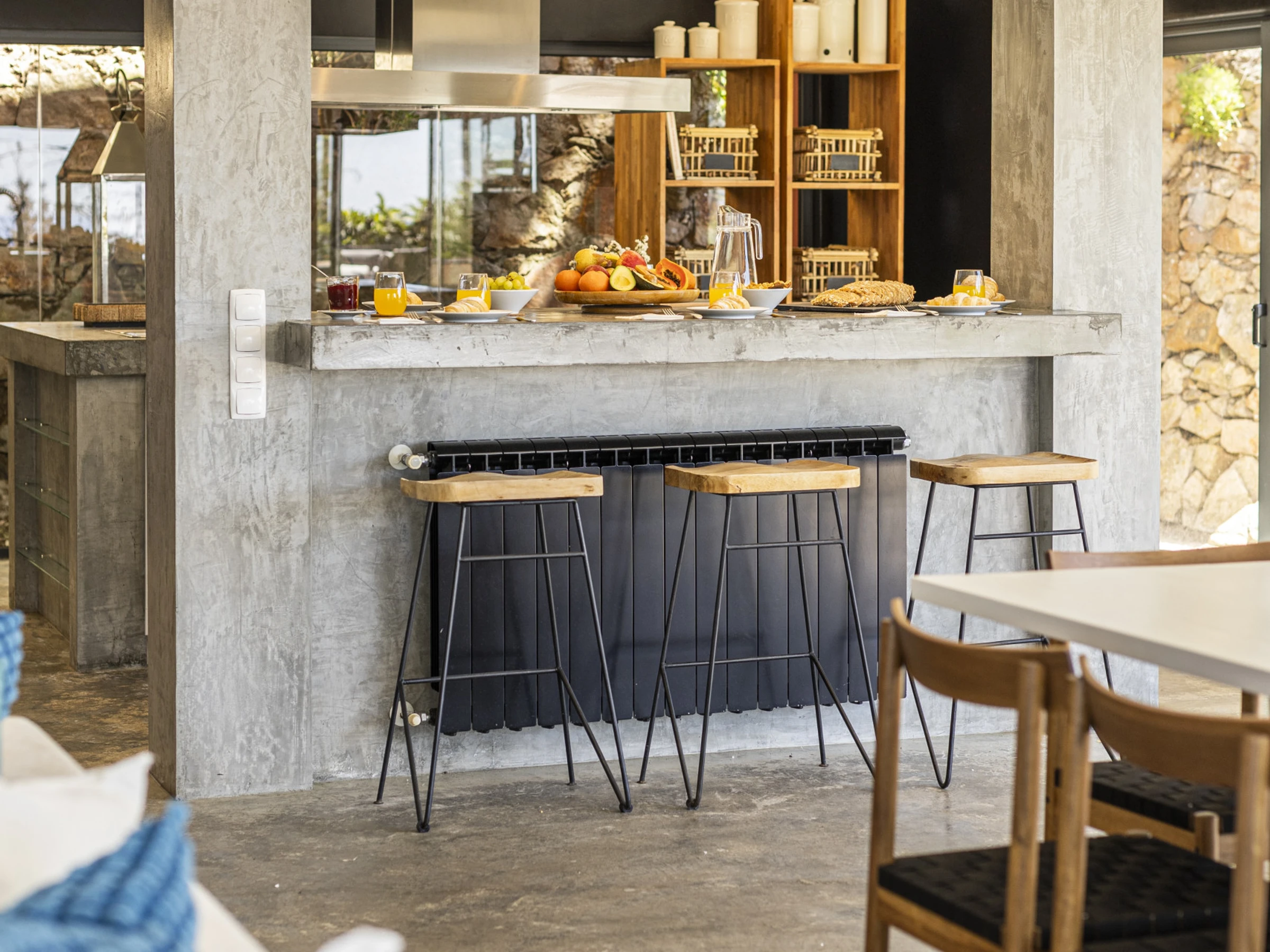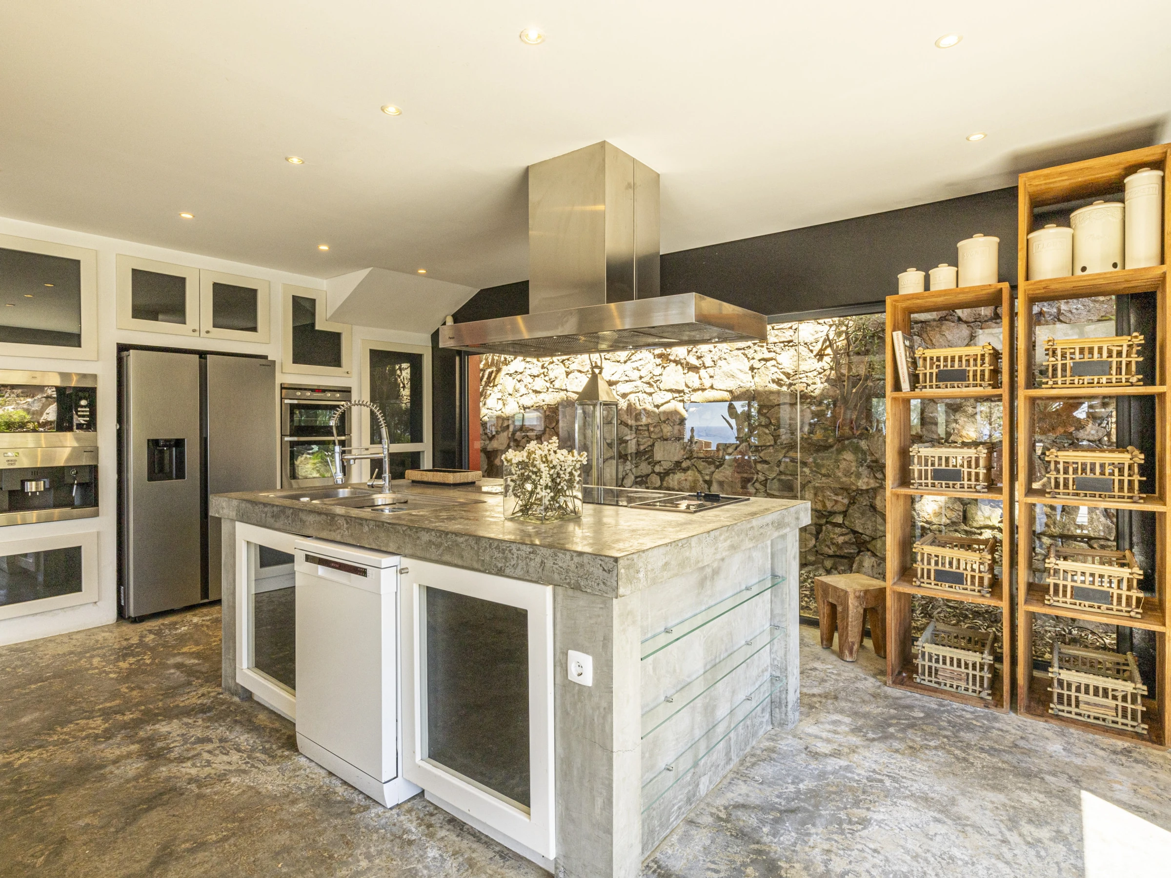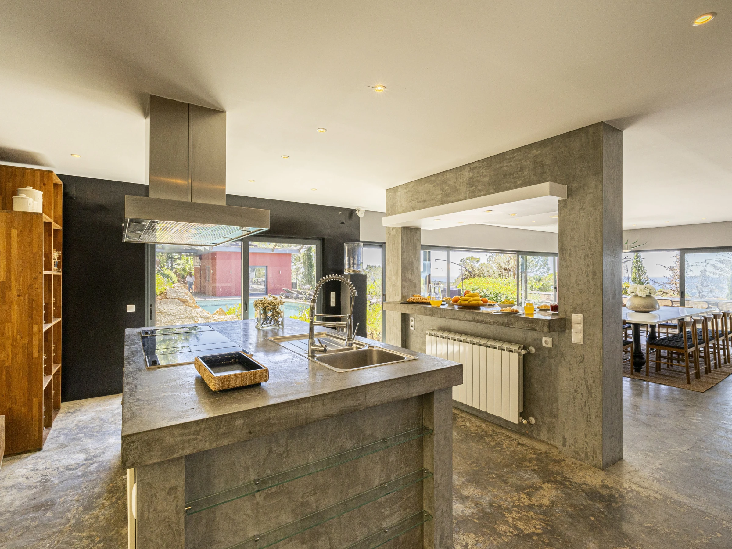 This villa has 4 bedrooms and 1 extra room in an outside annex, each room has vast amounts of space and built in storage. The kitchen with modern appliances is open plan connecting to the living area, which features a dining table large enough to sit 12 guests. A unique design feature of the kitchen is the floor to ceiling window which faces the back side of the property, looking onto a stone work wall.