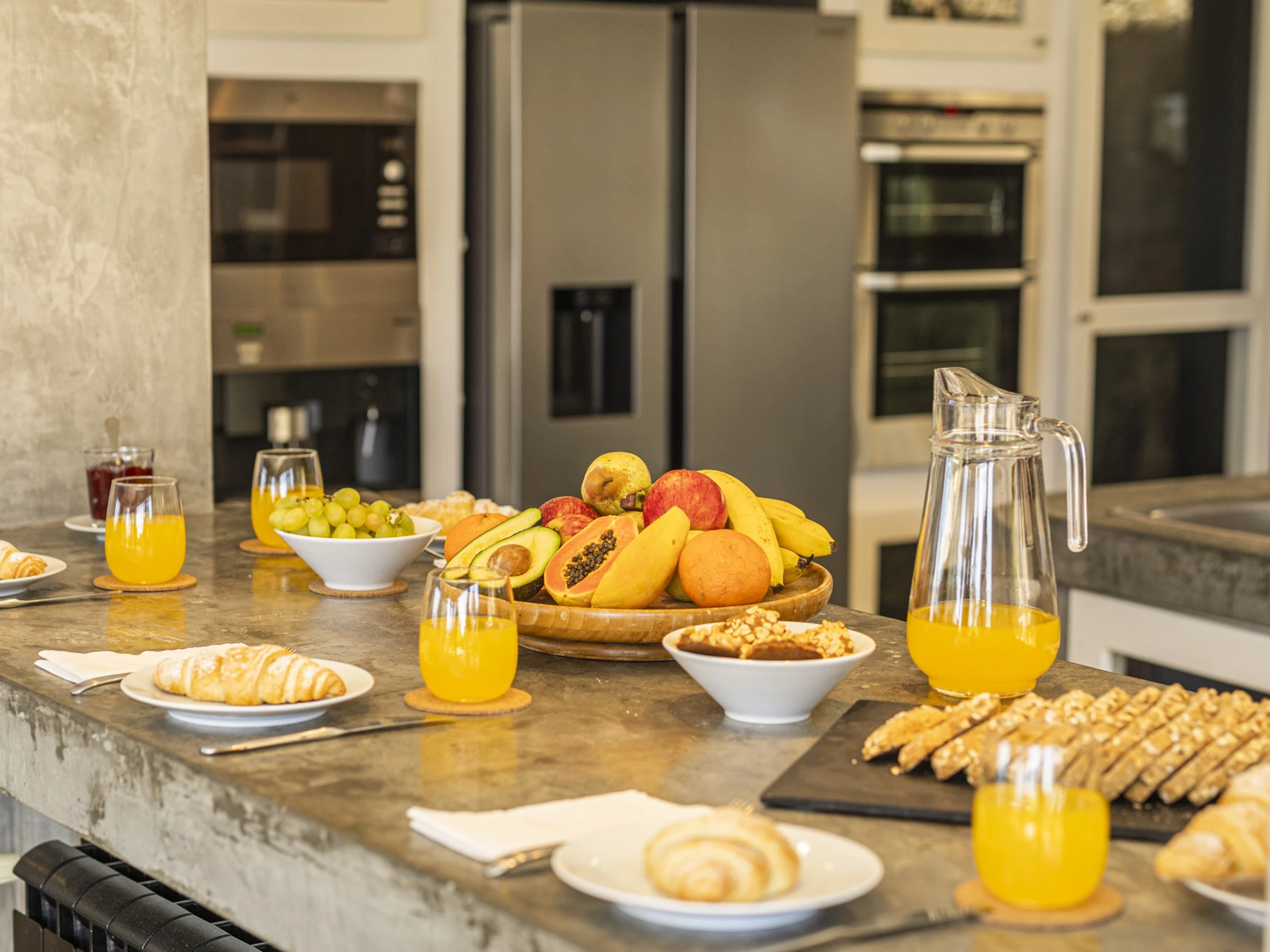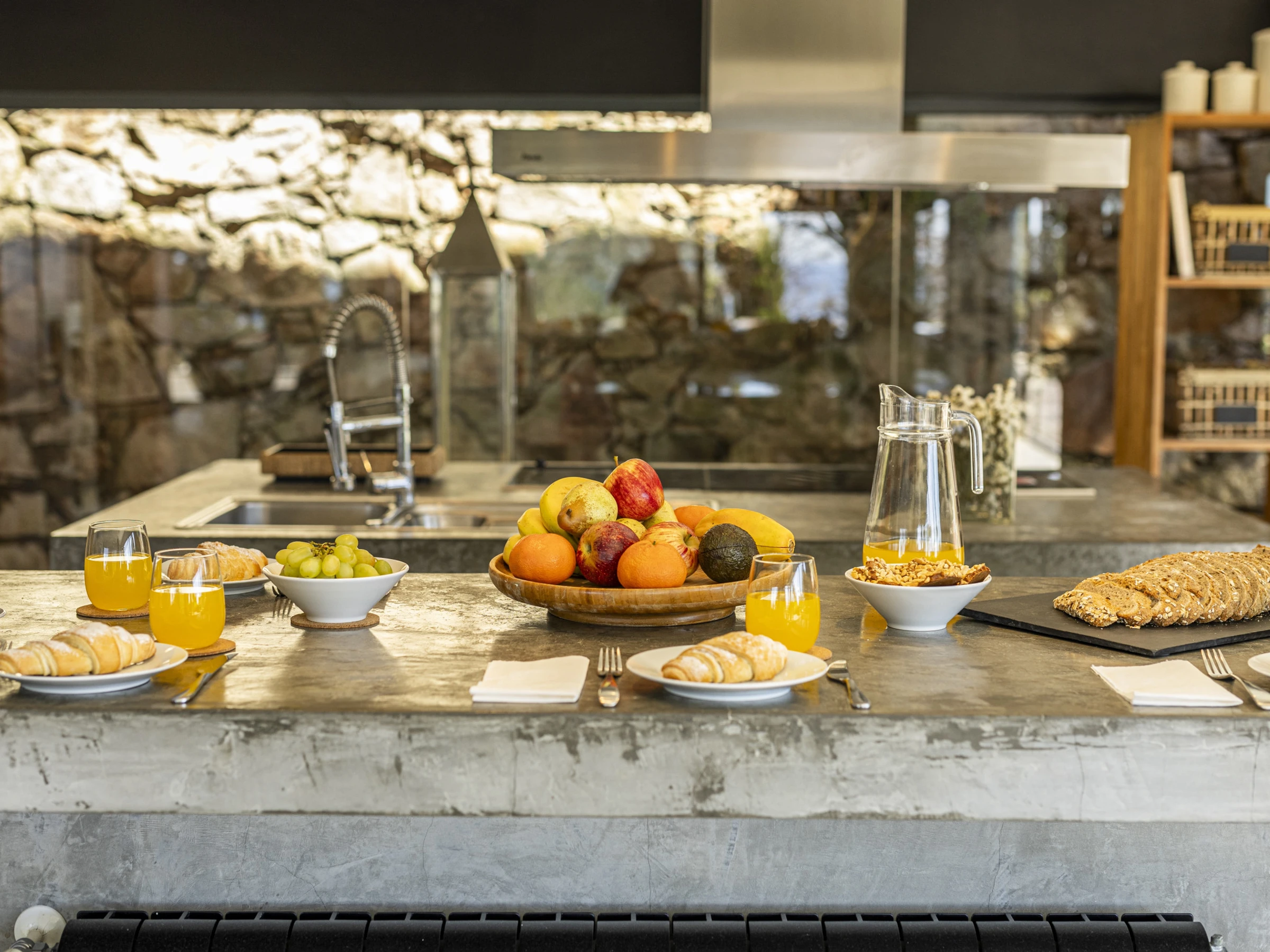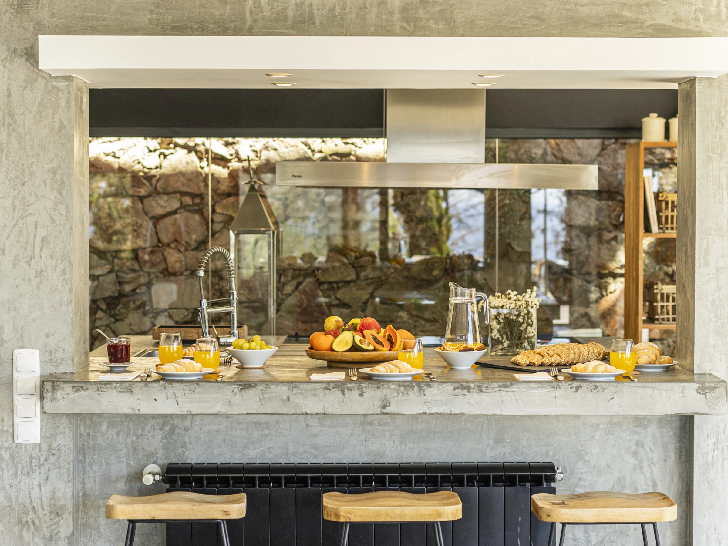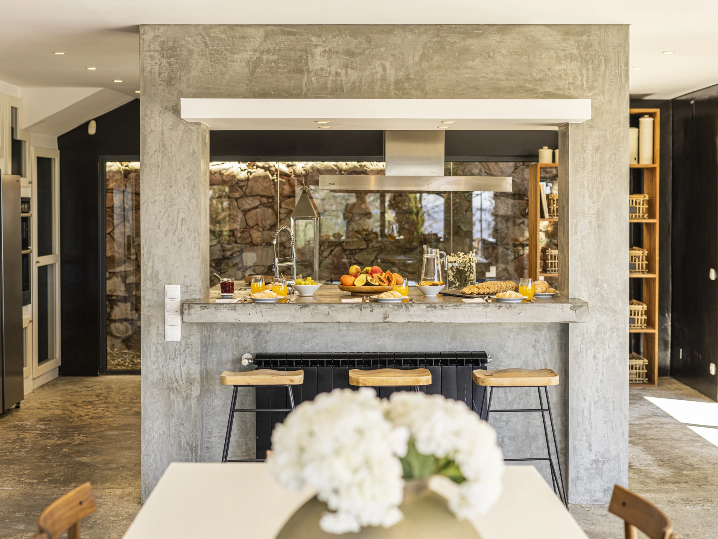 This villa has 4 bedrooms and 1 extra room in an outside annex, each room has vast amounts of space and built in storage. The kitchen with modern appliances is open plan connecting to the living area, which features a dining table large enough to sit 12 guests. A unique design feature of the kitchen is the floor to ceiling window which faces the back side of the property, looking onto a stone work wall.