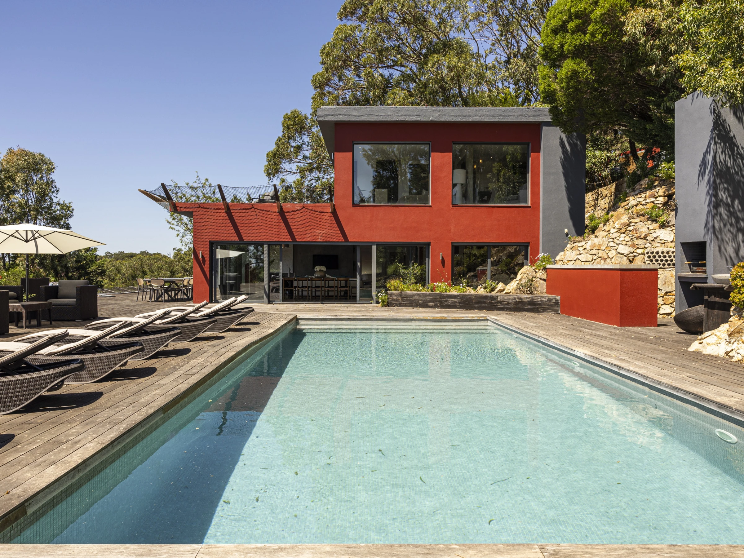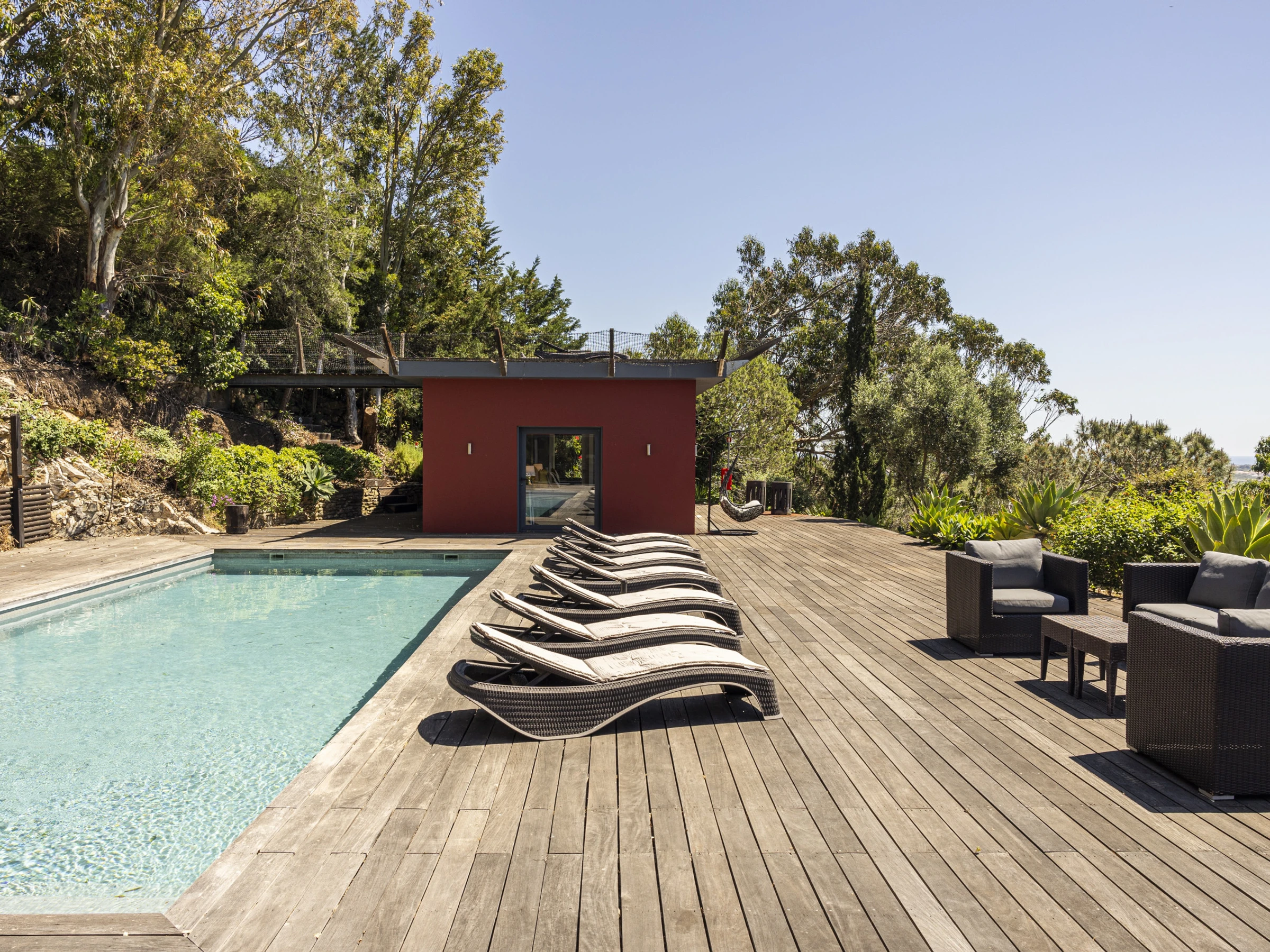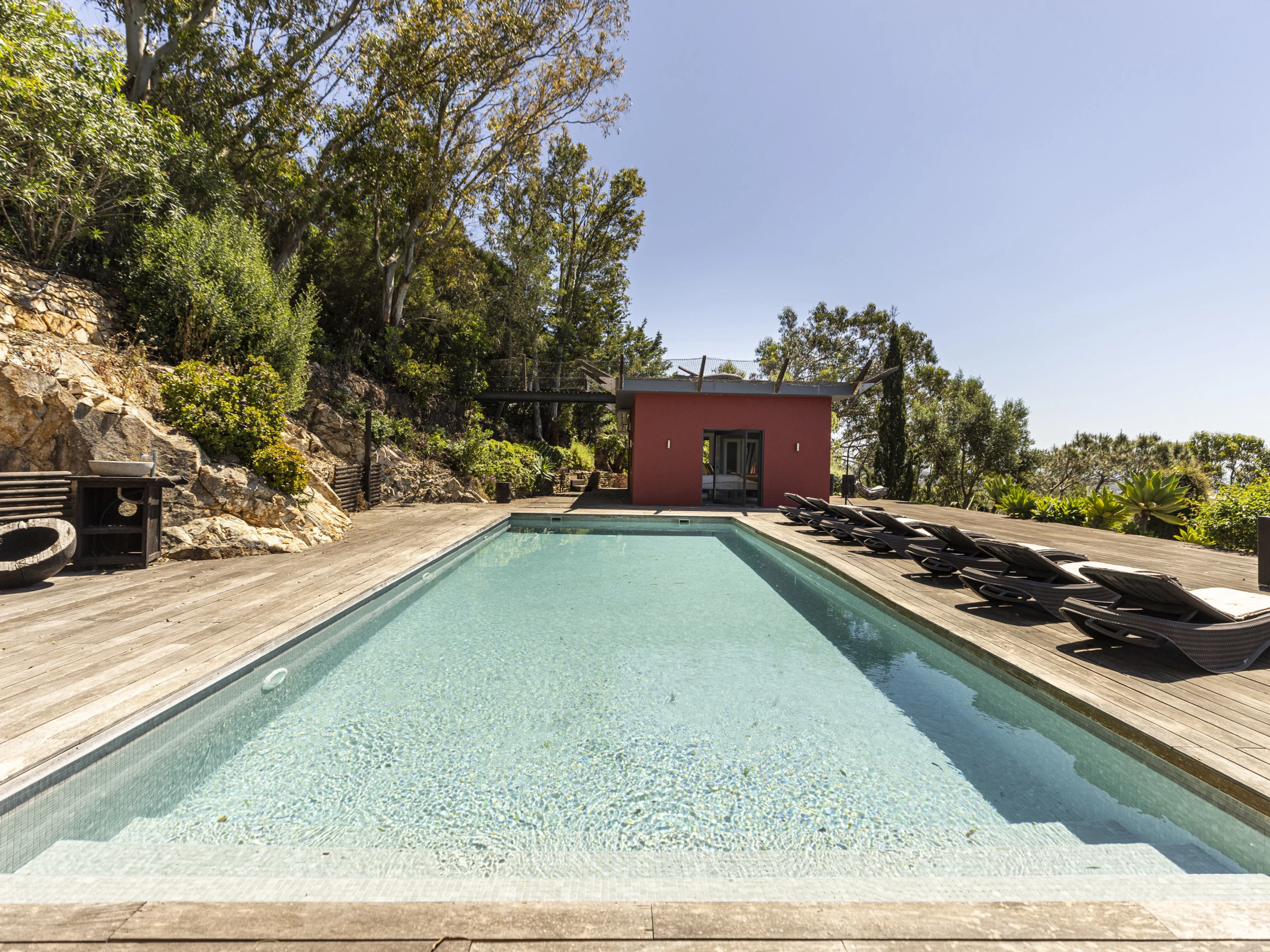 French doors feature heavily throughout this property, opening out to a wooden deck that create a private viewing platform onto the Atlantic ocean and rolling Sintra hills. The awe inspiring views from this villa are considered throughout each room. Inviting you to lie in bed, or on the plush sofa and enjoy the vast ocean views.Outside wooden decking surrounds the property with a heated swimming pool at the centre piece and BBQ. Sun beds and capsule group day beds scattered poolside make for idyllic summer relaxation with friends and family.