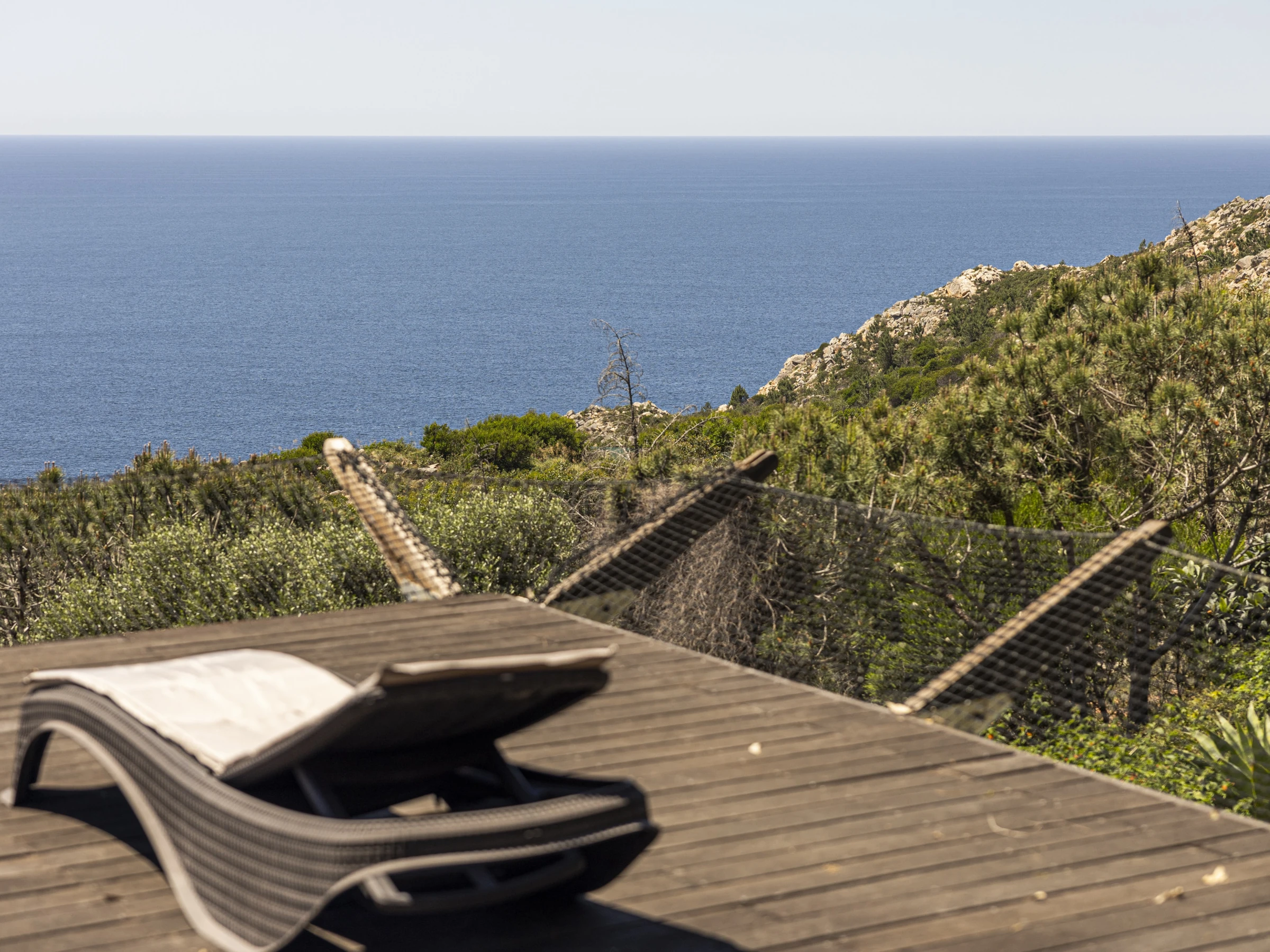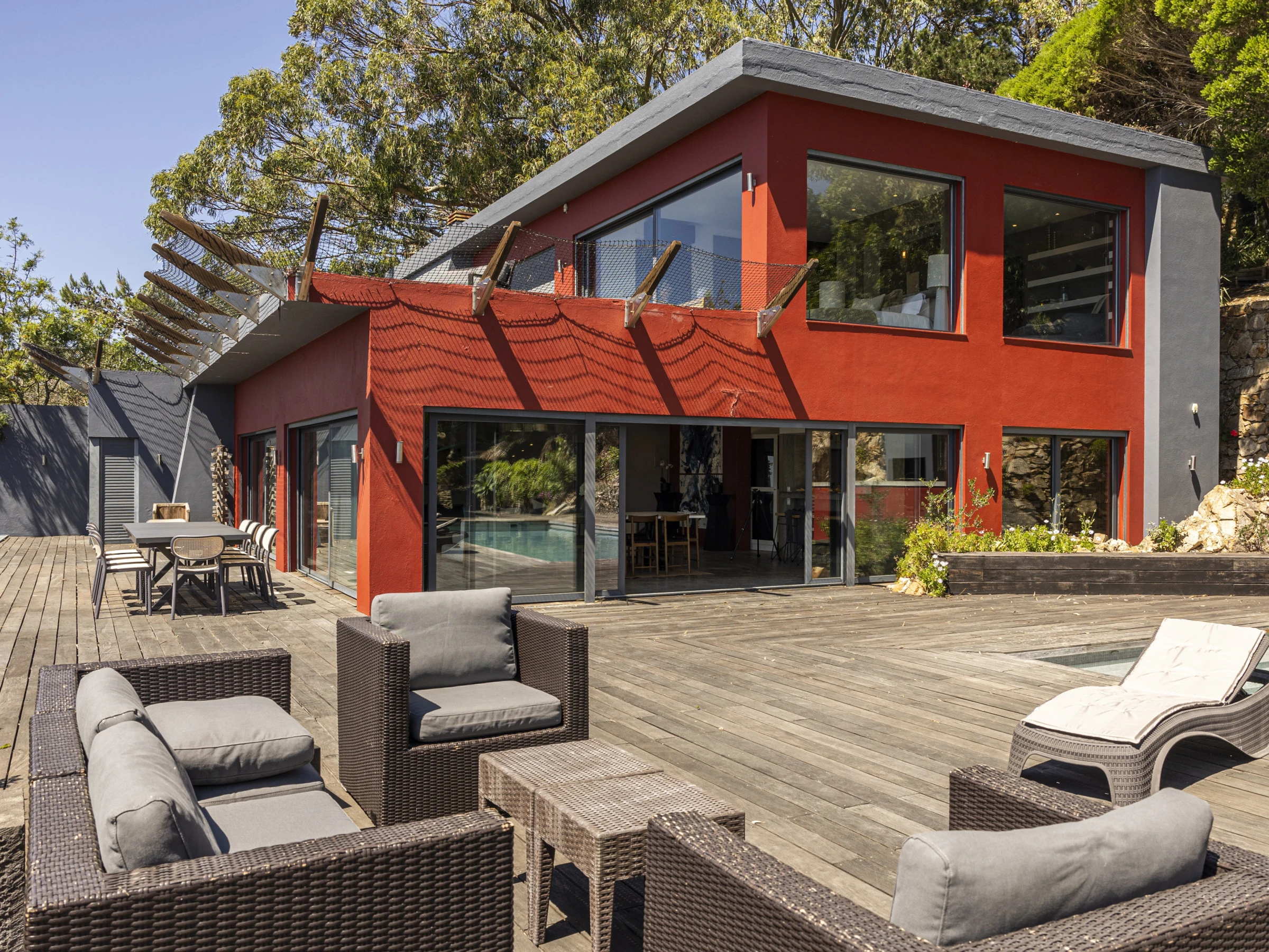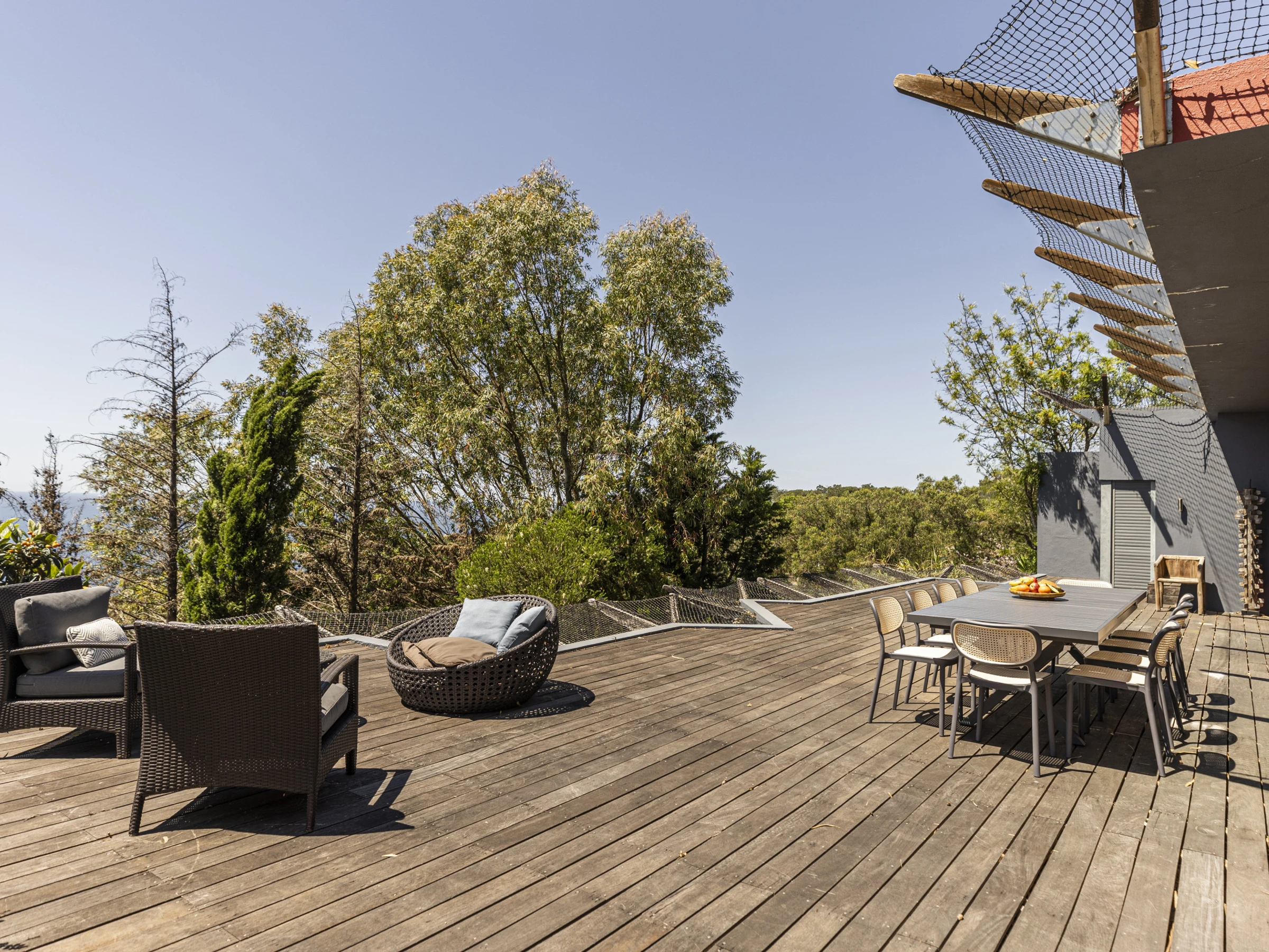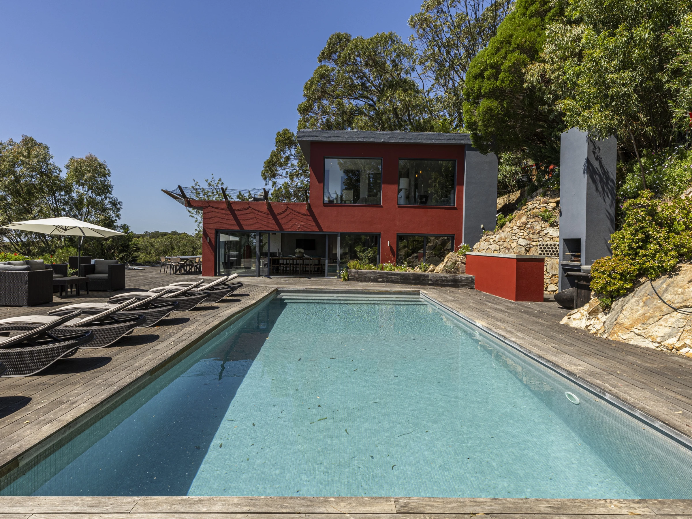 French doors feature heavily throughout this property, opening out to a wooden deck that create a private viewing platform onto the Atlantic ocean and rolling Sintra hills. The awe inspiring views from this villa are considered throughout each room. Inviting you to lie in bed, or on the plush sofa and enjoy the vast ocean views.Outside wooden decking surrounds the property with a heated swimming pool at the centre piece and BBQ. Sun beds and capsule group day beds scattered poolside make for idyllic summer relaxation with friends and family.