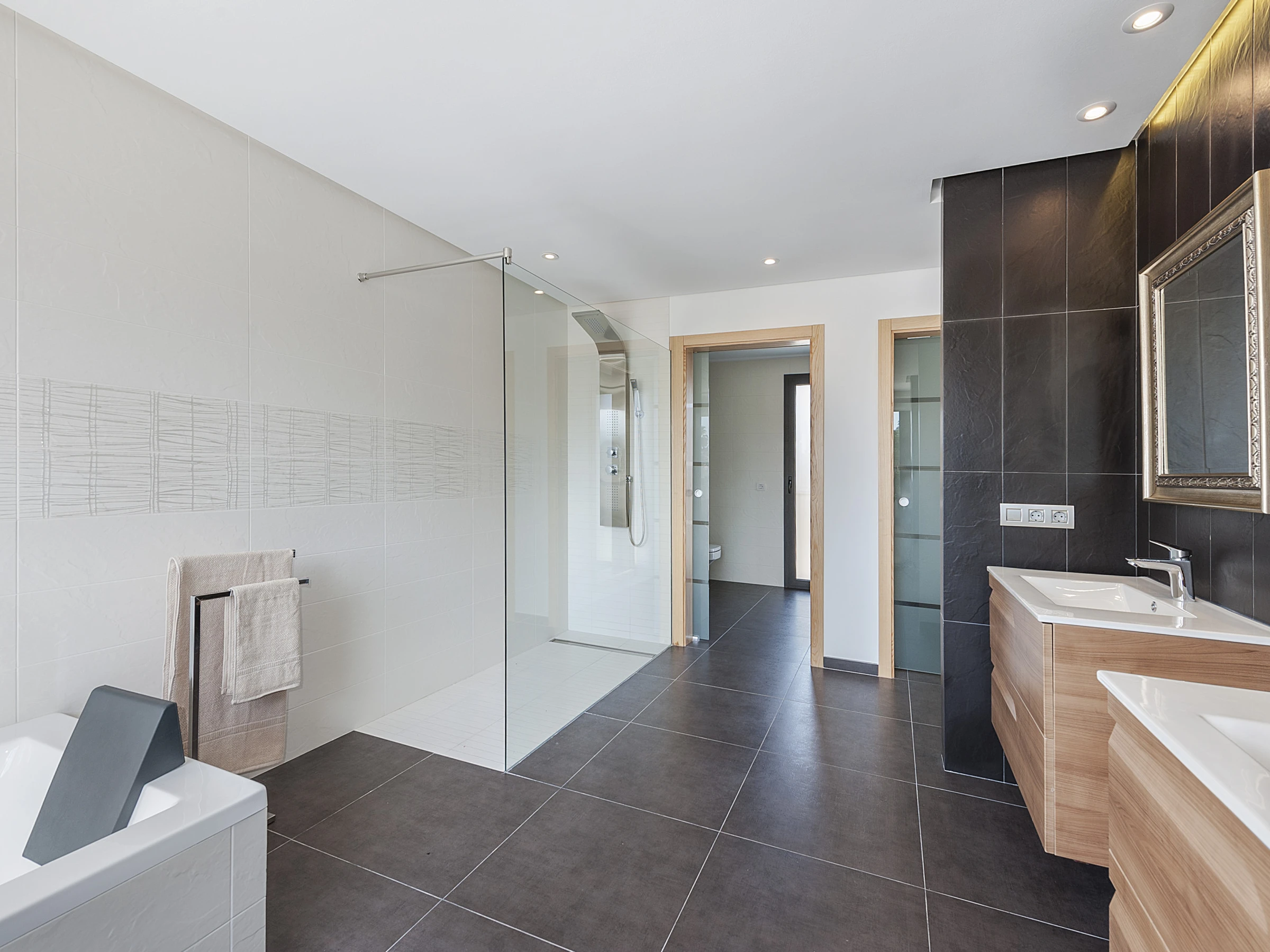 En la planta superior, encontrará 2 dormitorios individuales con acceso a un amplio balcón que ofrece vistas a la parte trasera de la villa, ideal para disfrutar de las últimas horas de luz solar. Además, el dormitorio principal cuenta con una cama de matrimonio, un elegante vestidor y un baño privado con bañera de hidromasaje, ducha de hidromasaje y lavabo doble, proporcionando la máxima comodidad y privacidad.