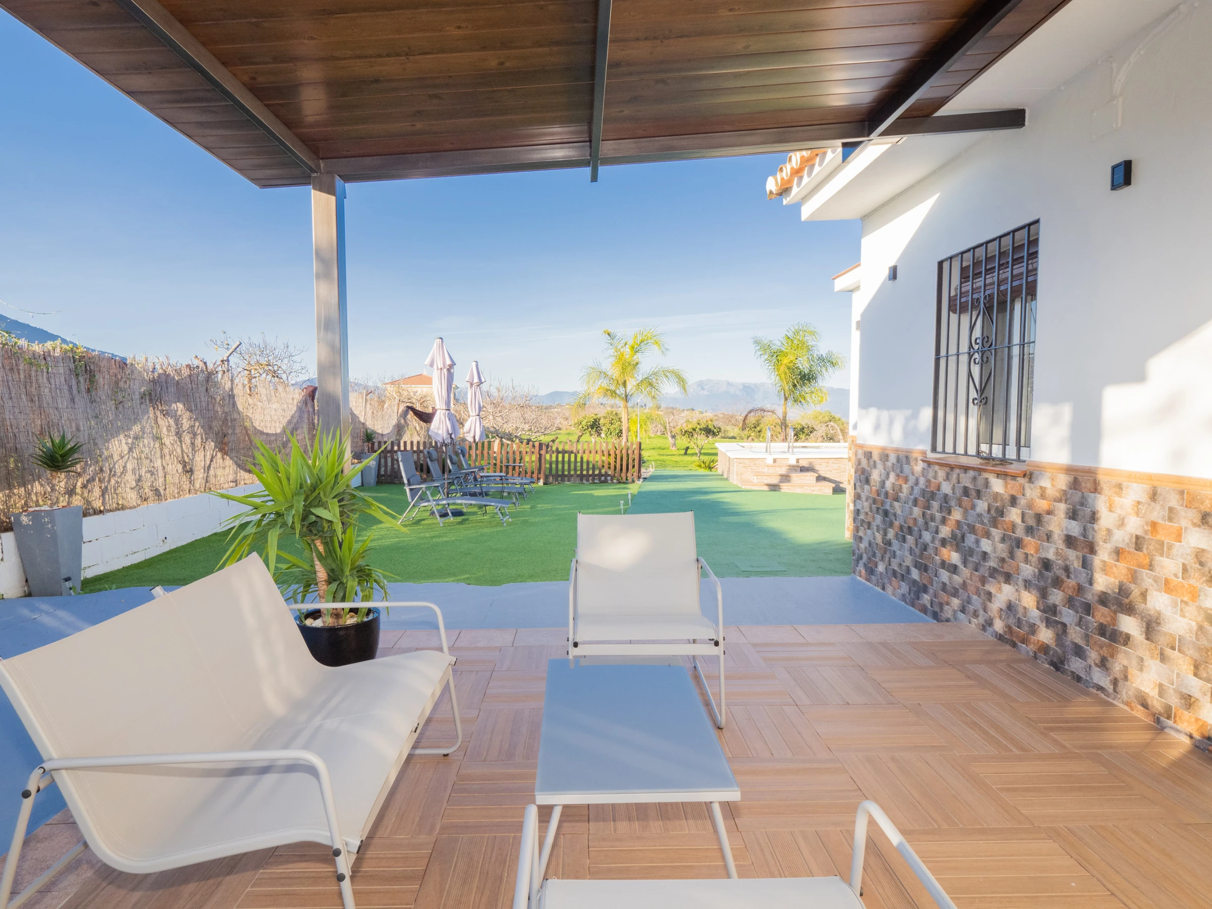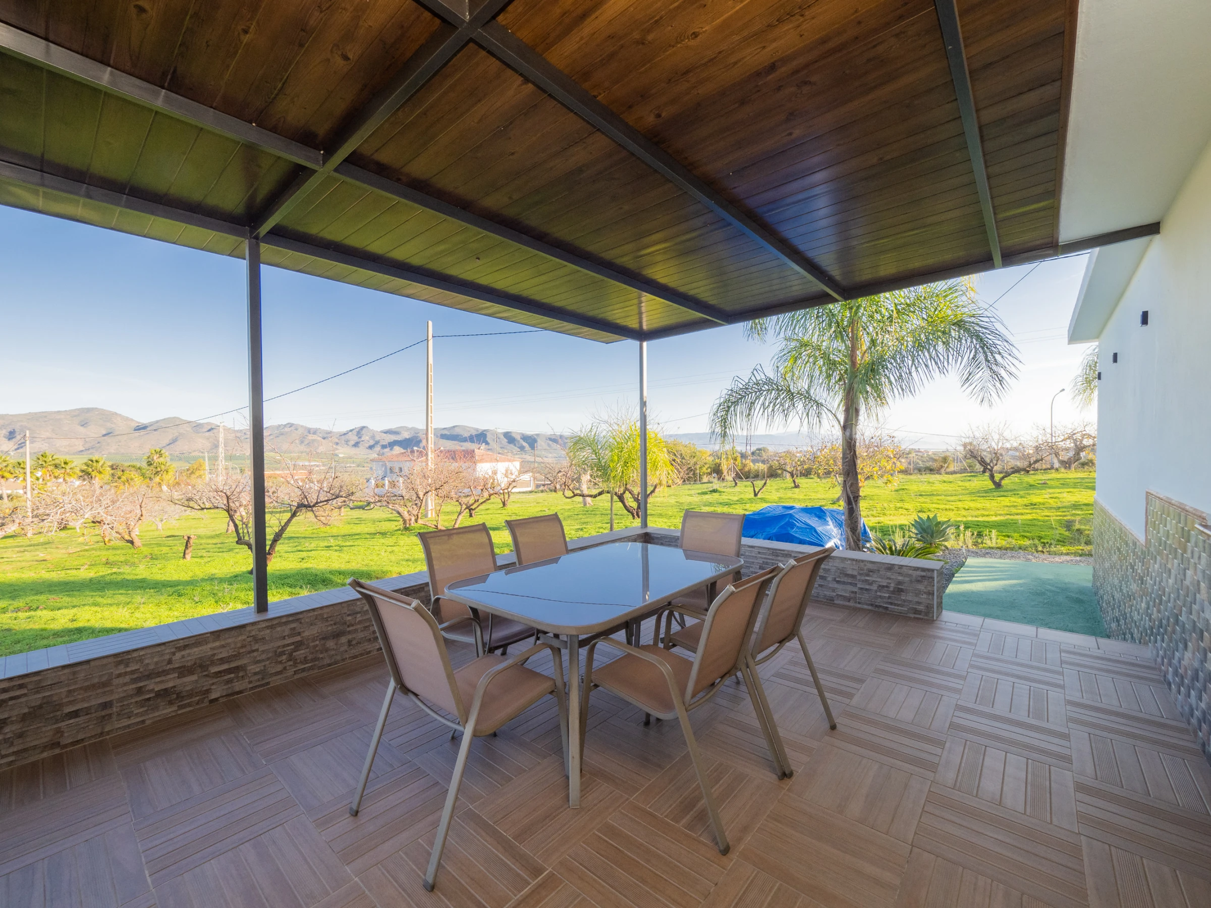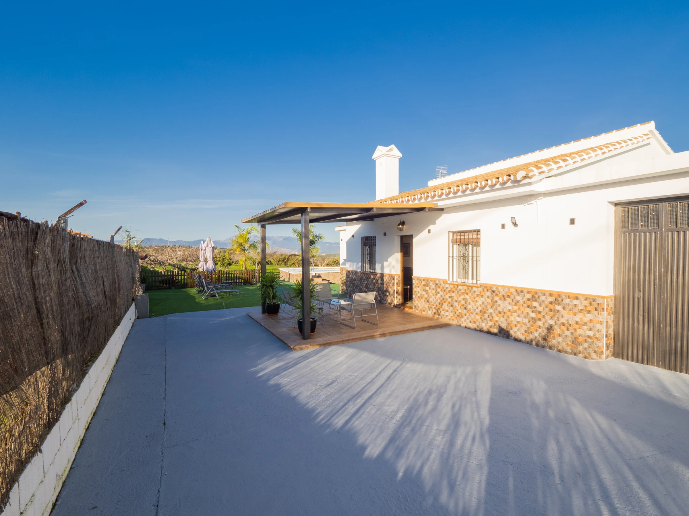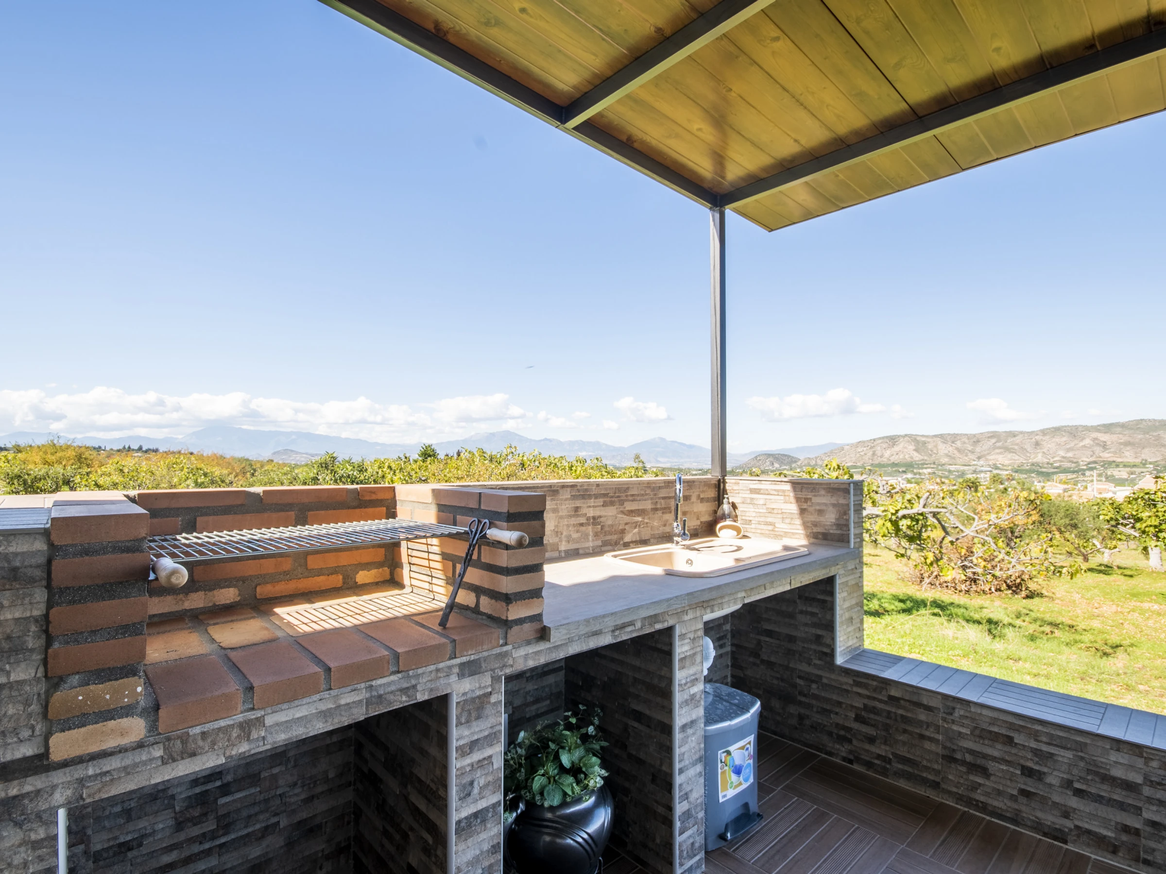 La casa está situada en una gran parcela privada y vallada, rodeada de árboles que ofrecen privacidad y sombra. Destaca una amplia terraza cubierta con barbacoa para disfrutar de comidas al aire libre y una piscina privada con tumbonas y sombrillas, ubicada en un nivel superior para mayor seguridad, especialmente pensada para niños. Las vistas desde la casa son espectaculares y el ambiente tranquilo, en una zona rural ideal para familias.