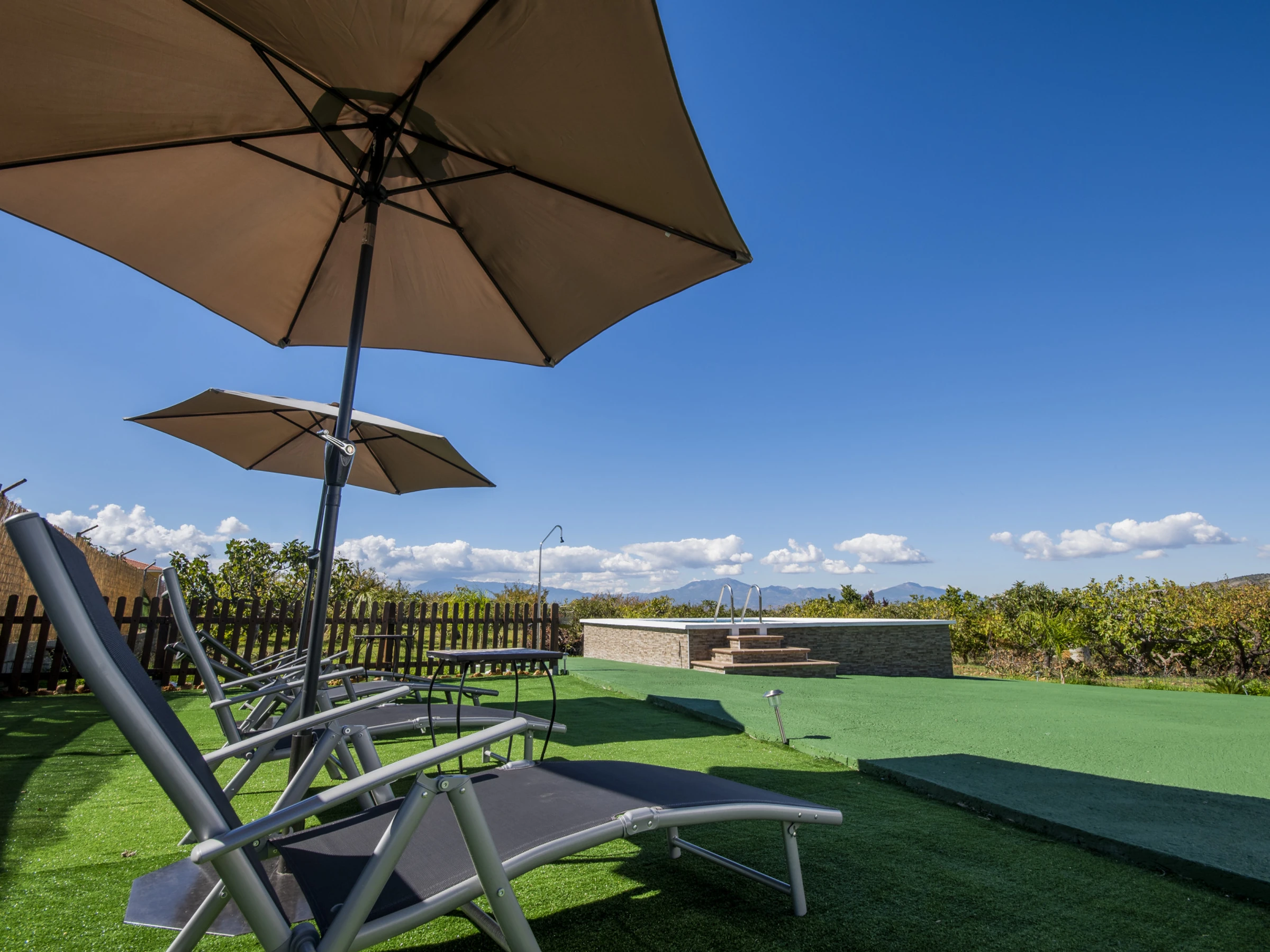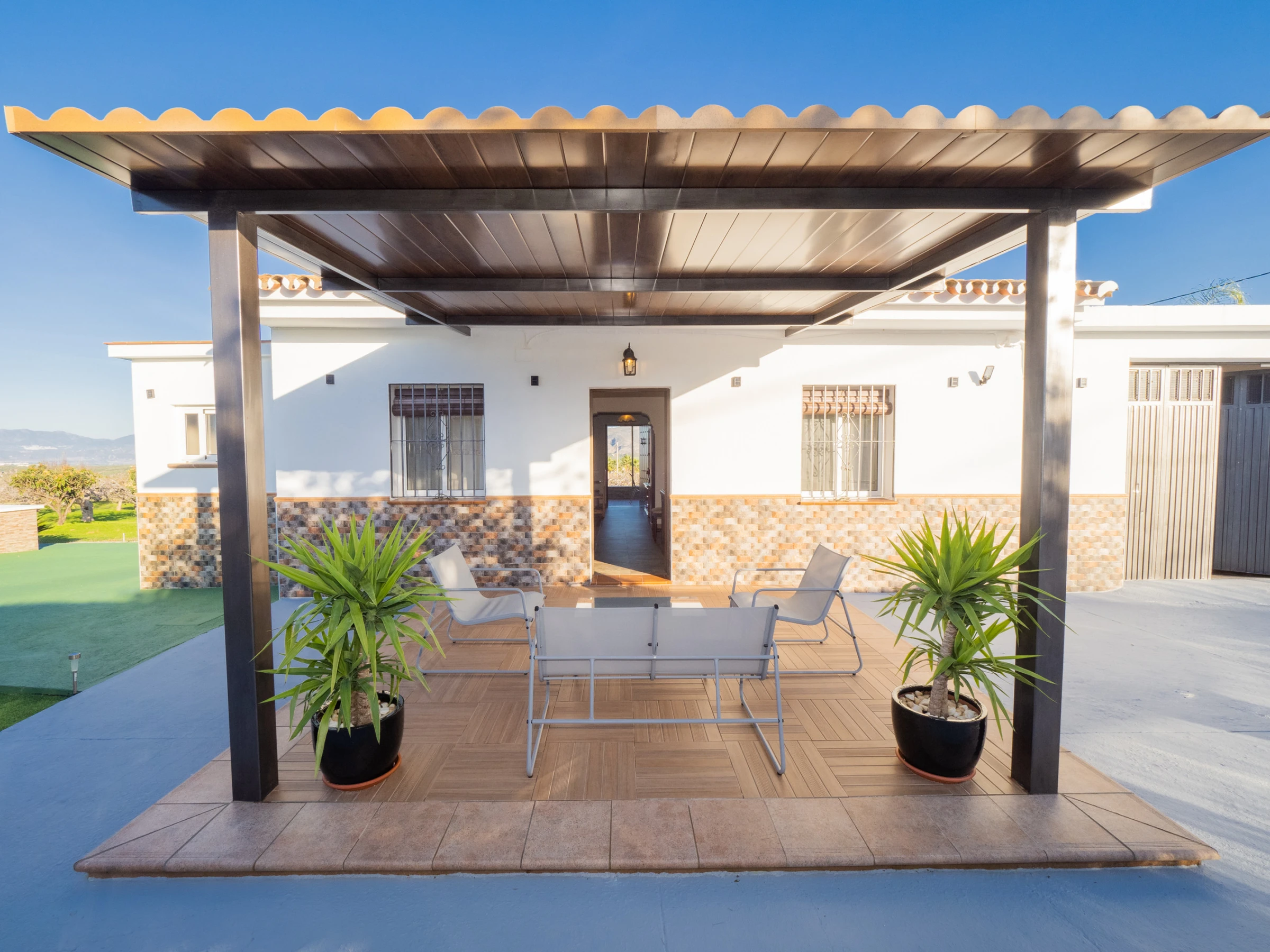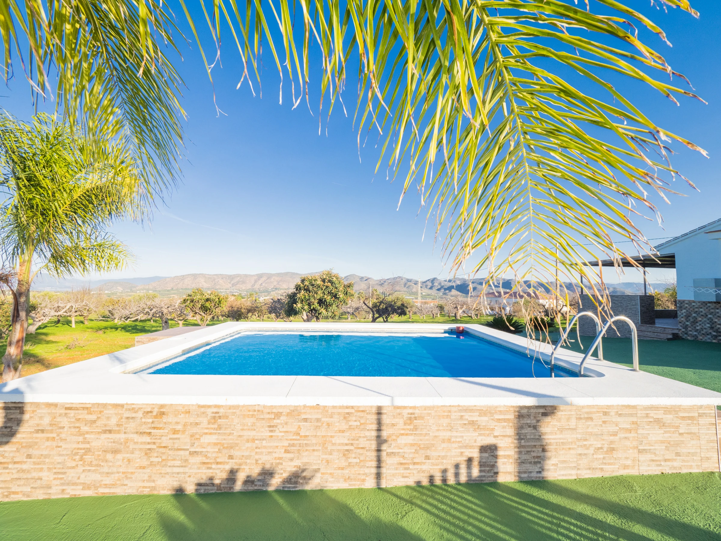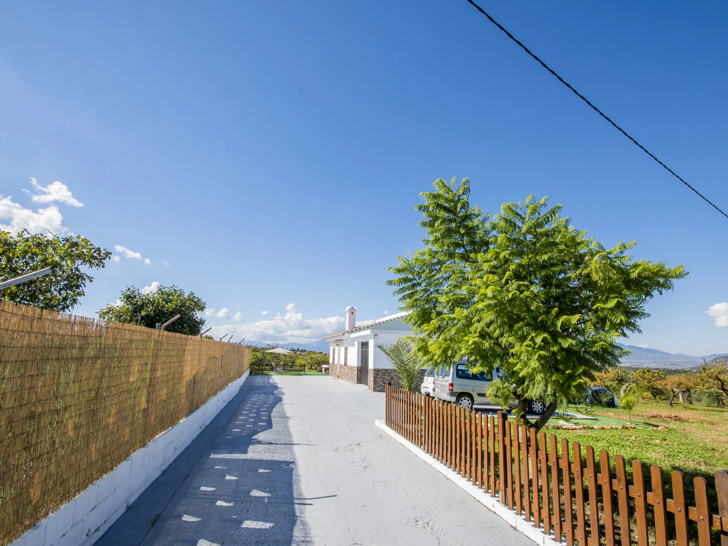 La casa está situada en una gran parcela privada y vallada, rodeada de árboles que ofrecen privacidad y sombra. Destaca una amplia terraza cubierta con barbacoa para disfrutar de comidas al aire libre y una piscina privada con tumbonas y sombrillas, ubicada en un nivel superior para mayor seguridad, especialmente pensada para niños. Las vistas desde la casa son espectaculares y el ambiente tranquilo, en una zona rural ideal para familias.