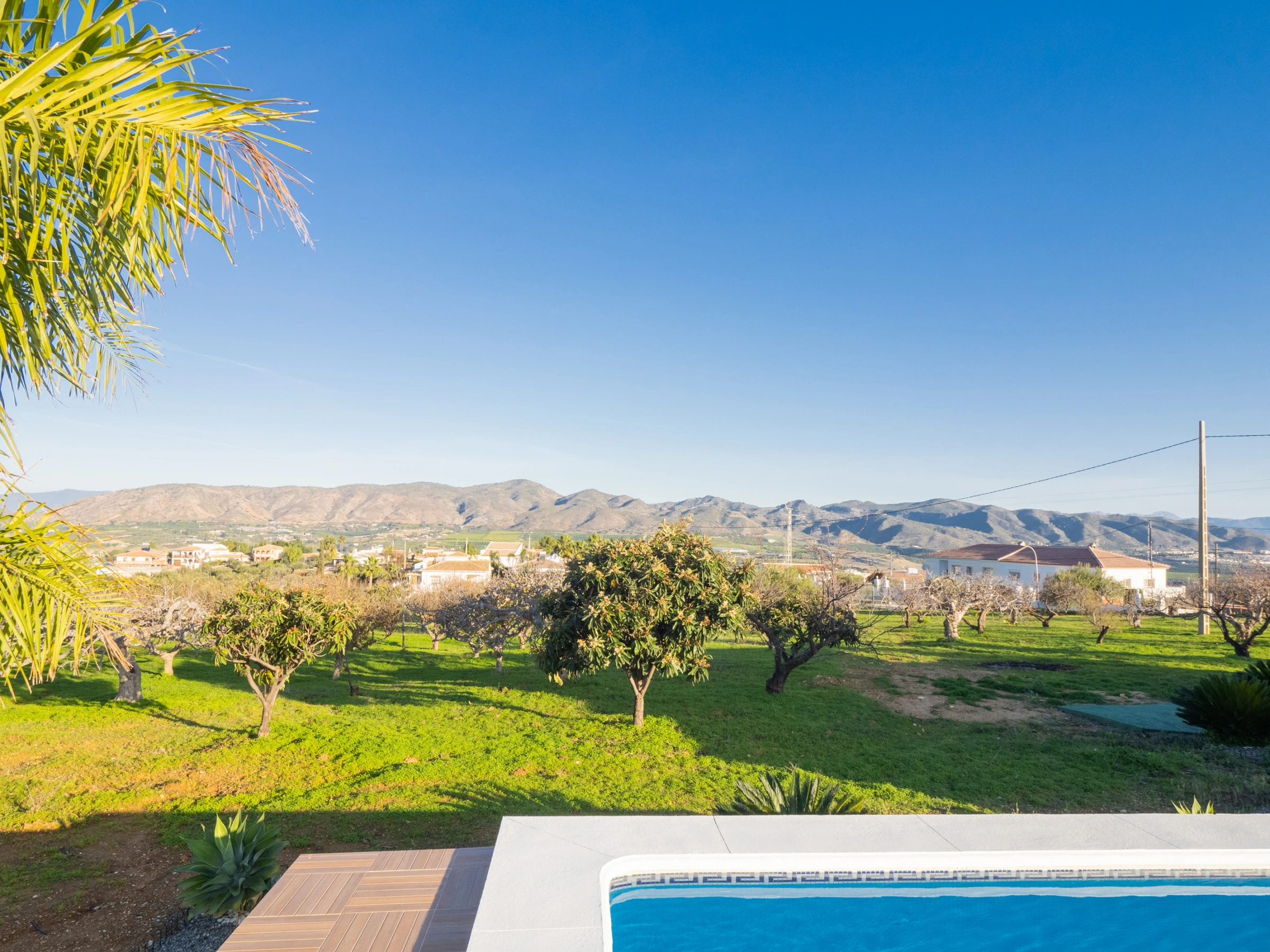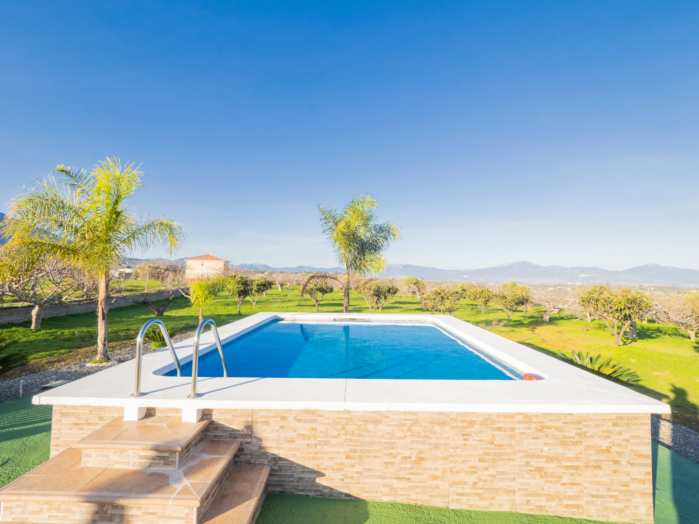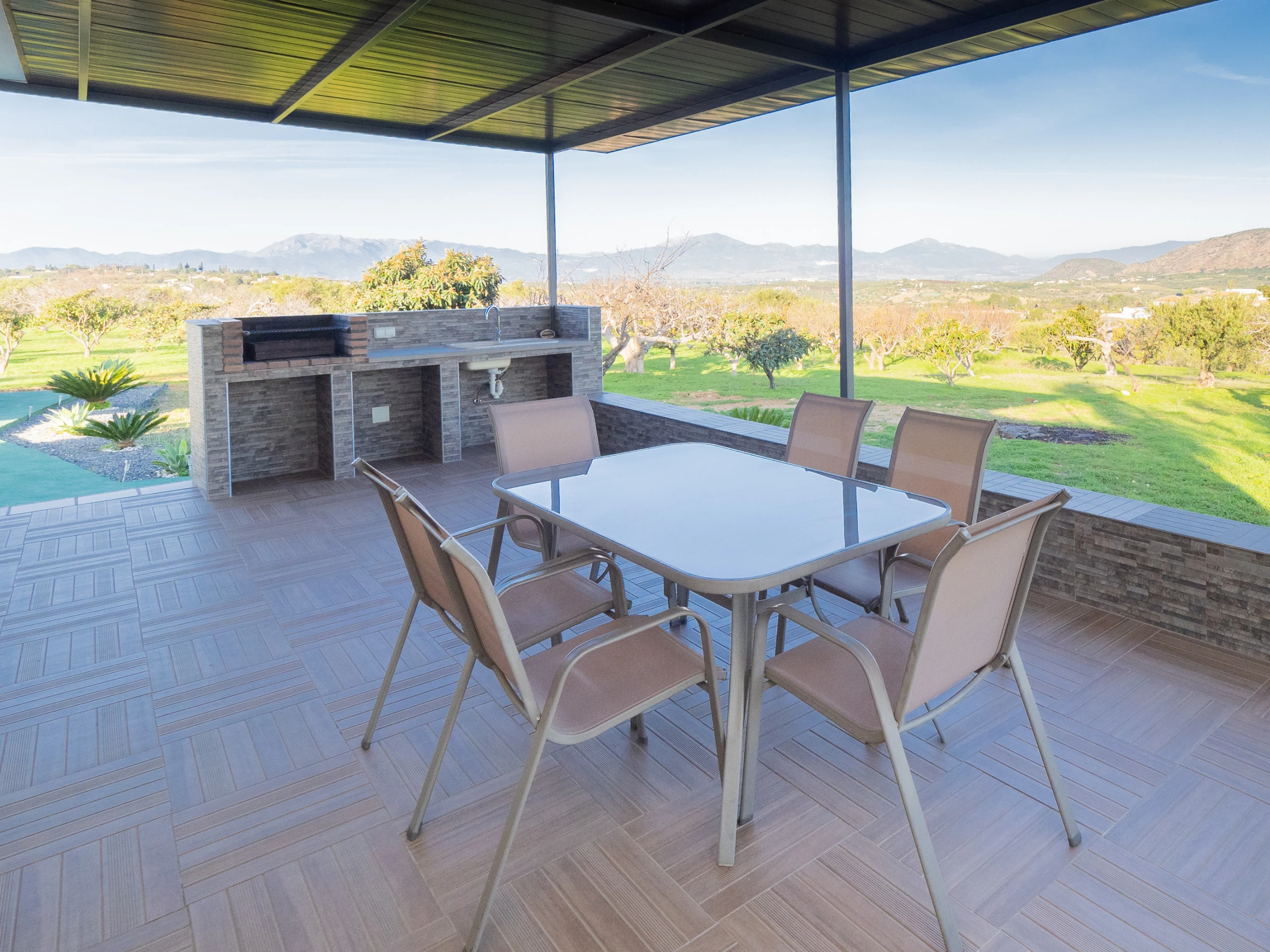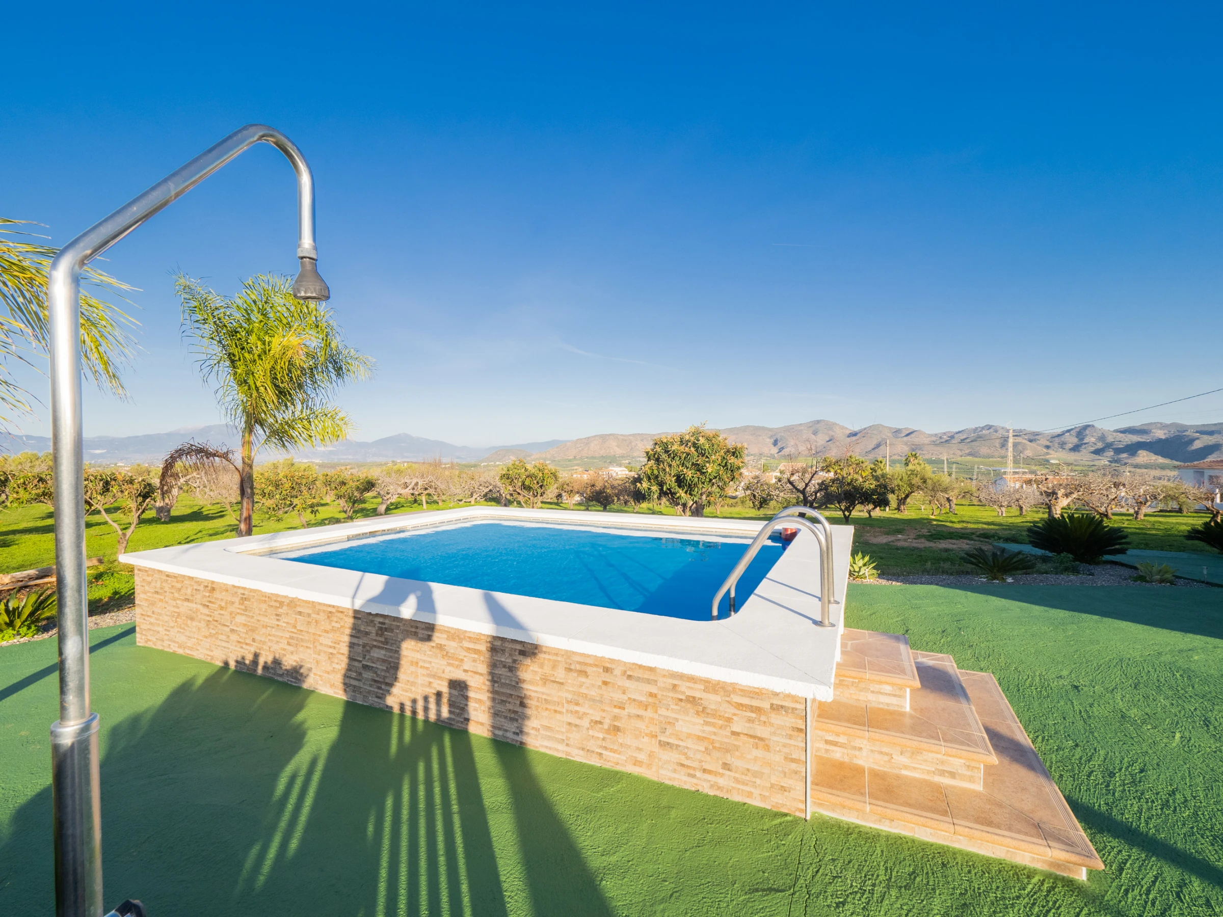 La casa está situada en una gran parcela privada y vallada, rodeada de árboles que ofrecen privacidad y sombra. Destaca una amplia terraza cubierta con barbacoa para disfrutar de comidas al aire libre y una piscina privada con tumbonas y sombrillas, ubicada en un nivel superior para mayor seguridad, especialmente pensada para niños. Las vistas desde la casa son espectaculares y el ambiente tranquilo, en una zona rural ideal para familias.