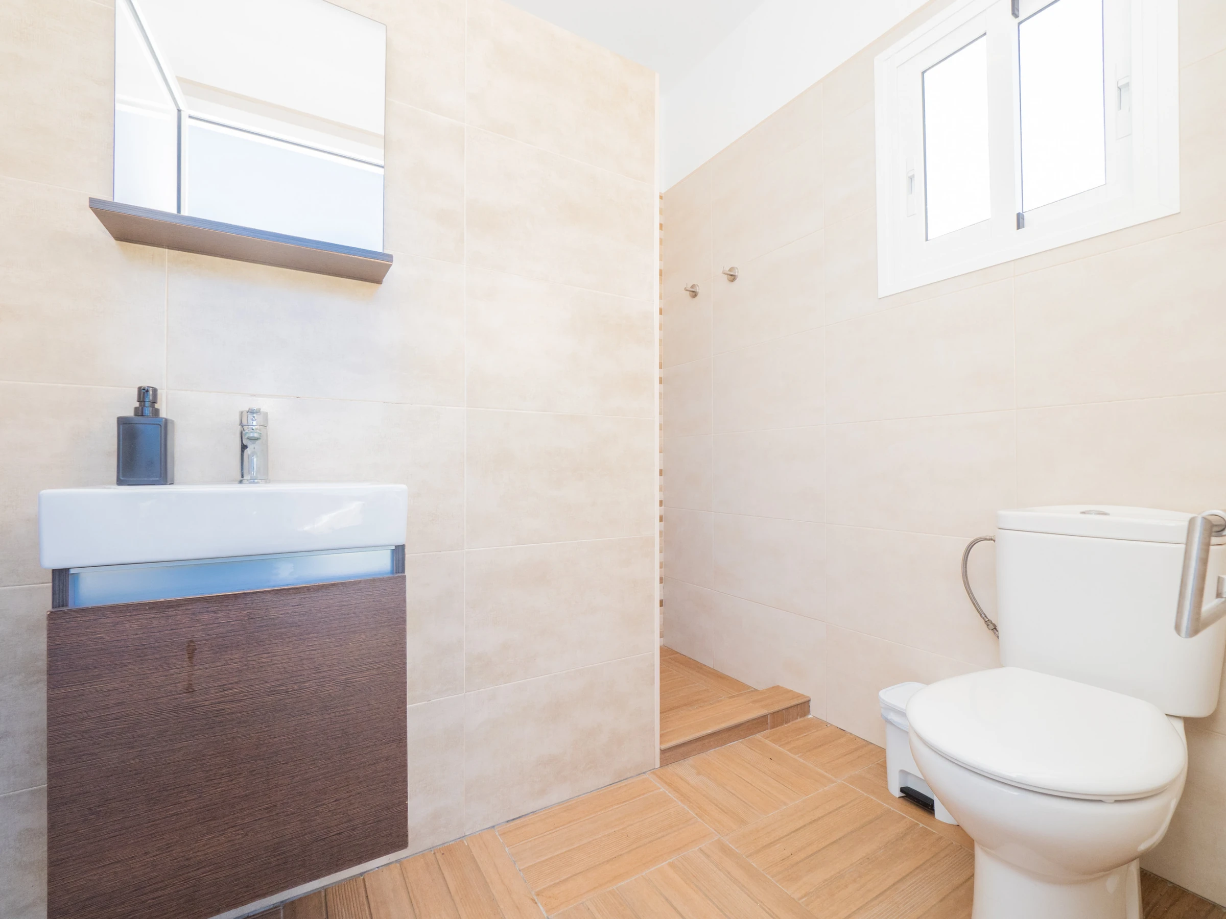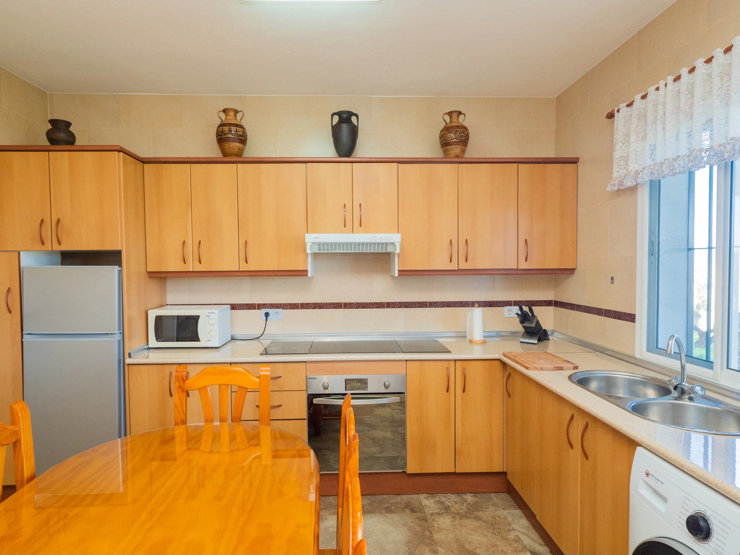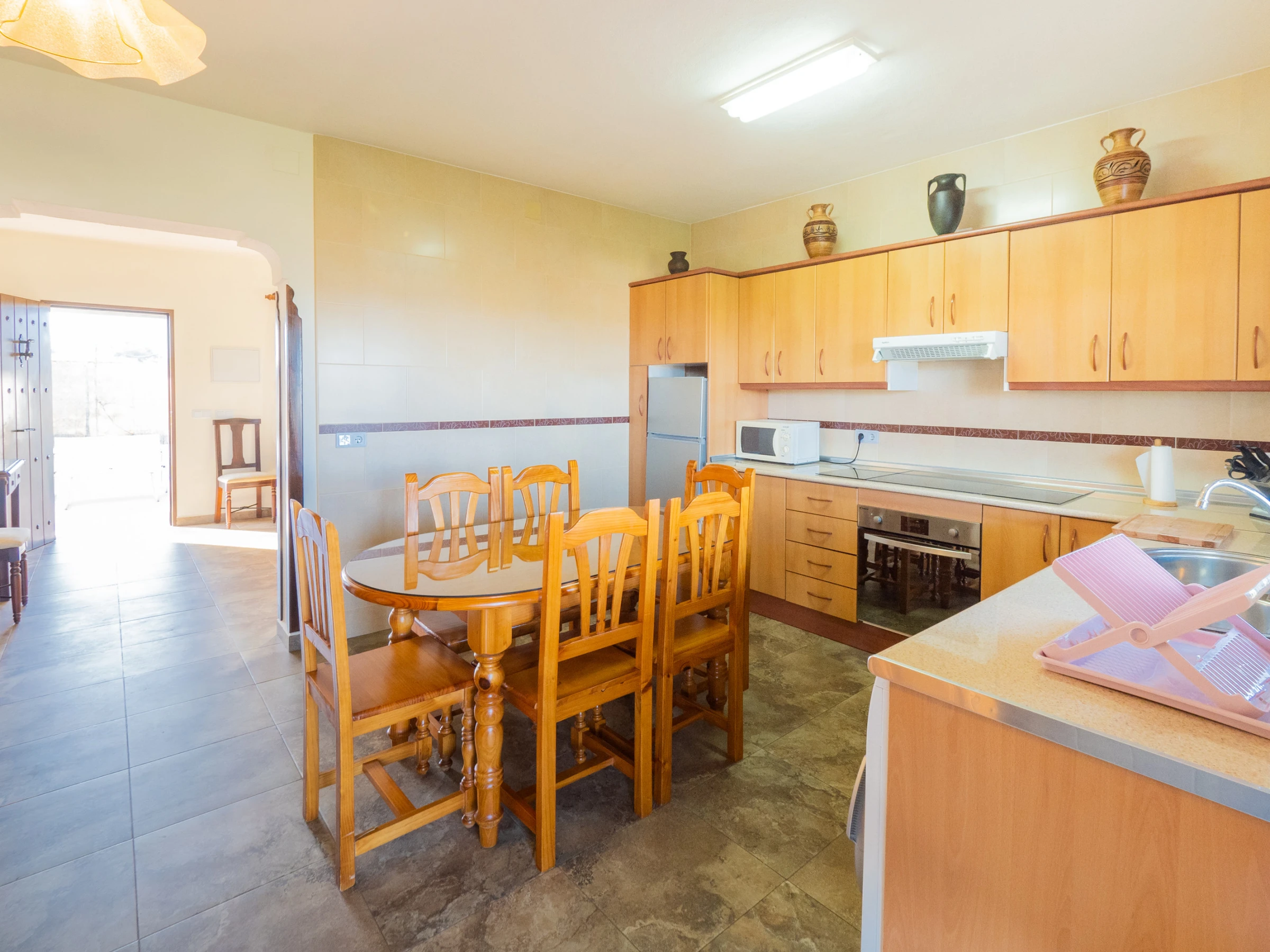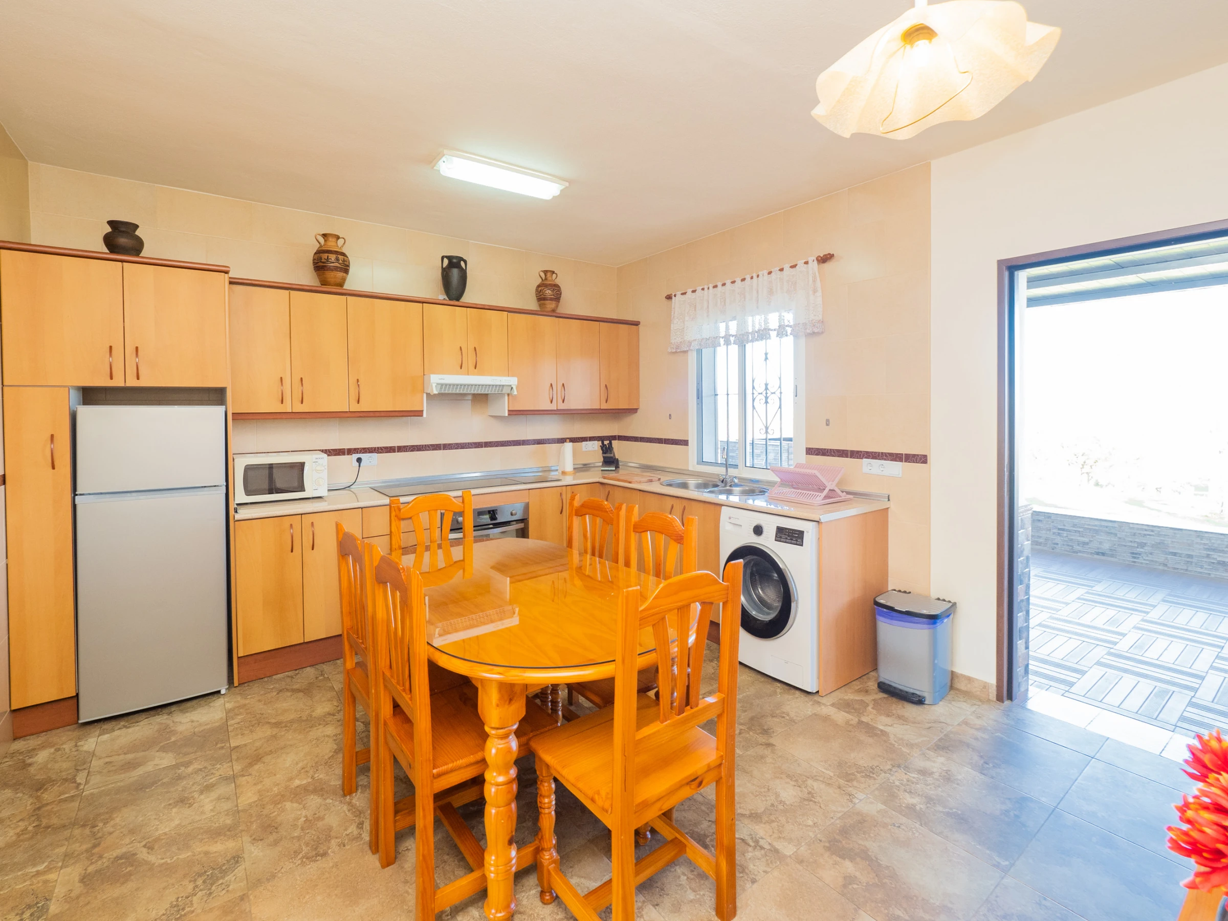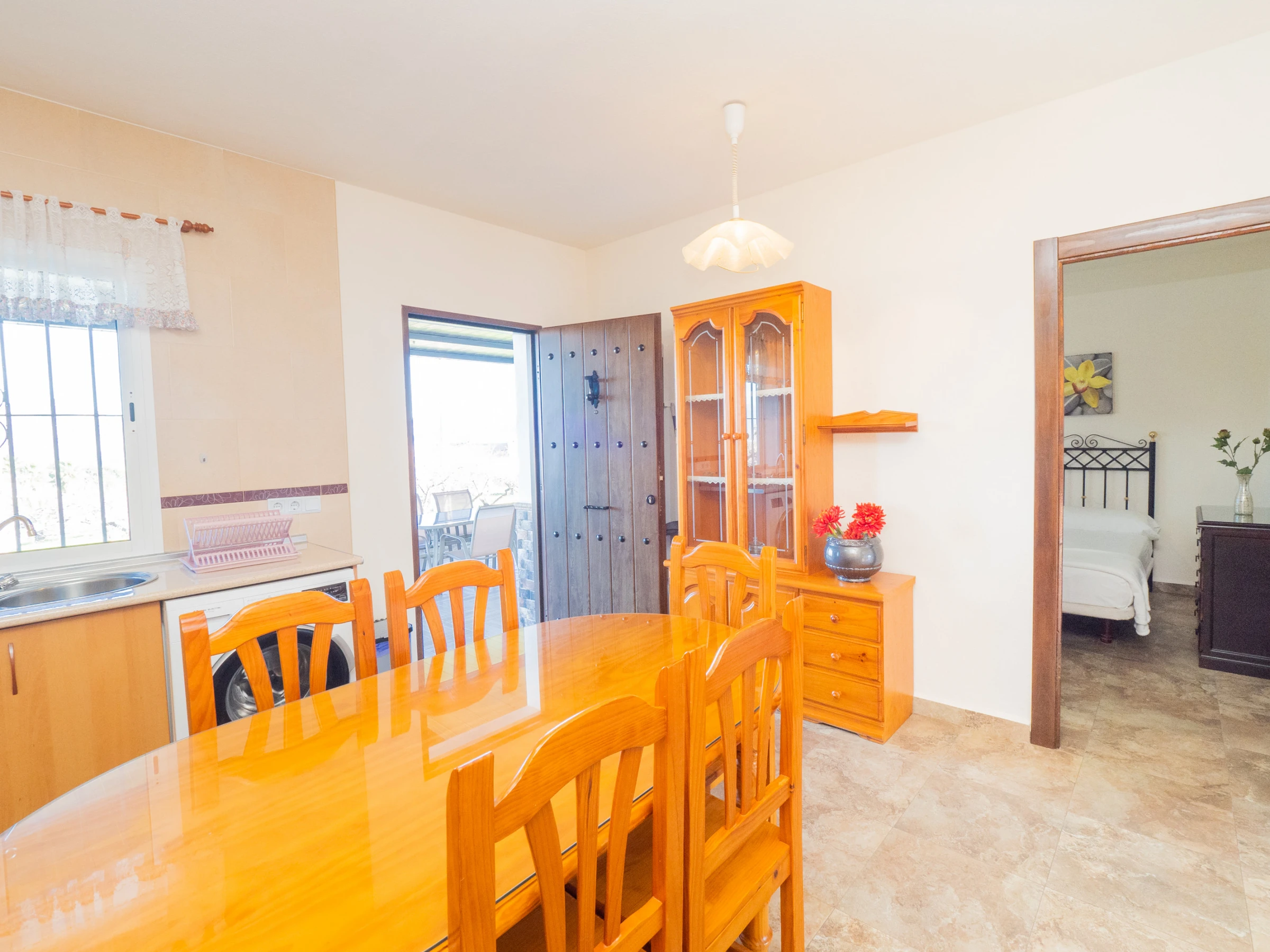 La cocina está completamente equipada con todo lo necesario: cubertería, vajilla, utensilios, cafetera, hervidor, exprimidor, freidora, horno y microondas, además de una lavadora para estancias más largas. La vivienda tiene un baño interior con ducha y un baño exterior que acompaña a la piscina, facilitando el uso durante los días de piscina.