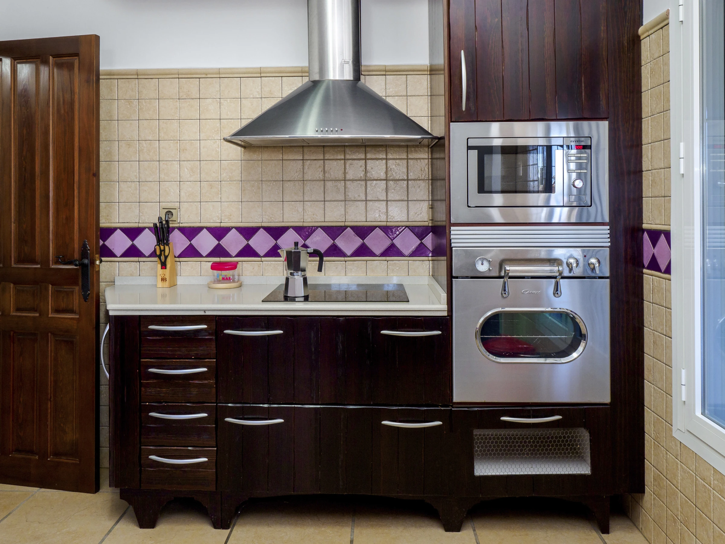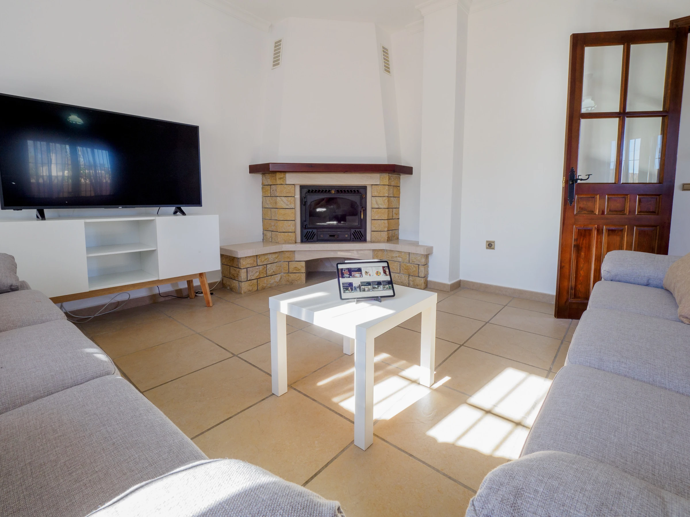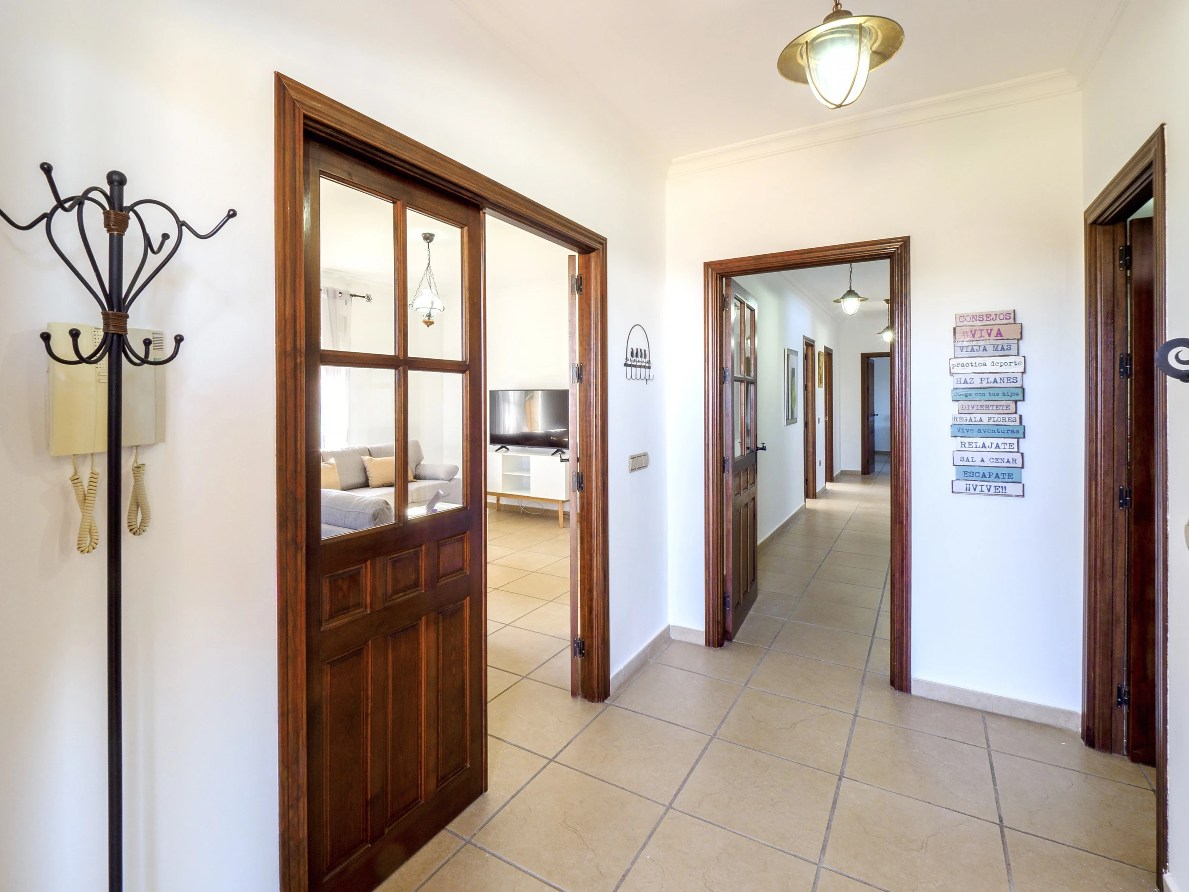 La villa está distribuida en dos plantas. En la planta baja encontrarás un salón comedor acogedor con chimenea (leña no incluida), ideal para momentos de relax y convivencia, además de una cocina independiente completamente equipada con electrodomésticos modernos como nevera, microondas, horno, lavavajillas y más. Junto a la cocina, un lavadero cerrado ofrece espacio para lavar, planchar o simplemente disfrutar de un momento tranquilo con vistas al paisaje. En esta planta también hay tres dormitorios matrimoniales luminosos, todos con armarios y un baño completo, además de una habitación con vestidor y baño en suite con ducha.