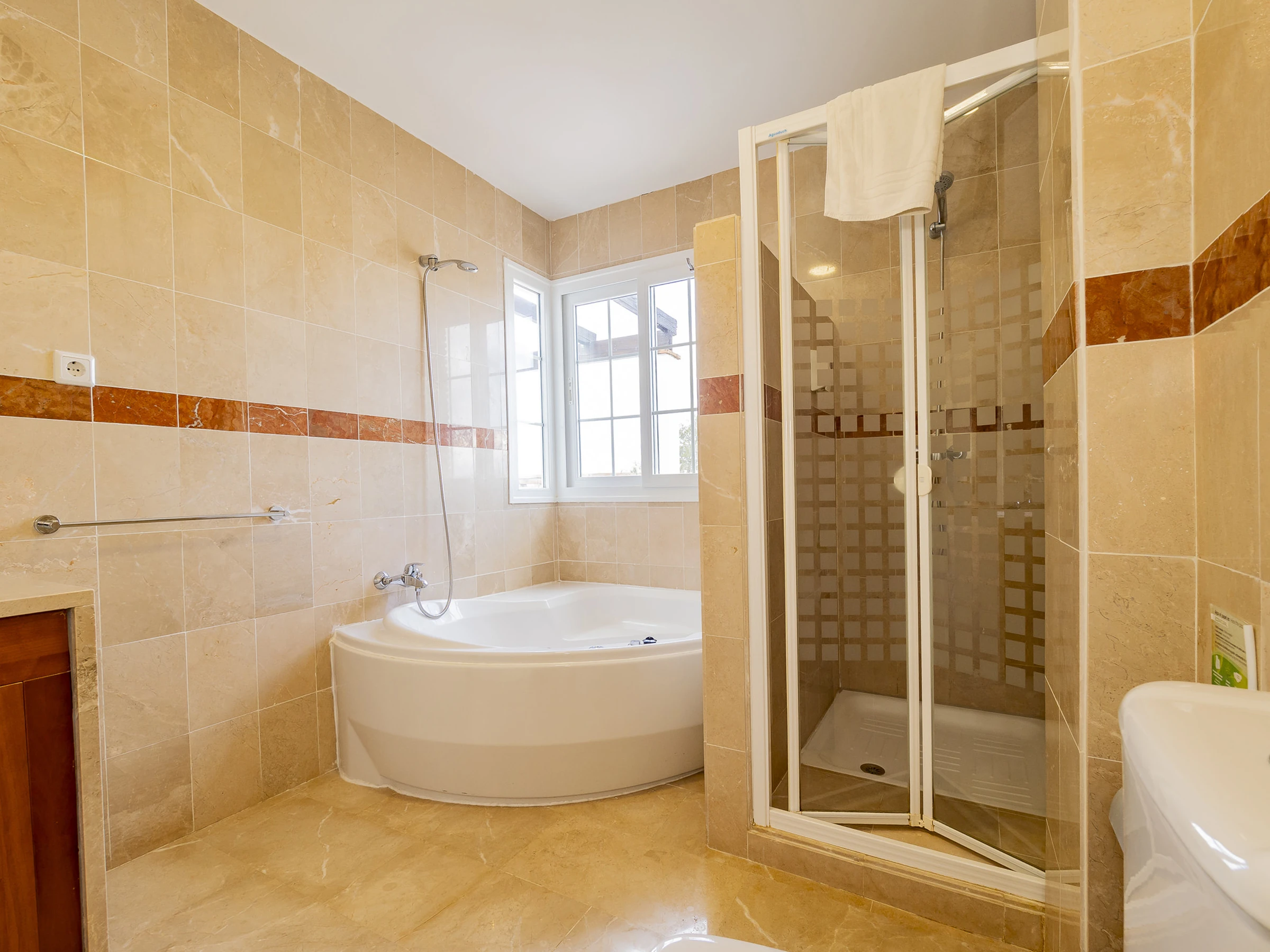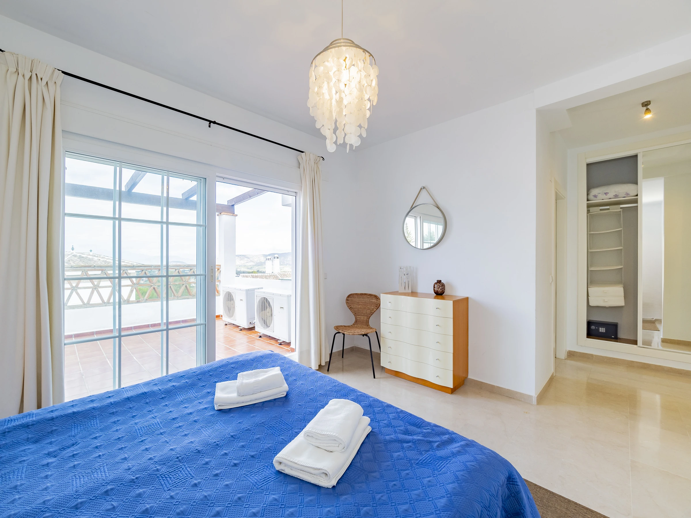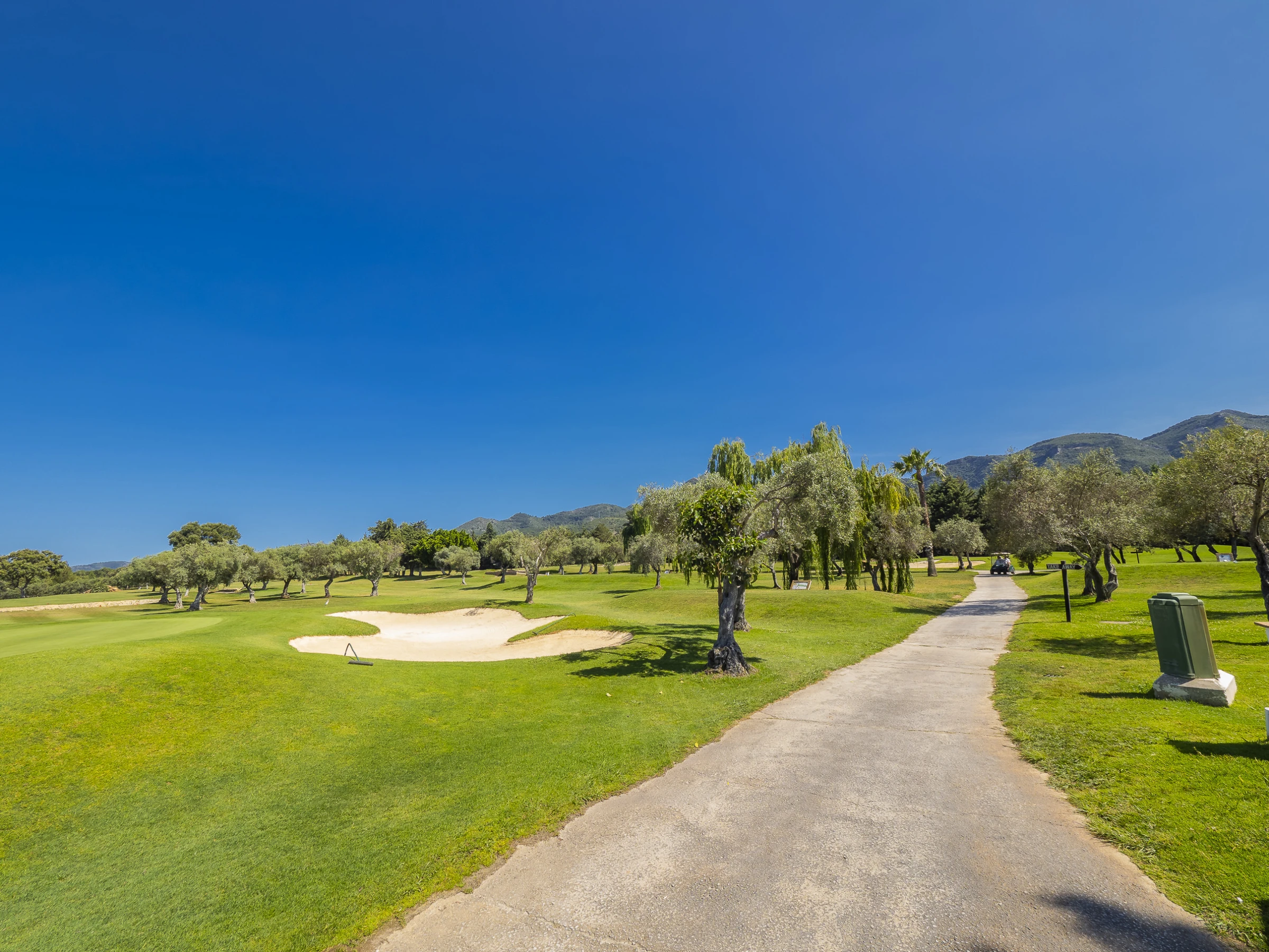 En la planta superior se ubican los dos dormitorios, cada uno con terraza privada y baño en suite. El dormitorio principal dispone de cama de matrimonio, plato de ducha y bañera, mientras que el segundo dormitorio tiene dos camas individuales y baño con plato de ducha. Las terrazas ofrecen vistas al campo de golf y a la montaña, creando un ambiente relajante y natural. 🌄🛏️
