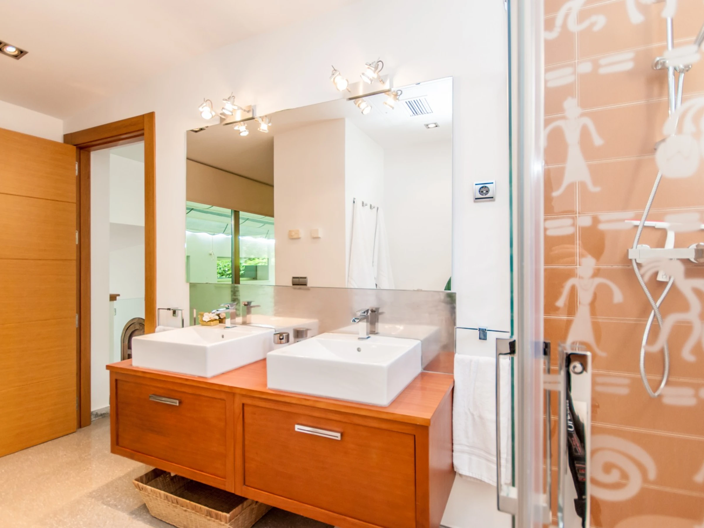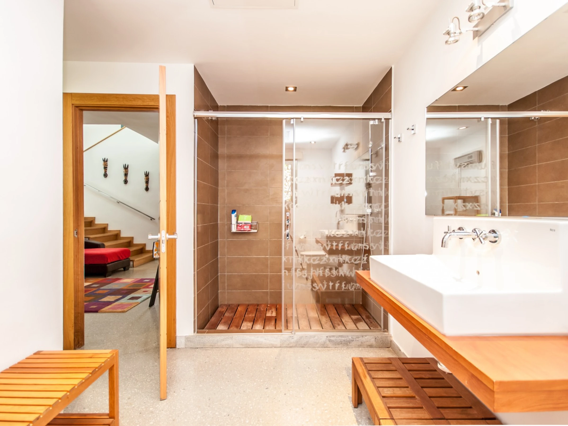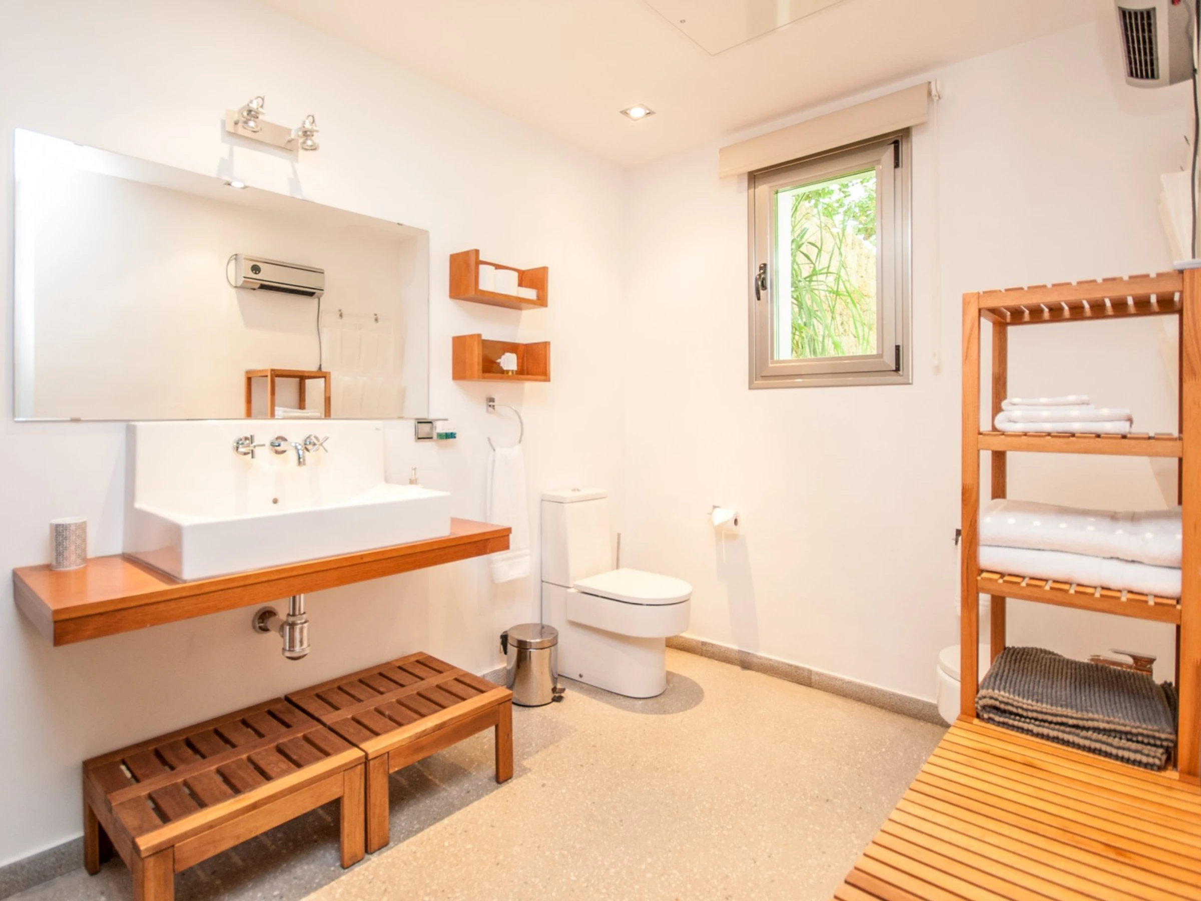 Con capacidad para 8 personas, la villa dispone de 3 habitaciones: dos dobles y una con dos camas nido, todas con baño en suite para máxima comodidad y privacidad. El interior destaca por un amplio salón comedor con grandes ventanales que permiten admirar las vistas, una cocina semi-independiente totalmente equipada para preparar deliciosas comidas, una sala de estar, una sala de lectura y un gimnasio con nevera y congelador adicionales 🛏️🍳📚🏋️♀️.