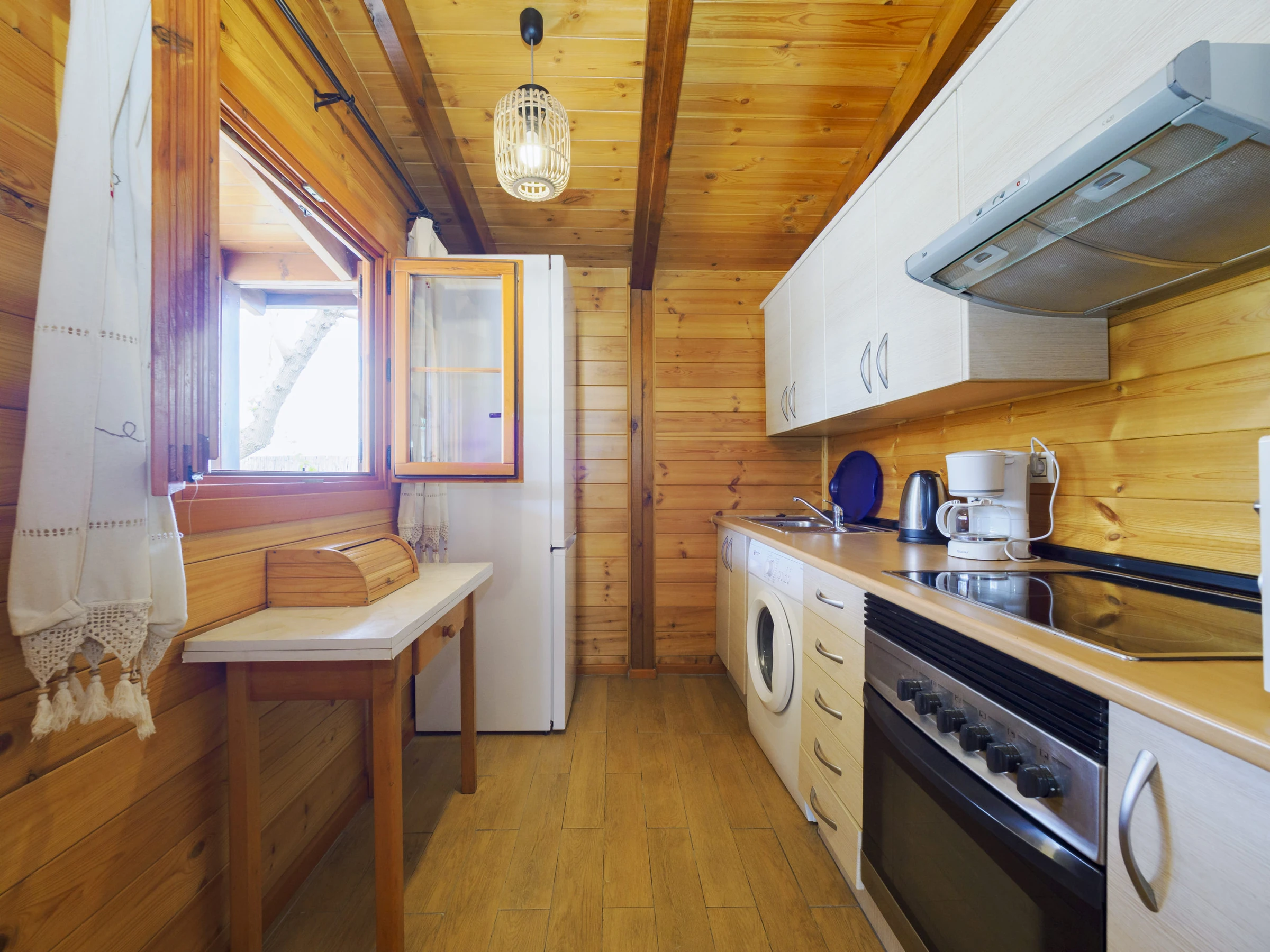 La casa principal tiene una terraza de 15 m² y una cocina independiente totalmente equipada para preparar tus platos favoritos. El salón es amplio y acogedor, ideal para momentos familiares inolvidables. Consta de dos habitaciones luminosas: una con cama de matrimonio y aire acondicionado, y otra con dos camas individuales. 🛏️❄️