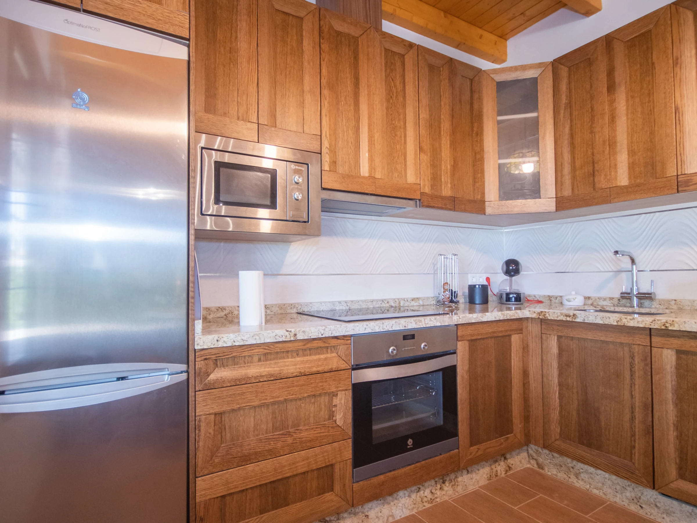 En el interior, el salón comedor y la cocina americana forman un espacio abierto y funcional. La cocina está equipada con horno y placa vitrocerámica para que prepares cualquier tipo de almuerzo o cena con total comodidad 🍳🍽️. El salón, con mesa familiar y un cómodo sofá, es el lugar perfecto para relajarte, ver la televisión o leer un buen libro 📺📚.