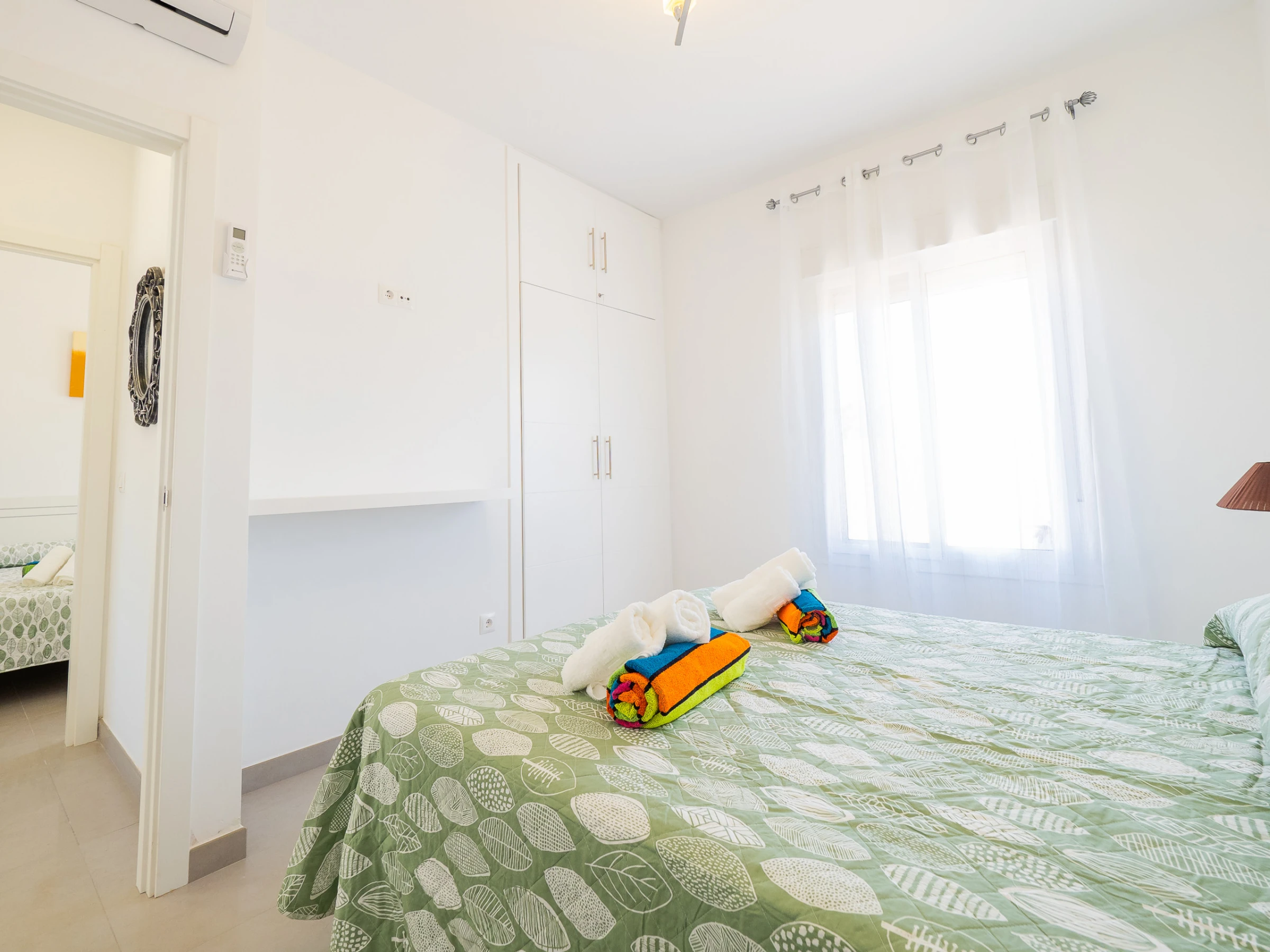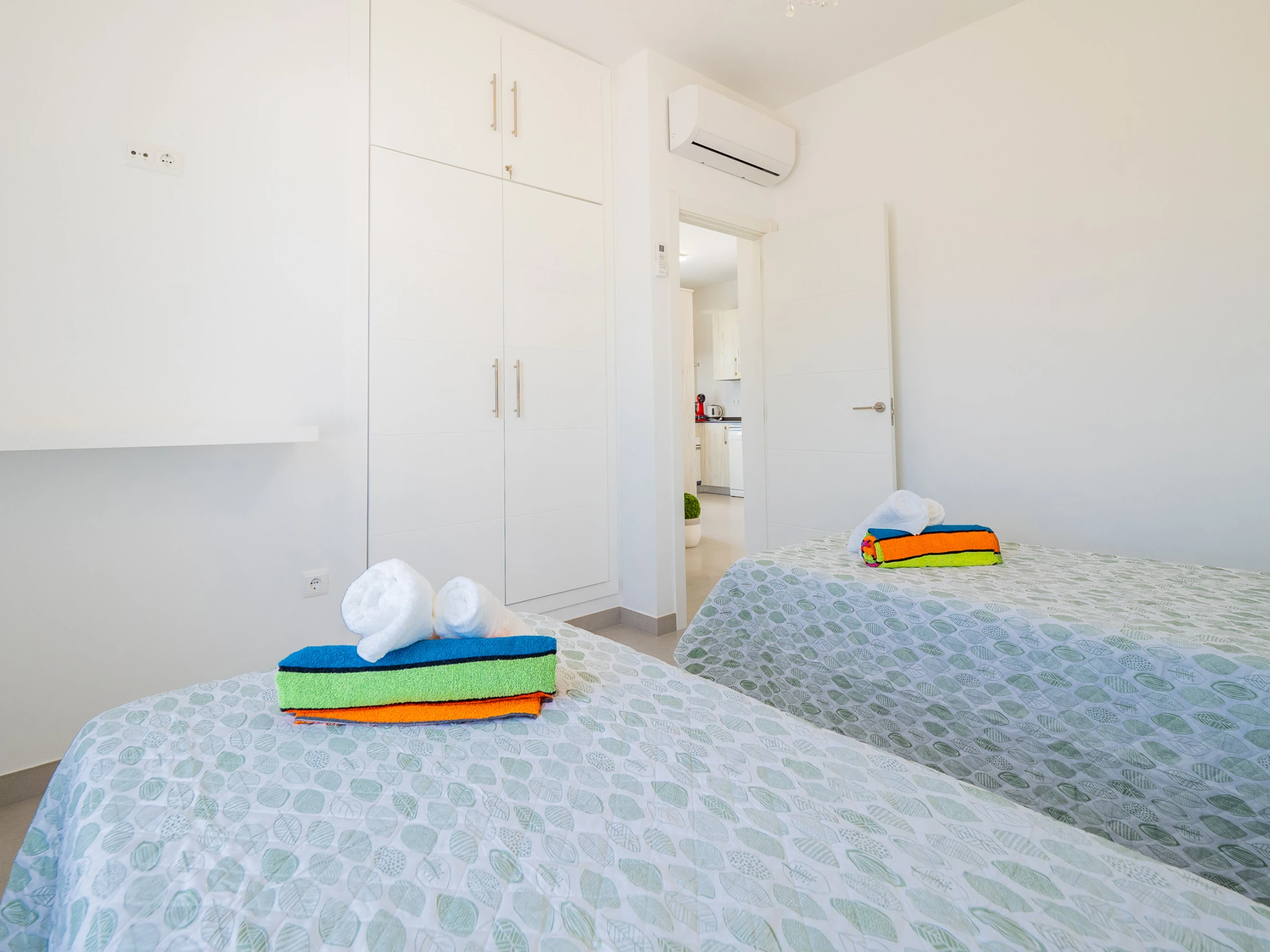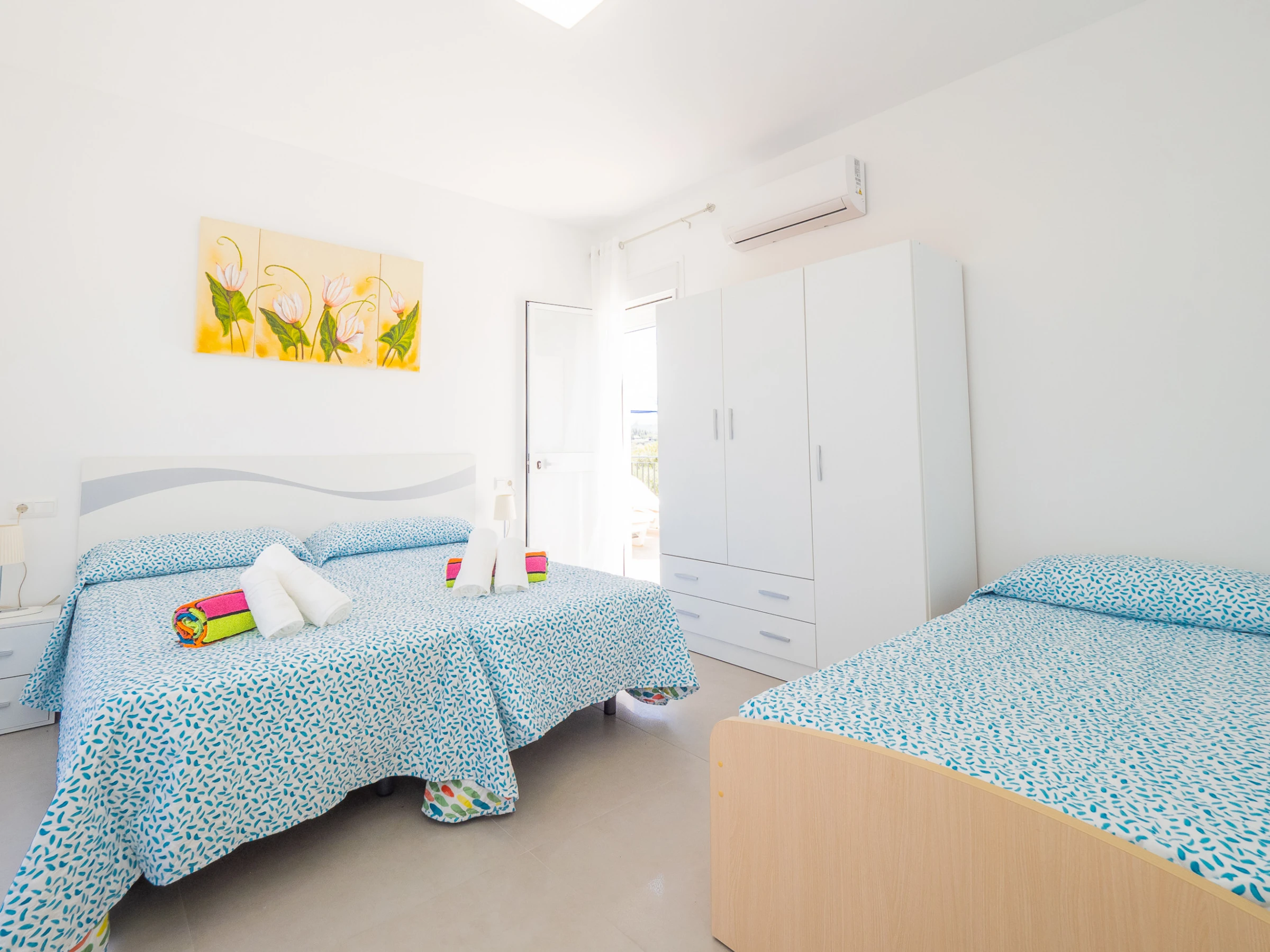 En la planta superior se encuentran dos dormitorios amplios y luminosos. Uno dispone de cama de matrimonio y una cama supletoria opcional, mientras que el otro tiene tres camas individuales y acceso a una terraza privada con mobiliario de exterior, perfecta para descansar y disfrutar de las vistas y el atardecer. Toda la villa cuenta con aire acondicionado con bomba de calor, asegurando confort en cualquier época del año.