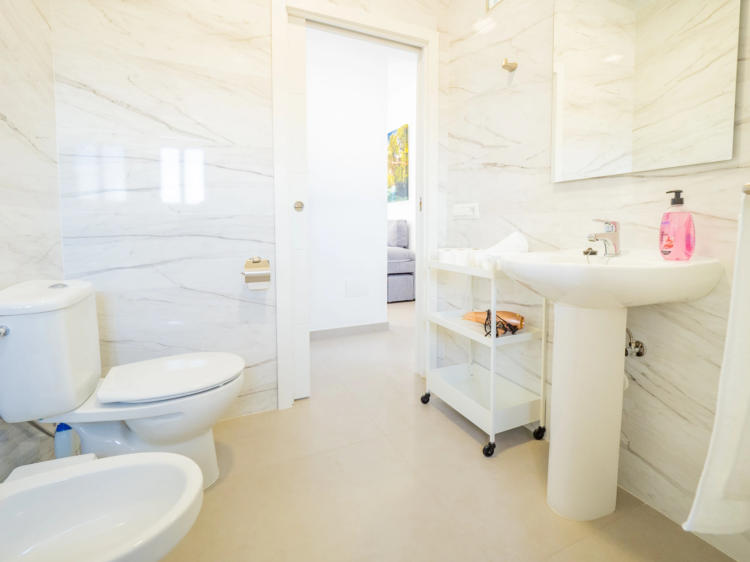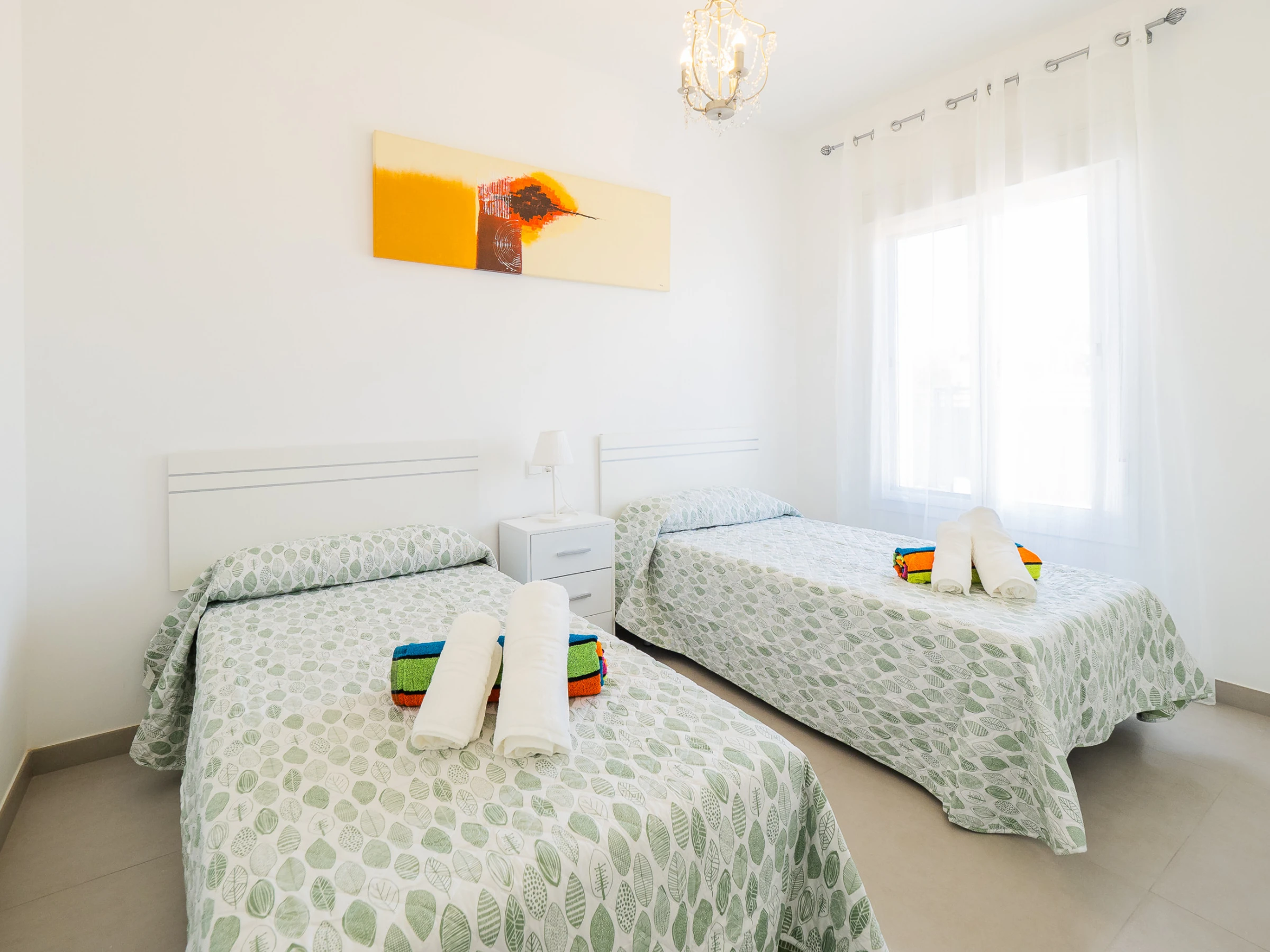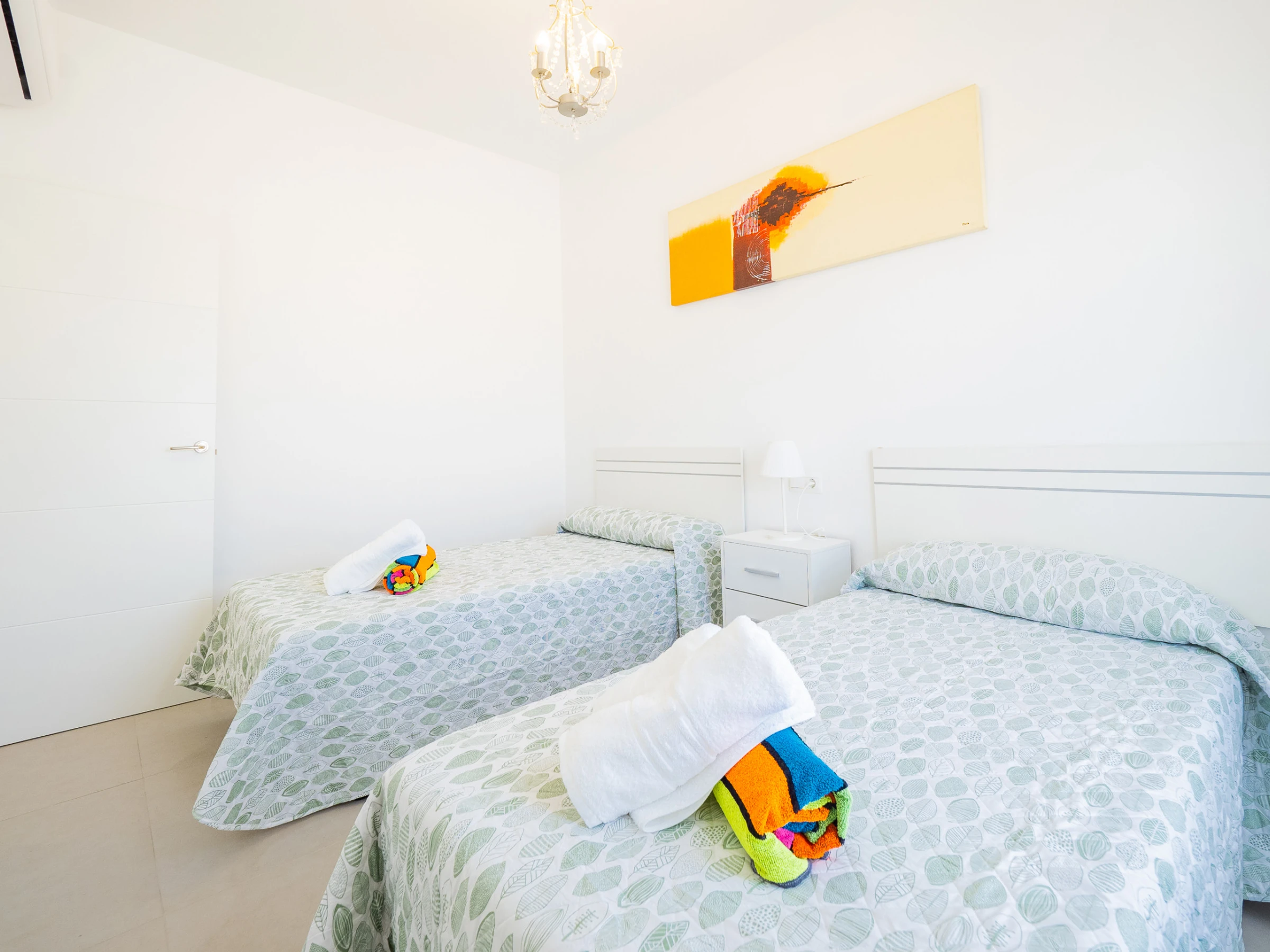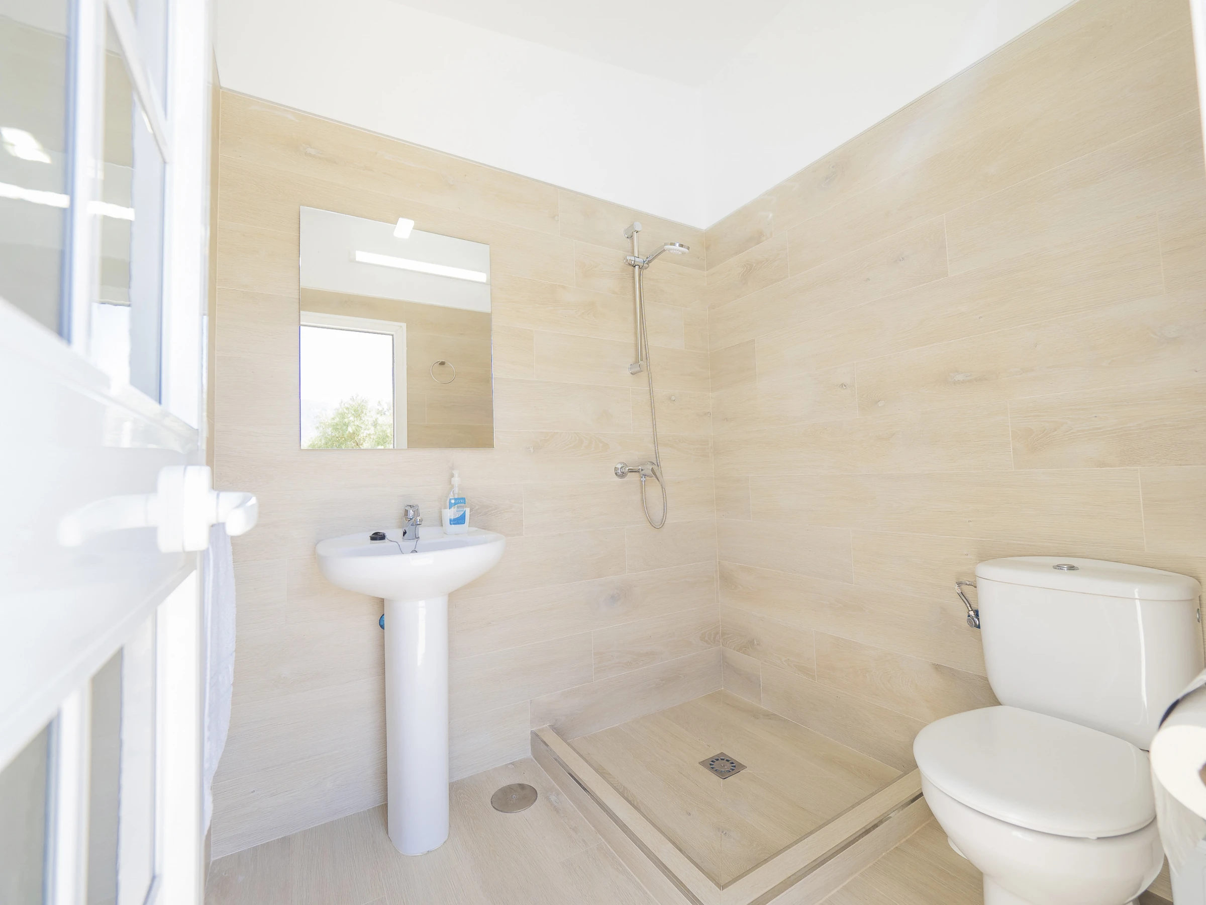En la planta superior se encuentran dos dormitorios amplios y luminosos. Uno dispone de cama de matrimonio y una cama supletoria opcional, mientras que el otro tiene tres camas individuales y acceso a una terraza privada con mobiliario de exterior, perfecta para descansar y disfrutar de las vistas y el atardecer. Toda la villa cuenta con aire acondicionado con bomba de calor, asegurando confort en cualquier época del año.