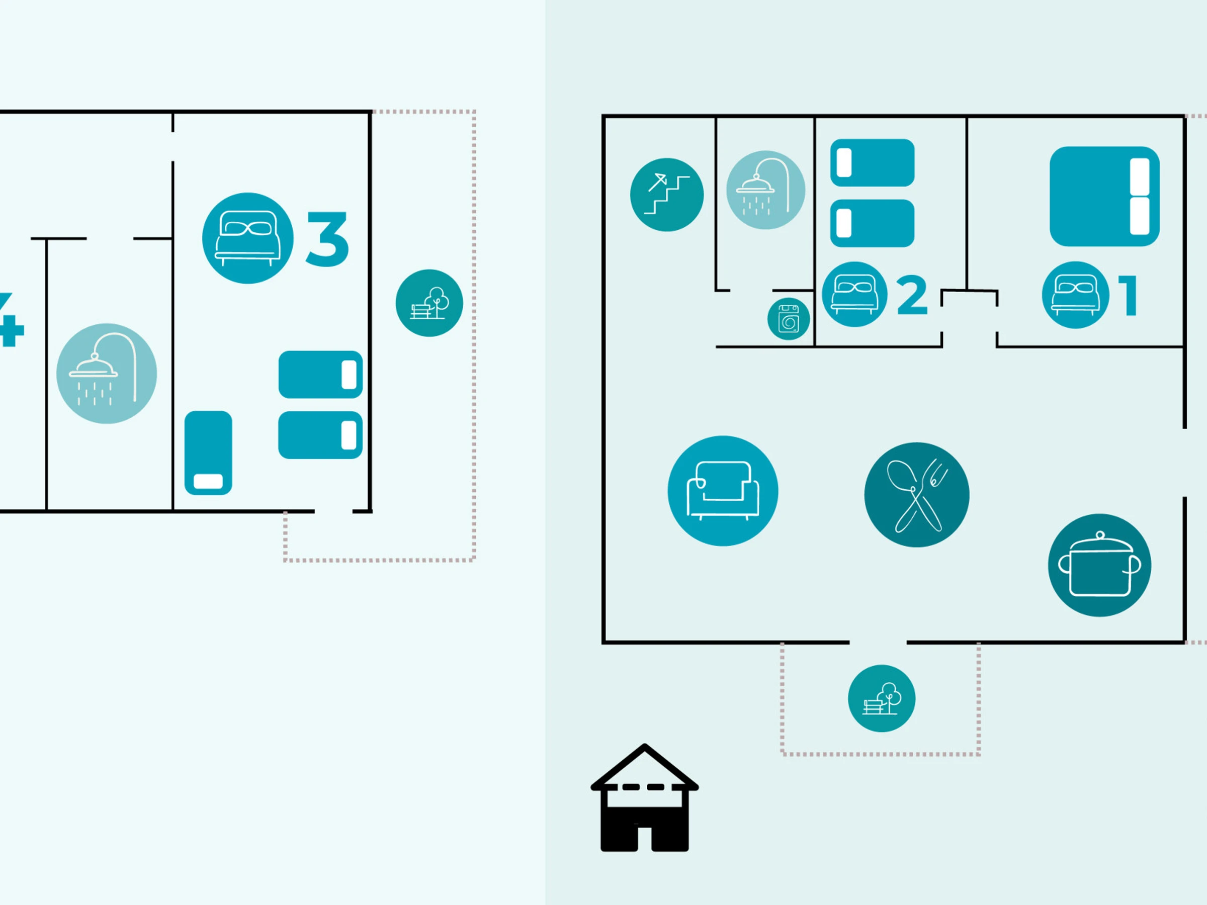 En esta planta también hay dos dormitorios que alojan cómodamente a cuatro personas, con una cama de matrimonio y dos camas individuales, además de un baño amplio con plato de ducha.