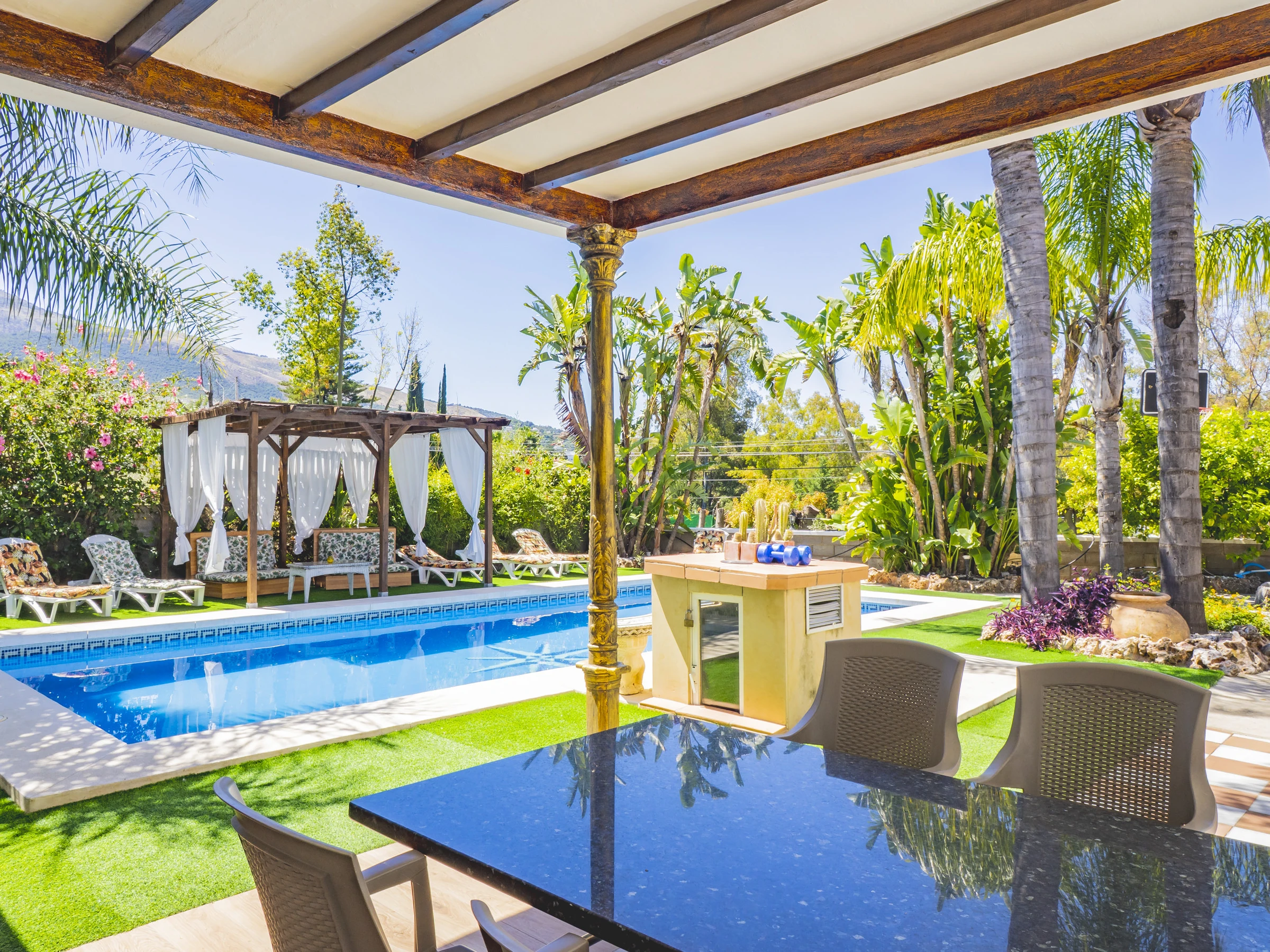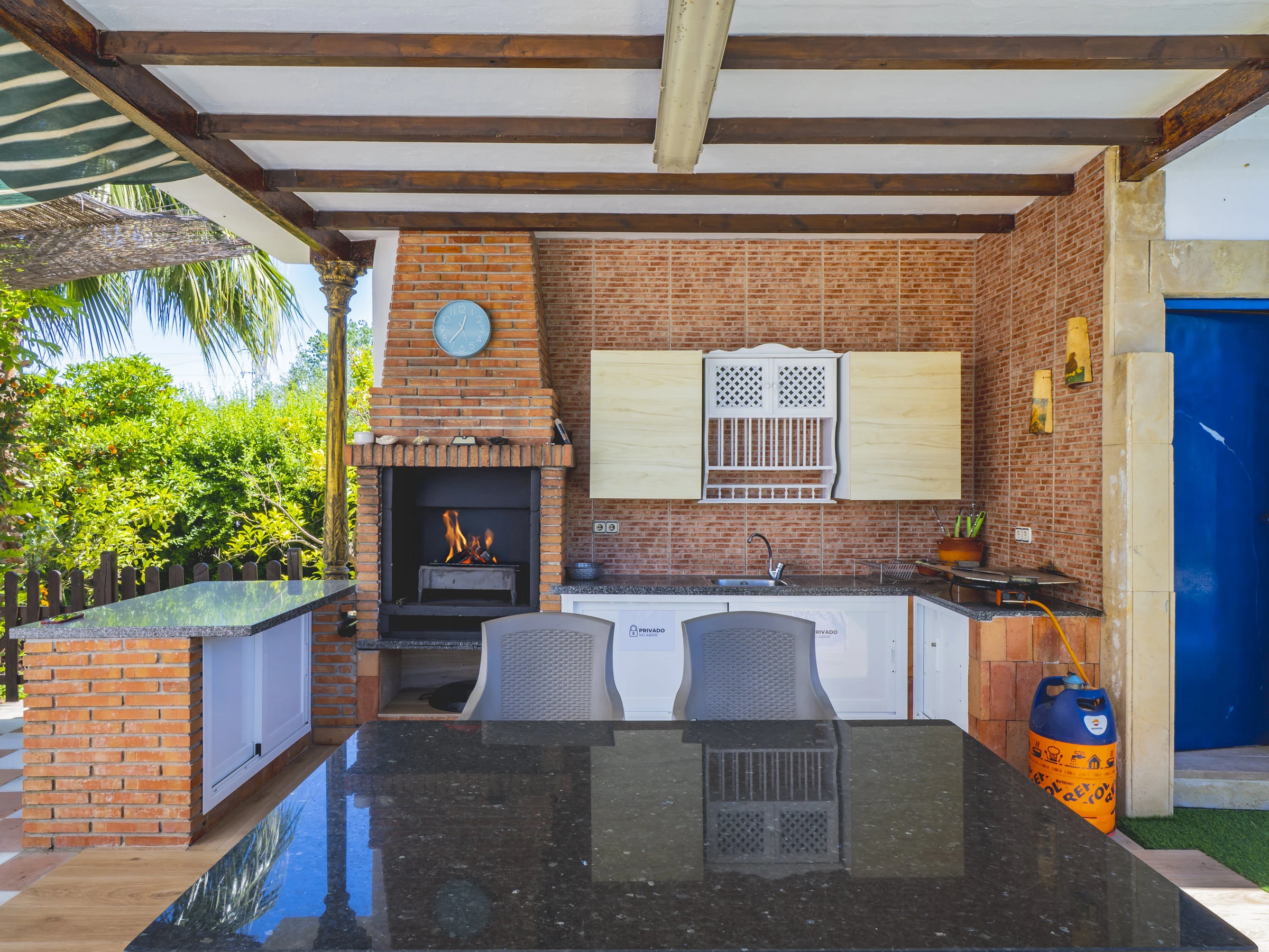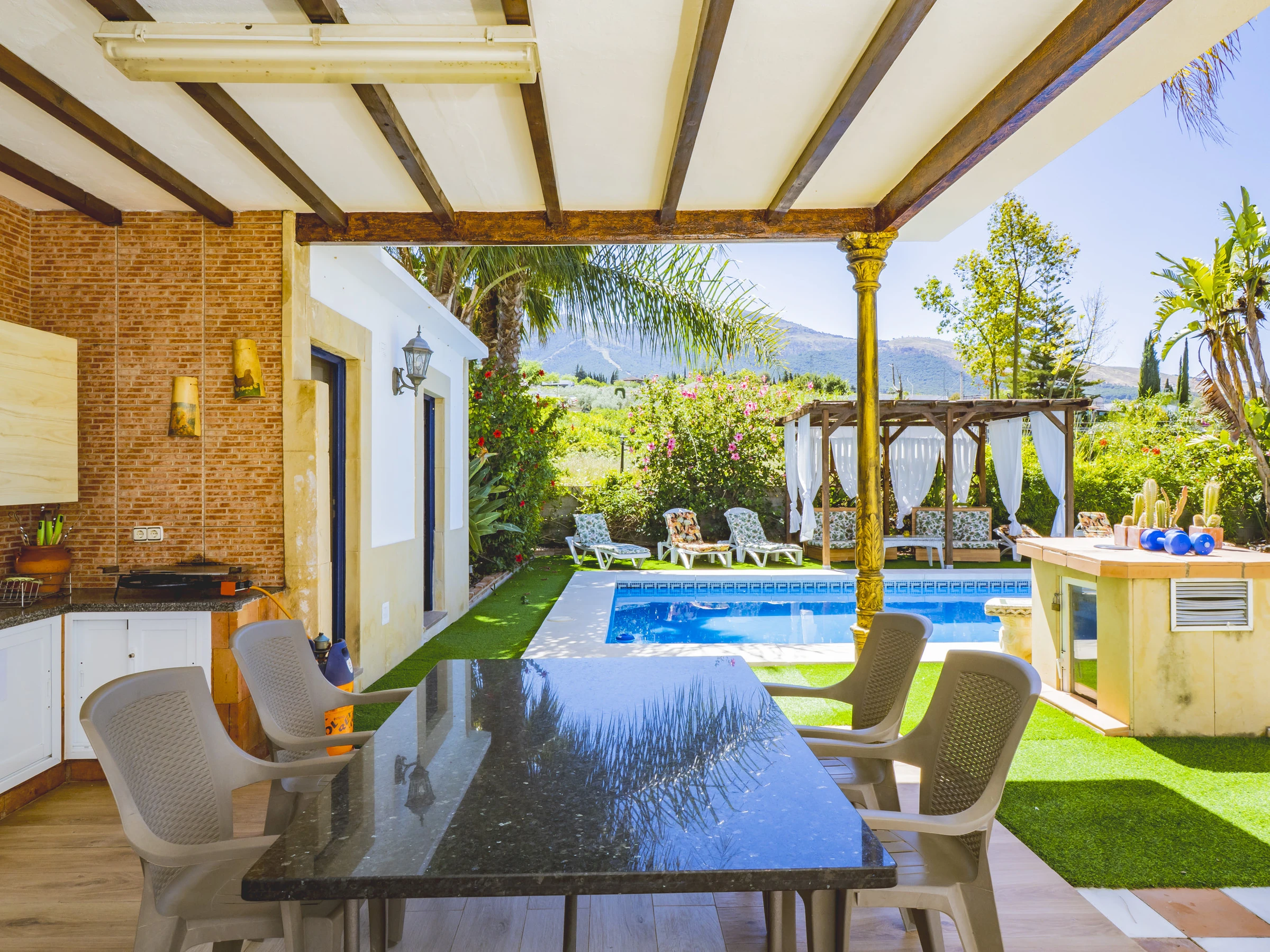 Los exteriores son un auténtico paraíso: una gran piscina ideal para refrescarse, zonas para tomar el sol en hamacas, un espacio sombreado para relajarte y un rosco de gas perfecto para preparar parrilladas o paellas. Además, contarás con un aseo con plato de ducha para mayor comodidad tras un baño. 🏊♂️🌿🔥