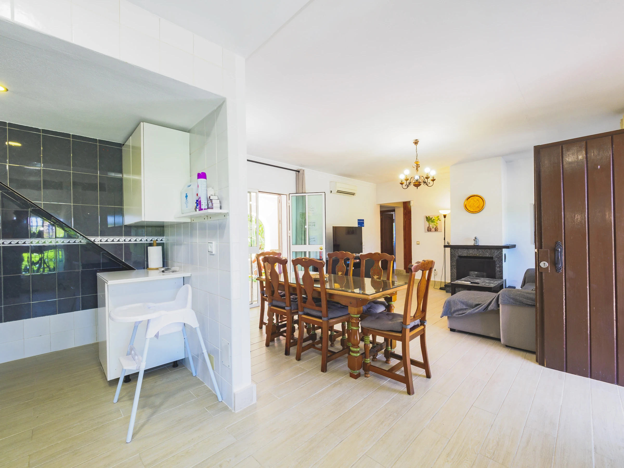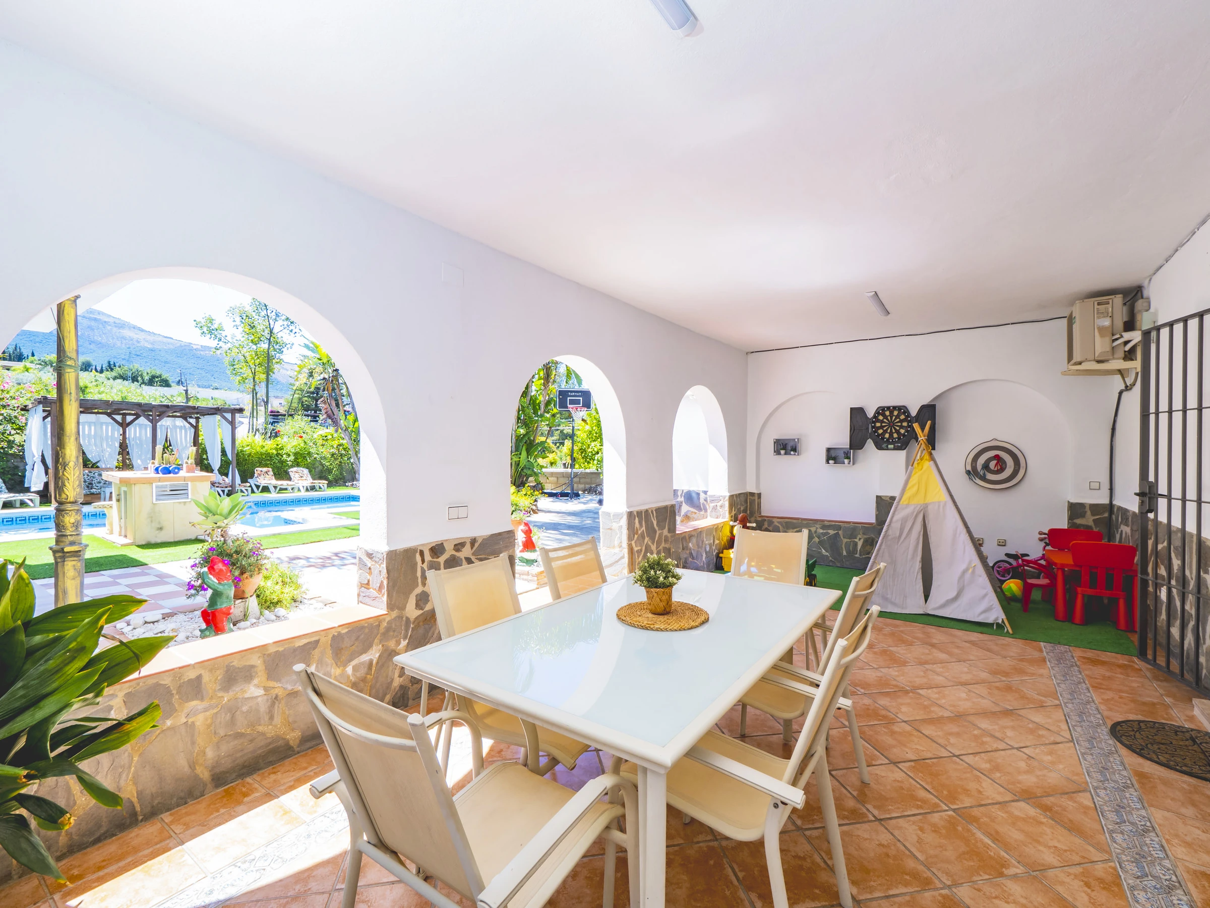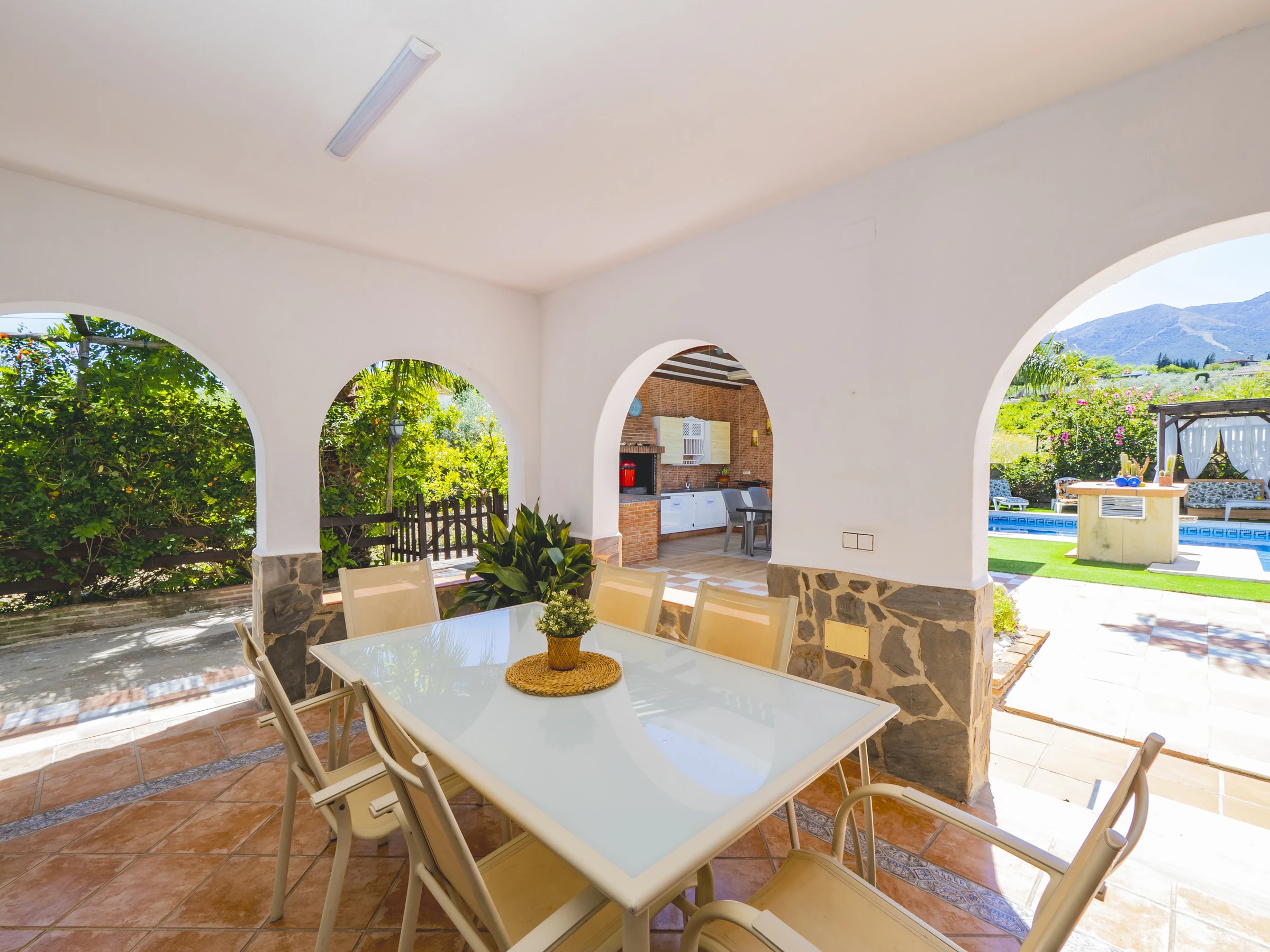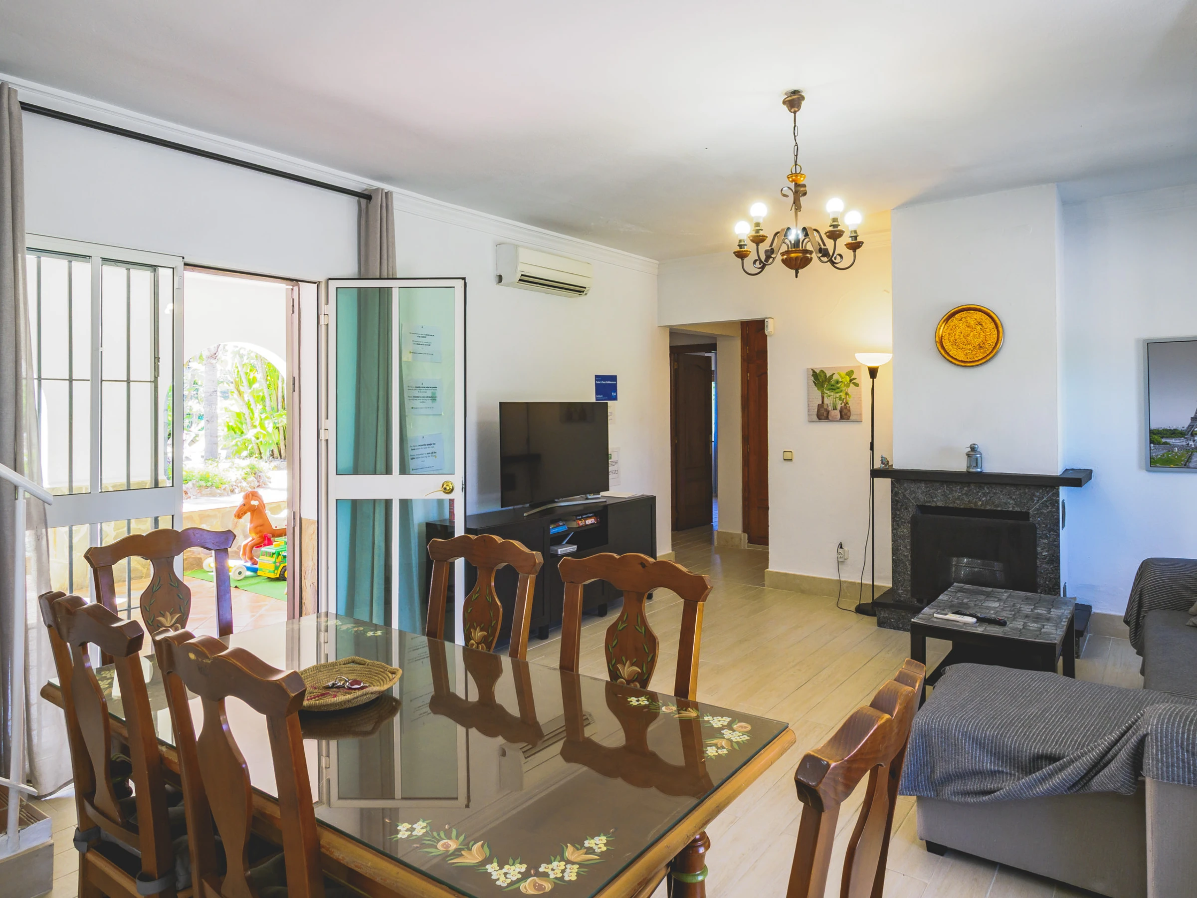 El acceso es cómodo y directo, con entradas por ambos lados de la casa que conectan con la gran piscina, zona de barbacoa y exteriores, o a través del salón comedor, el corazón del alojamiento junto a la amplia cocina independiente. Aquí podrás disfrutar de almuerzos tanto dentro como fuera, sin molestar a quienes prefieran descansar. 🍽️☀️
