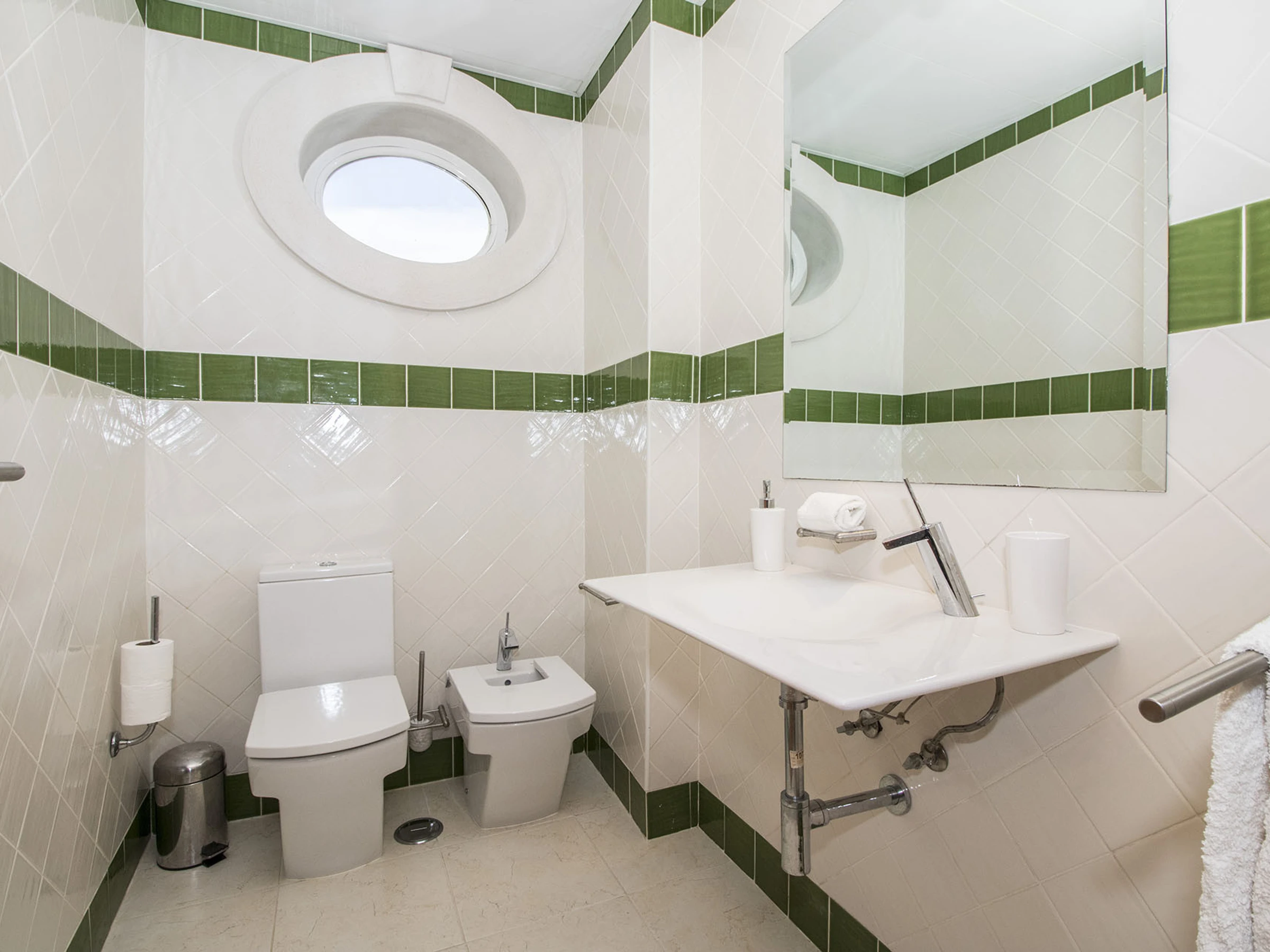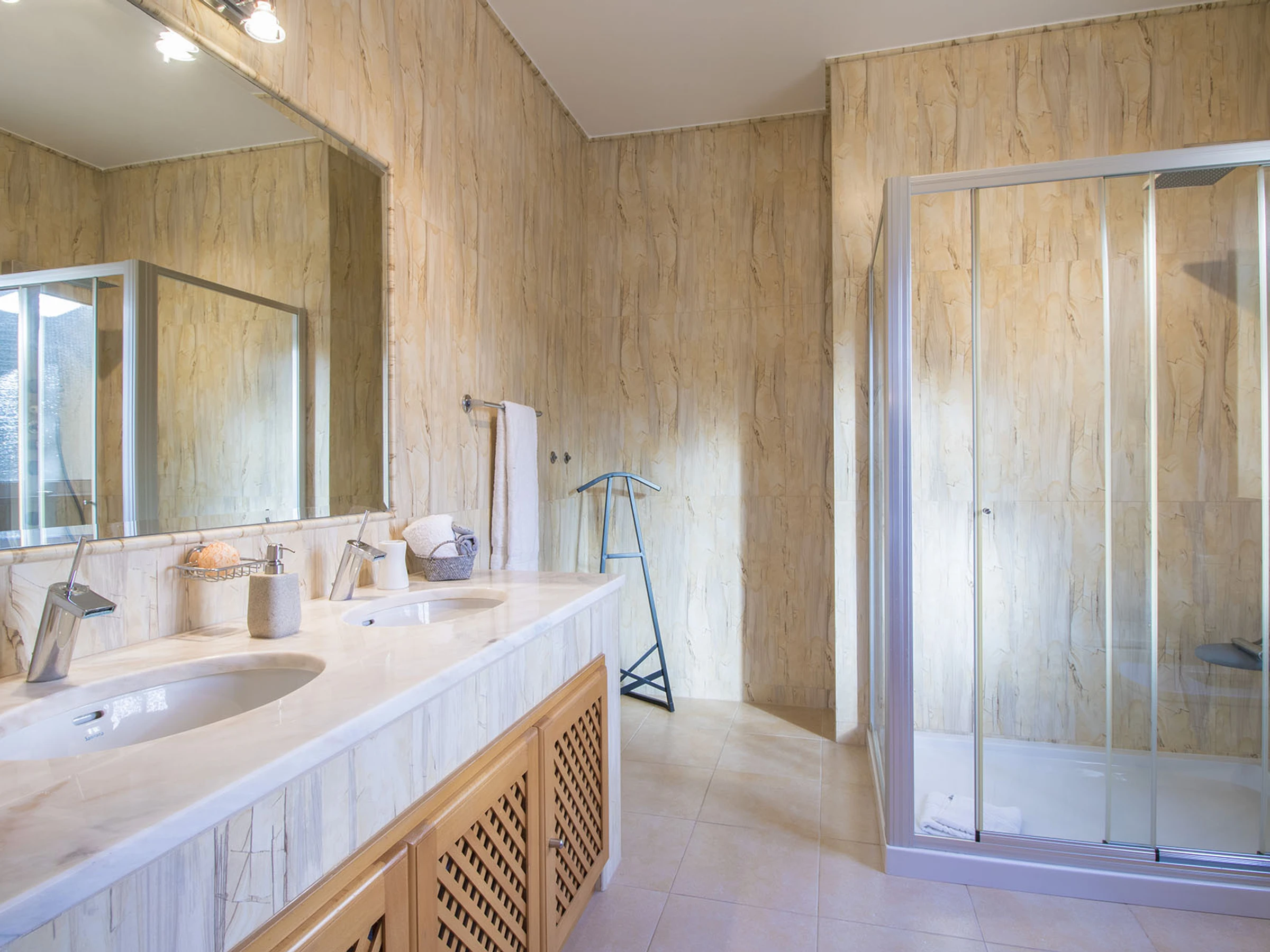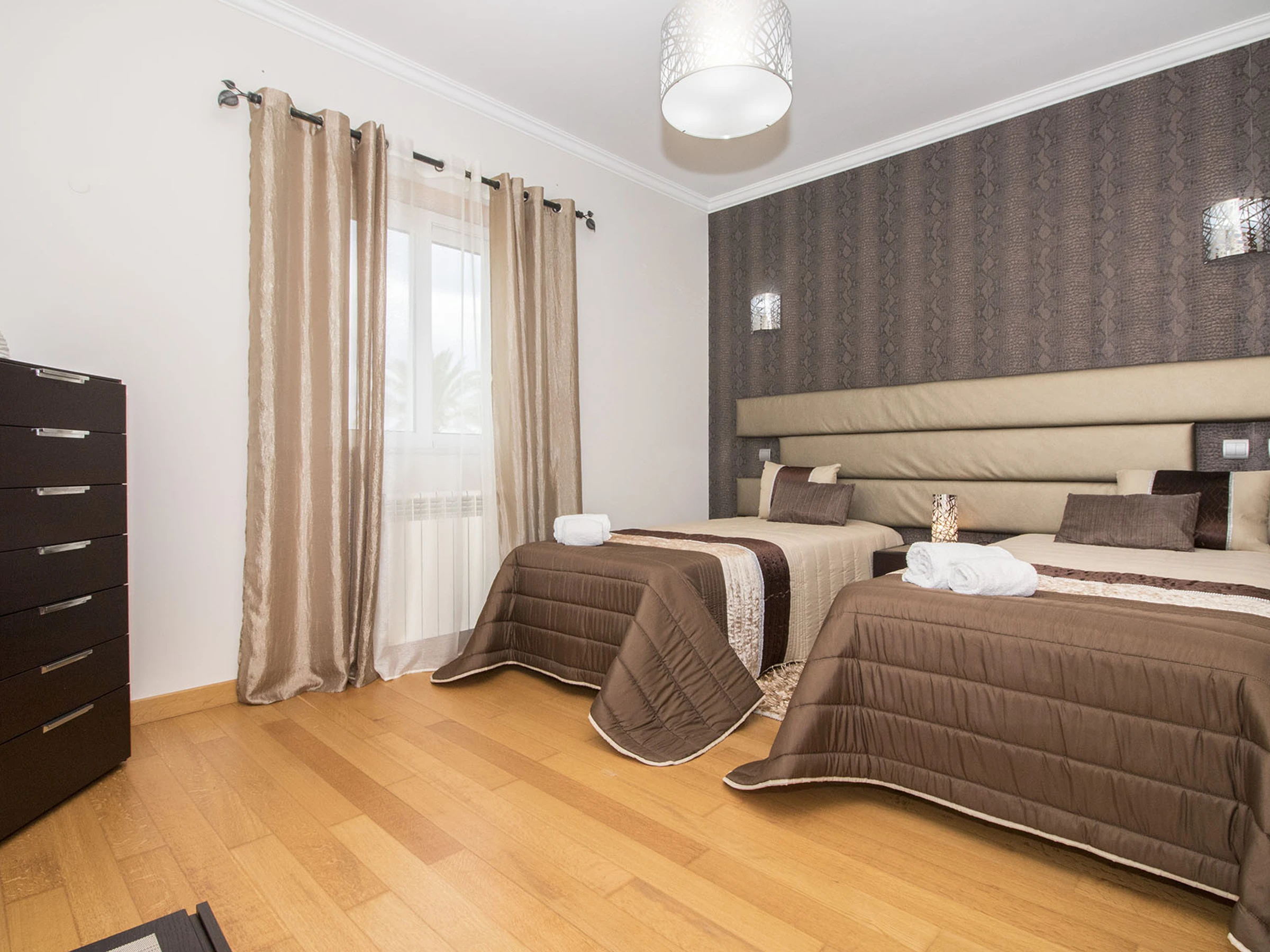 Pase a cinco amplias habitaciones con aire acondicionado y baño en suite distribuidas en dos plantas. Planta baja: doble con baño con bañera, twin con ducha de hidromasaje, ambas en tonos chic blanco/gris/negro. Primera planta: doble en blanco/oro, más dos twins (marrón/beige y blanco/burdeos) cada una con bañeras de hidromasaje; la habitación de tonos marrones tiene una pequeña terraza con vista al mar.