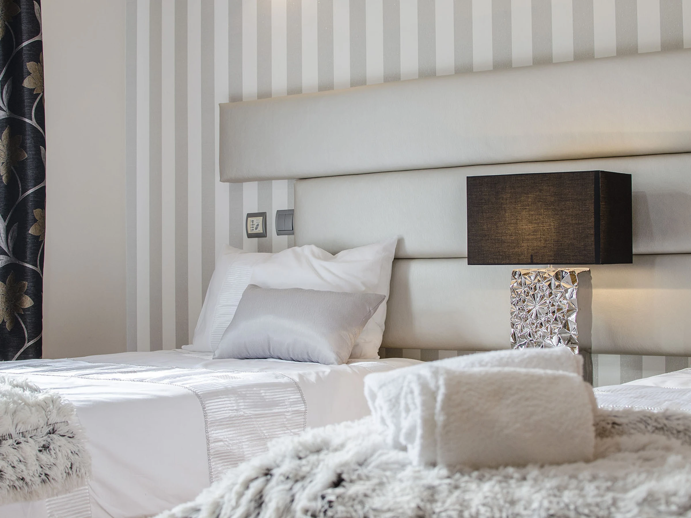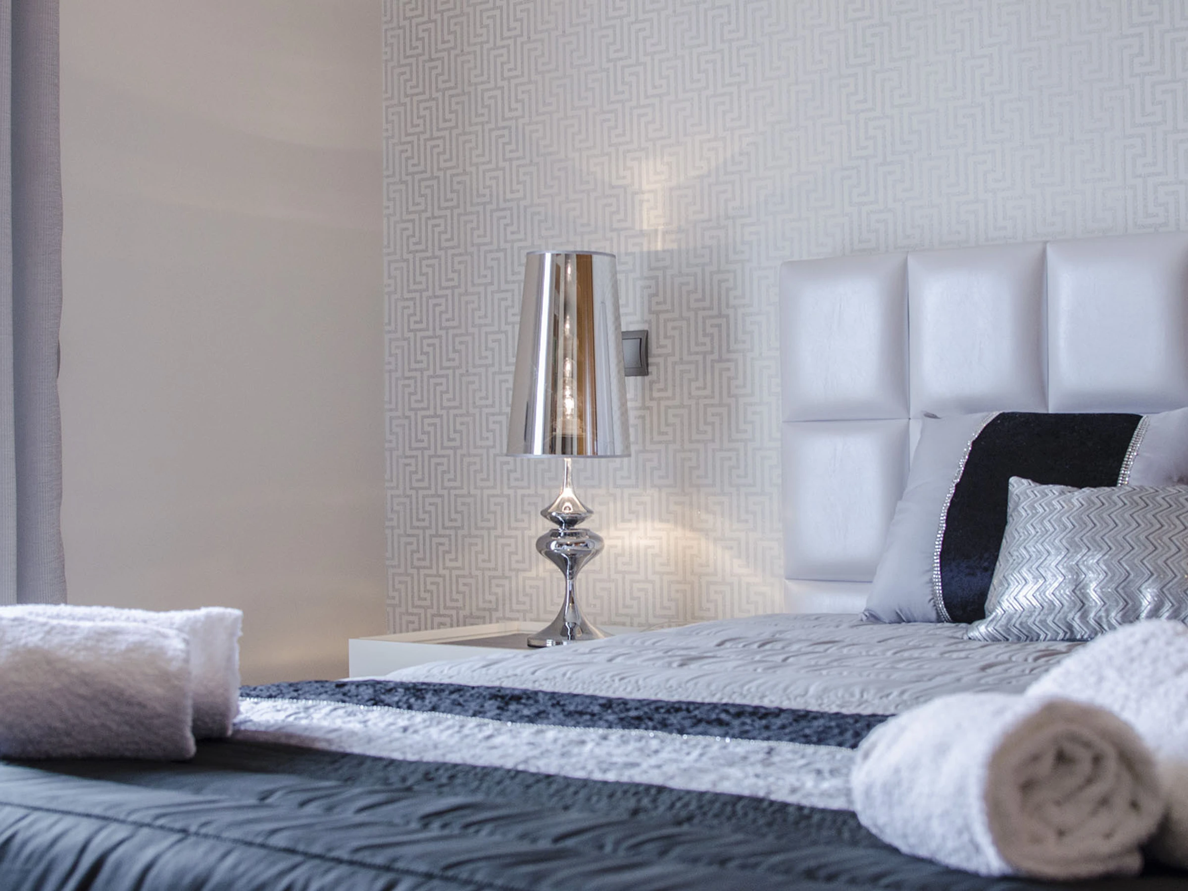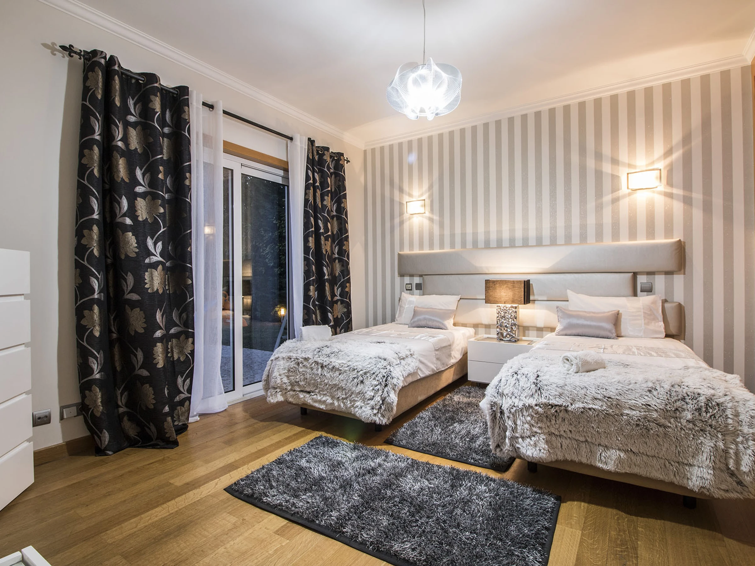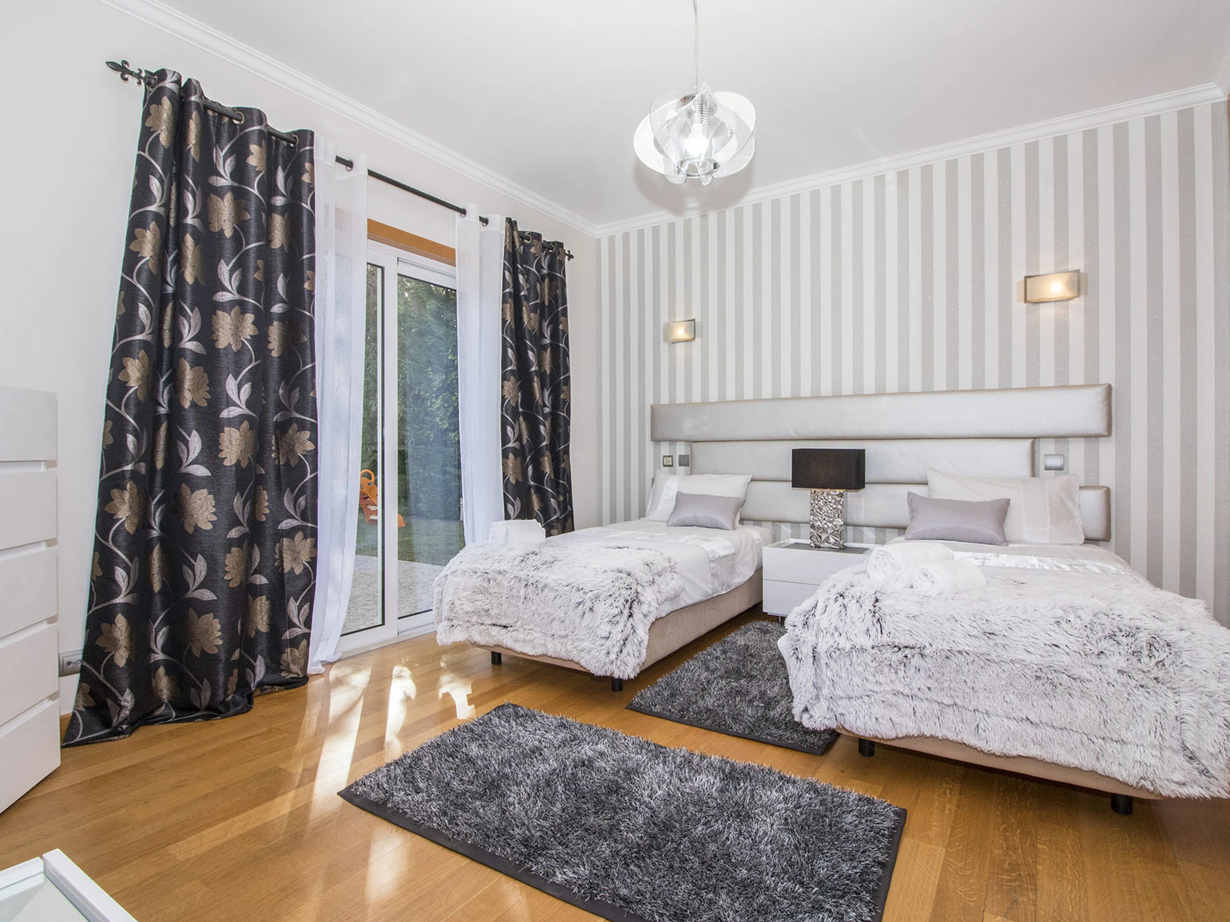 Pase a cinco amplias habitaciones con aire acondicionado y baño en suite distribuidas en dos plantas. Planta baja: doble con baño con bañera, twin con ducha de hidromasaje, ambas en tonos chic blanco/gris/negro. Primera planta: doble en blanco/oro, más dos twins (marrón/beige y blanco/burdeos) cada una con bañeras de hidromasaje; la habitación de tonos marrones tiene una pequeña terraza con vista al mar.