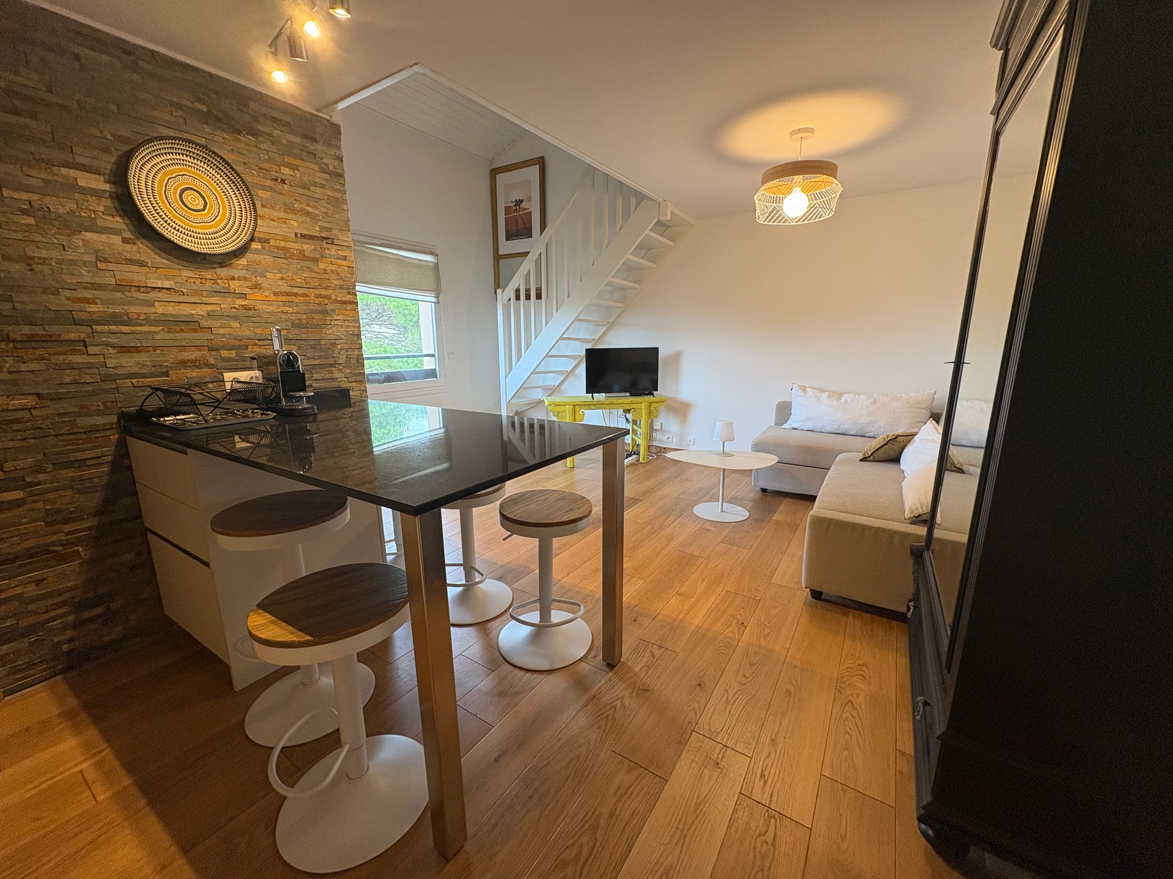 Encantador apartamento de 49 m² con un dormitorio, situado en Anglet, a solo 2 minutos a pie de las playas. En la segunda planta, con ascensor, este luminoso y funcional apartamento consta de un agradable salón, una cocina totalmente equipada, un dormitorio tipo altillo, un moderno cuarto de baño con ducha y un aseo independiente, todo diseñado para una estancia confortable.