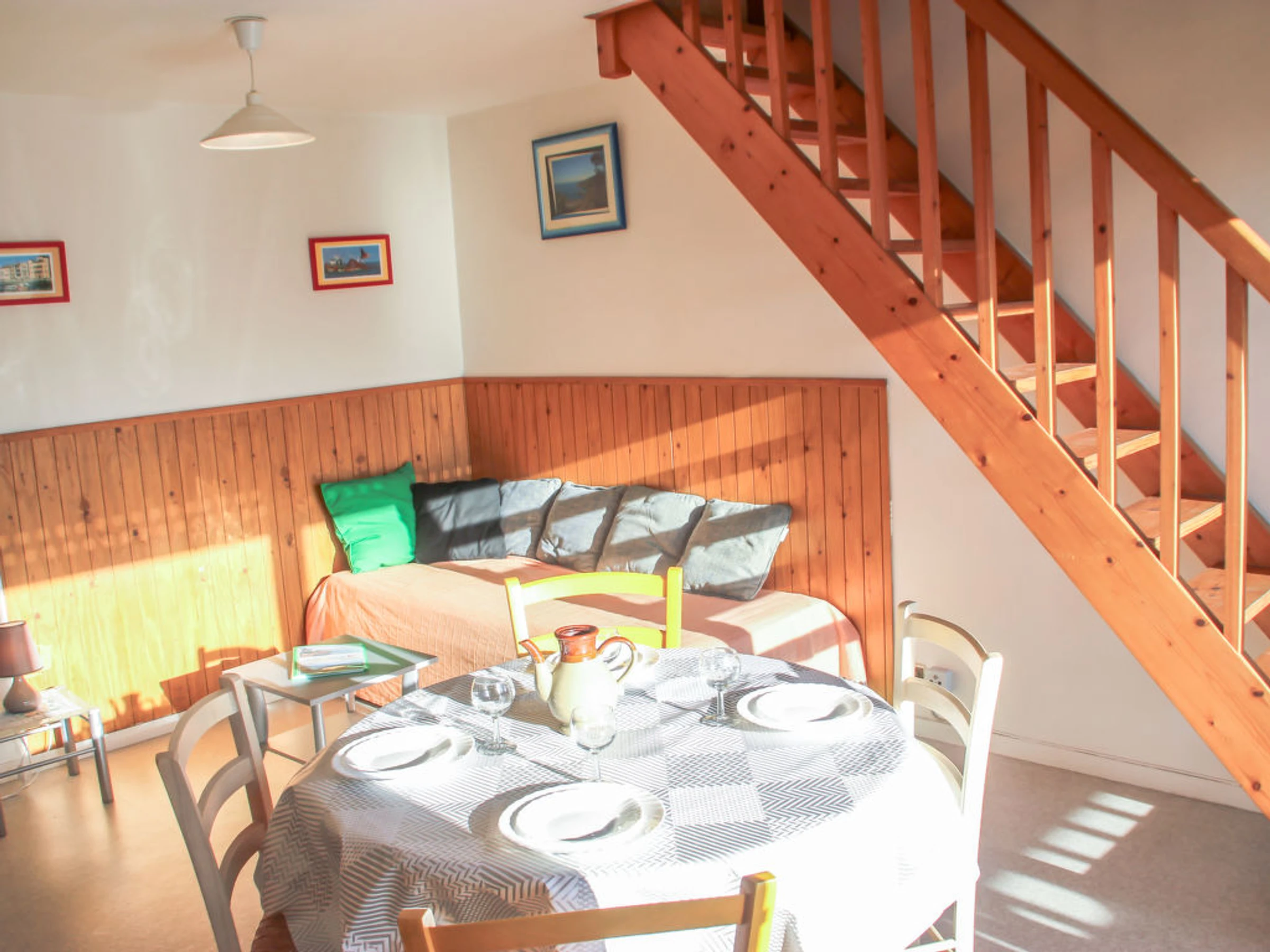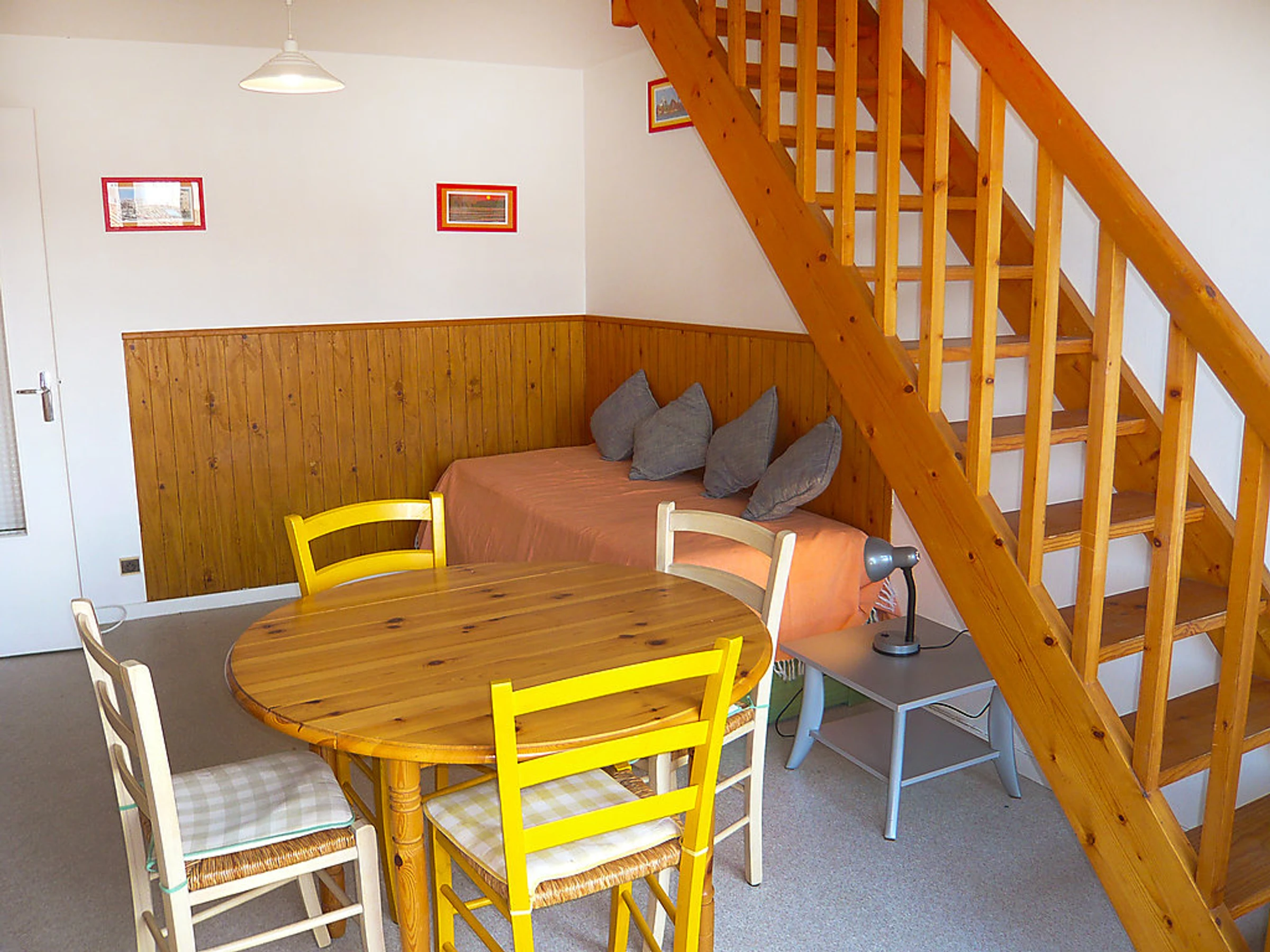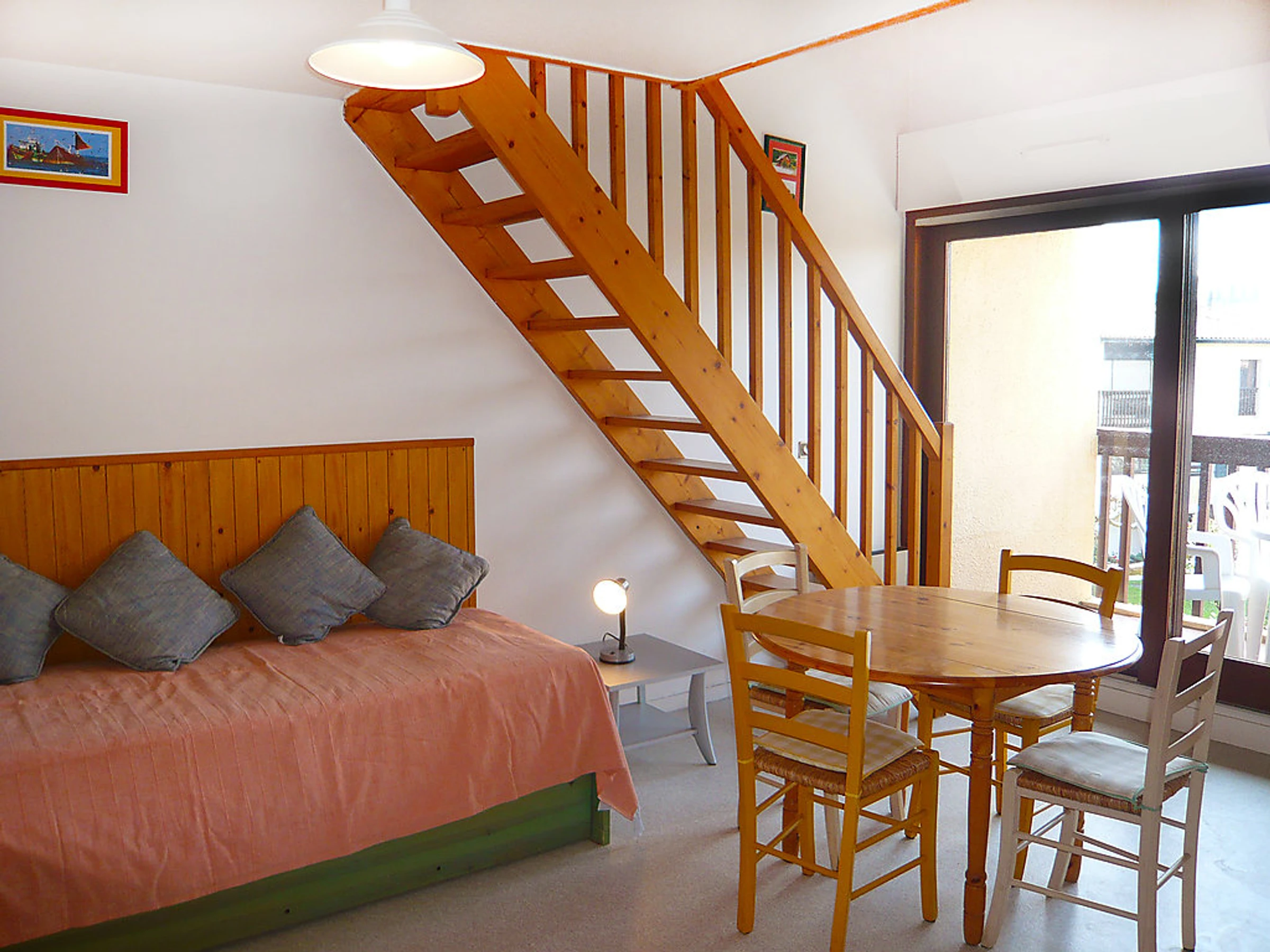 Estudio 52 m2 en 2 plantas en el 2° piso. Salón-comedor con 2 camas (90 cm), TV. Salida a la terraza. Pequeña cocina (2 fogones, horno pequeño, cafetera eléctrica). WC separado. Planta superior: altillo con 1 cama de matrimonio (1 x 140 cm). Baño. Calefacción eléctrica. Terraza 8 m2. Muebles de terraza. El alojamiento dispone de: plancha. Internet (Wifi, extra). Incluye: Limpieza final, ERV assurance annulation gratuite Disponible en el sitio con suplement,o: Toallas (primer juego) 4.0EUR por persona, Cama para niños (hasta 2 años) 3.0EUR por día, Carrito de bebe 3.0EUR por día, Asiento para bebé (para niños) 3.0EUR por día, Ropa de cama (primer juego) 8.0EUR por persona, WIFI ( conexión 3/4G para máx. 10 dispositivos – limite 1 GB por dia) 5.6EUR por día Servicios extras obligatorios en el sitio: Tasa local de niños (por persona/día), Tasa local de bebés (0-2) (por persona/día), Póliza de turismo 0.55EUR por persona/día