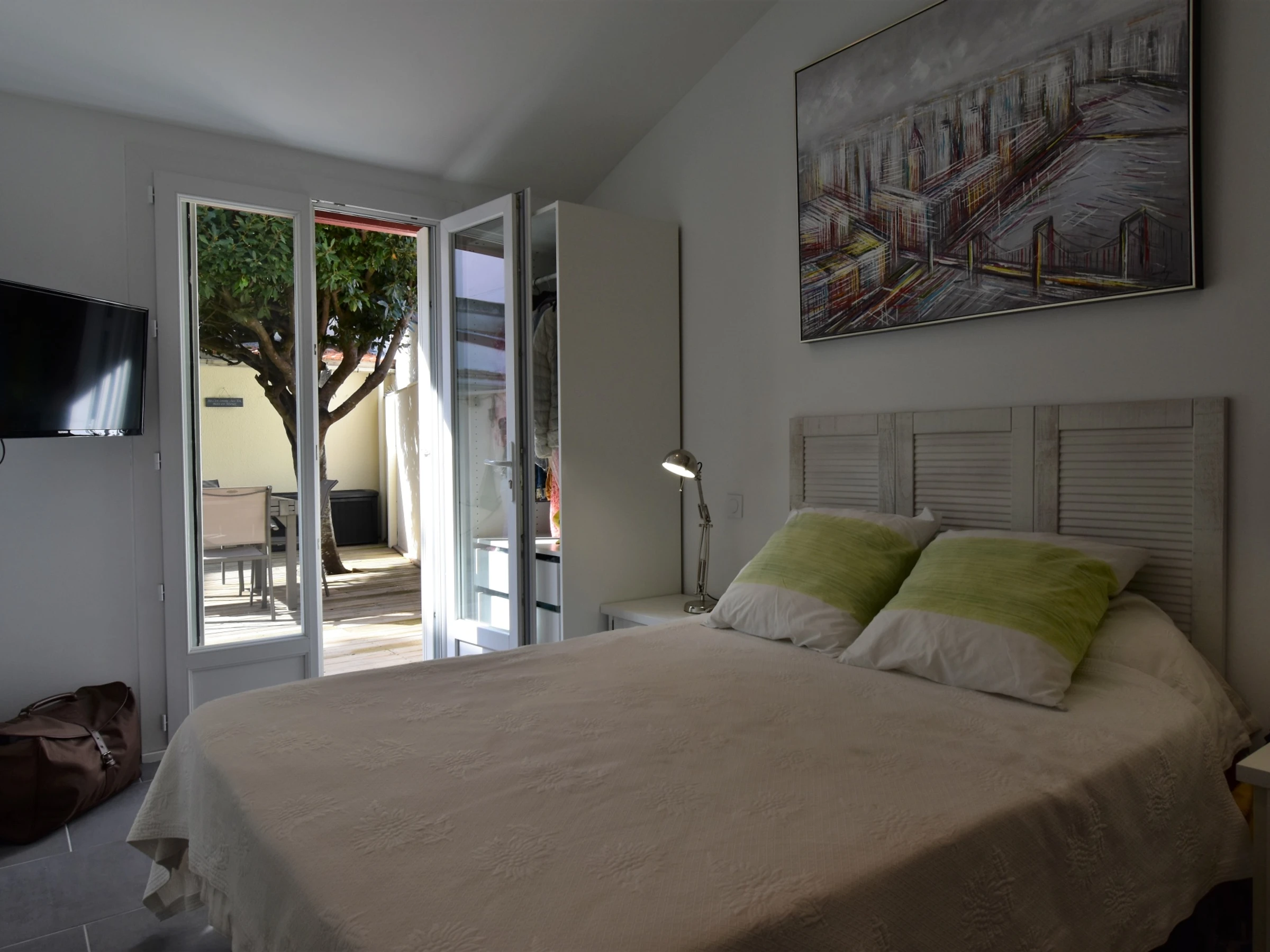 -un dormitorio (cama de 140X190 cm/TV/trastero) en la terraza orientada al oeste (muebles de jardín/mesa grande para almorzar y cenar al sol)