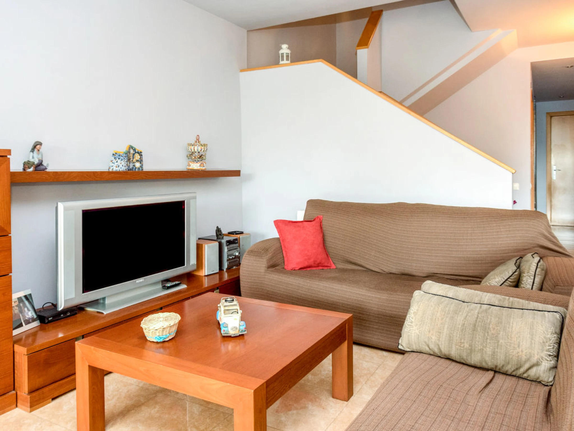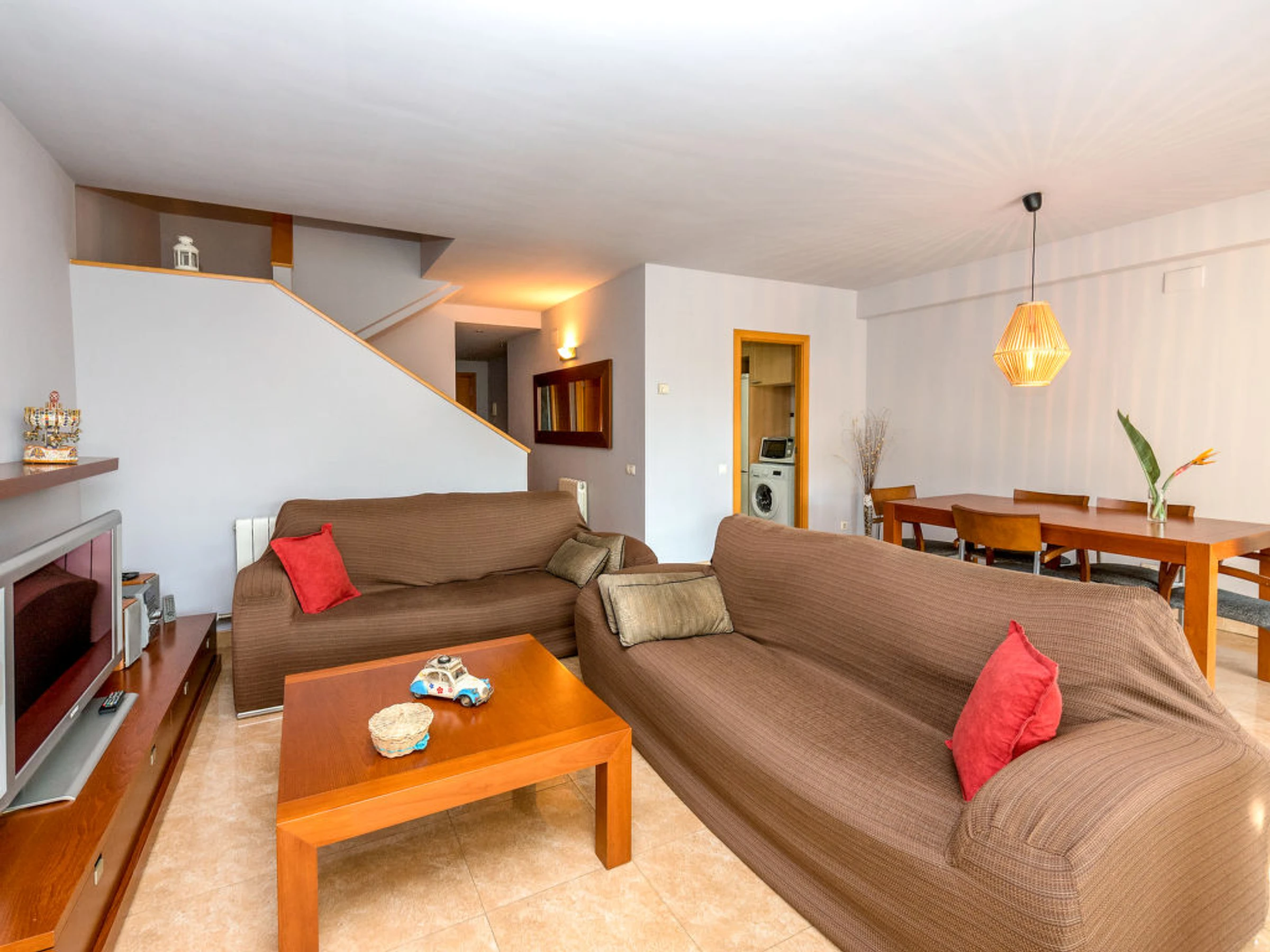 Casa adosada 4 estancias 125 m2. Luminoso, con mobiliario funcional: salón-comedor con TV. Salida a la terraza. Cocina (horno, lavavajillas, 4 placas de vitrocerámica, microondas, congelador, cafetera eléctrica). WC separado. Calefacción. Planta superior: 1 dorm. con 1 cama de matrimonio y baño/bidet/WC. Salida al balcón. 1 dorm. con 1 cama de matrimonio. 1 dorm. con 1 cama de matrimonio. Baño/bidet/WC. Terraza grande. Muebles de terraza, barbacoa. Vista a la localidad. El alojamiento dispone de: lavadora. Internet (Wifi). Adecuado para familias. [hidden]